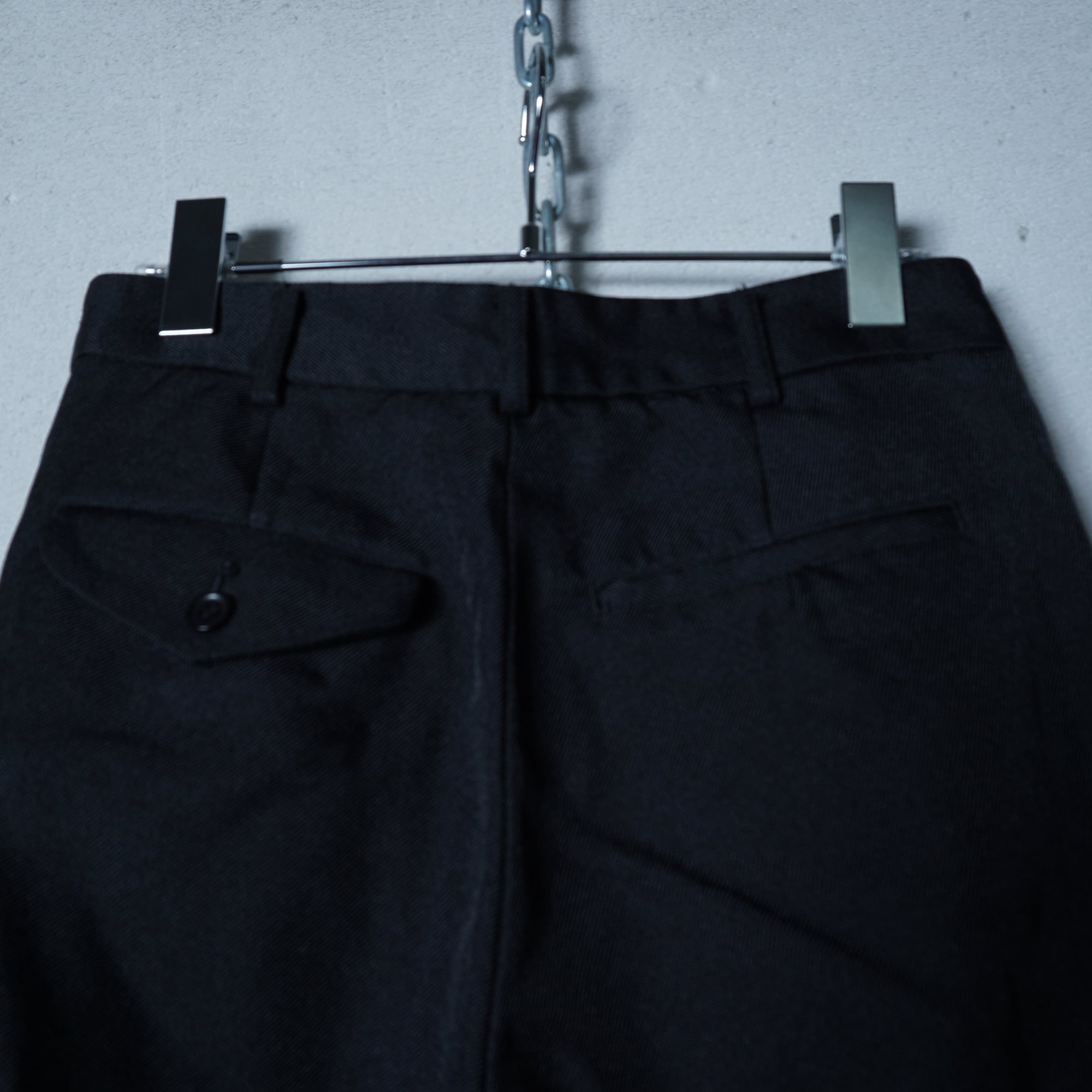 特に注目すべきは、パンツの裾部分に施されたバックルディテール。この装飾が独特のアクセントとなり、スタイリッシュで個性的な印象を与えます。バックルは機能性だけでなく、デザイン性をも高め、まるでアート作品のように仕上がっています。また、コムデギャルソンらしいエッジの効いたデザインが、日常のコーディネートにモードな雰囲気をプラス。ファッションにこだわりを持つ方にとって、他にはない特別な一着です。