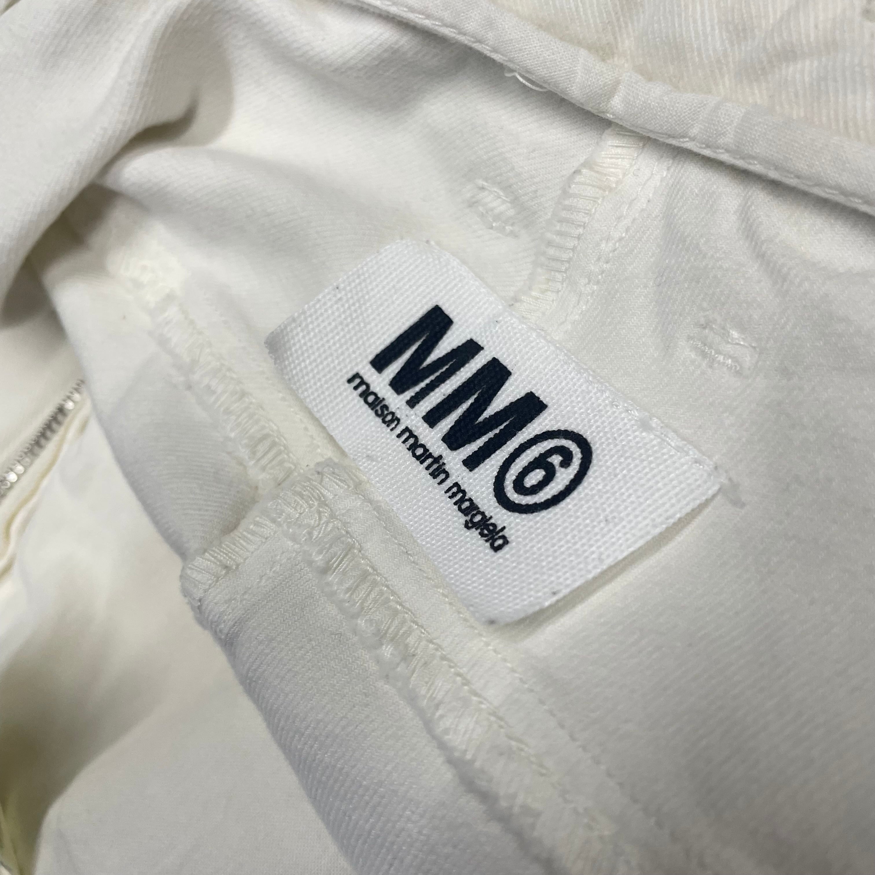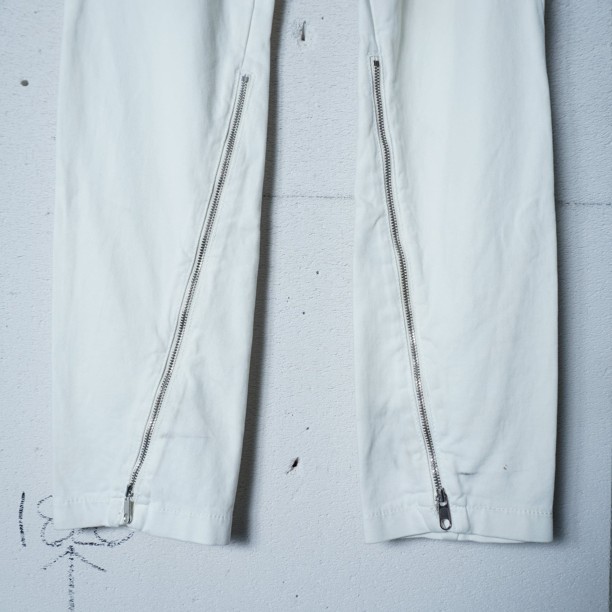 このジッパーは装飾的な役割もありますが、着脱時にパンツを大きく開くことができます。裾にかけては細めのテーパードラインで、ジッパー付近は更に絞られたつくりとなっています。