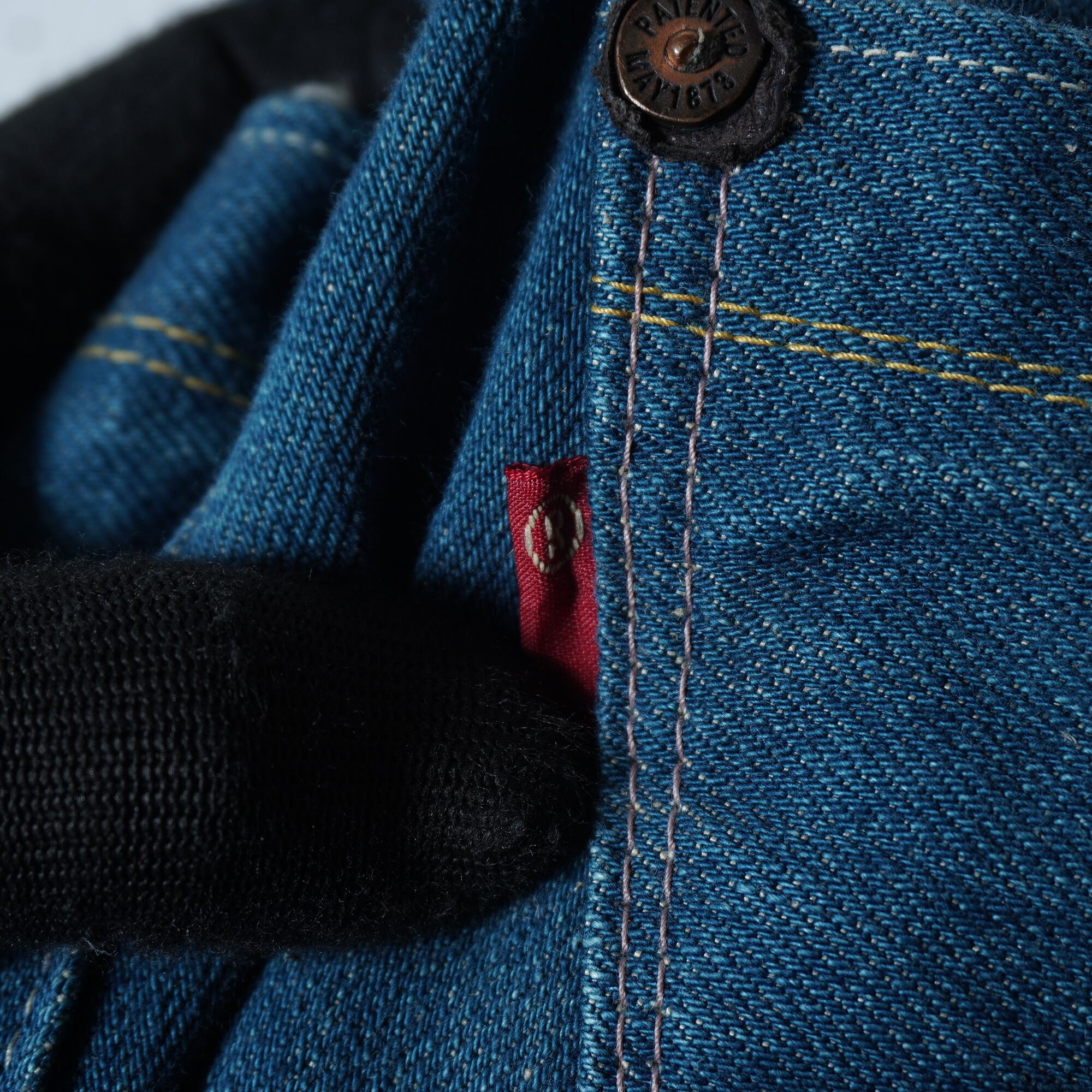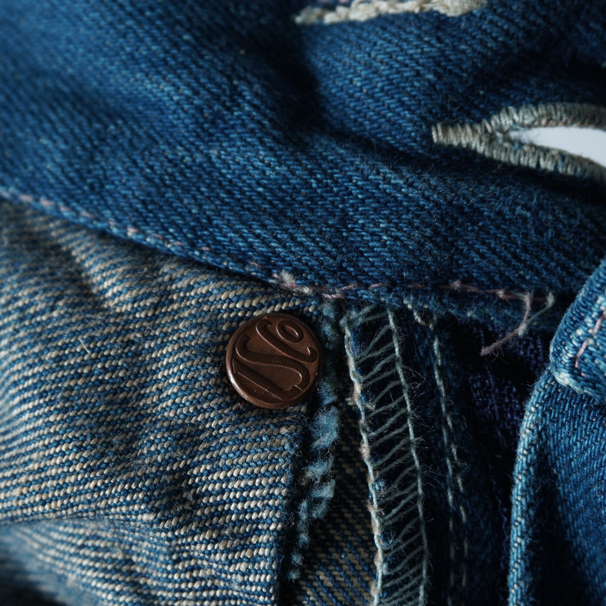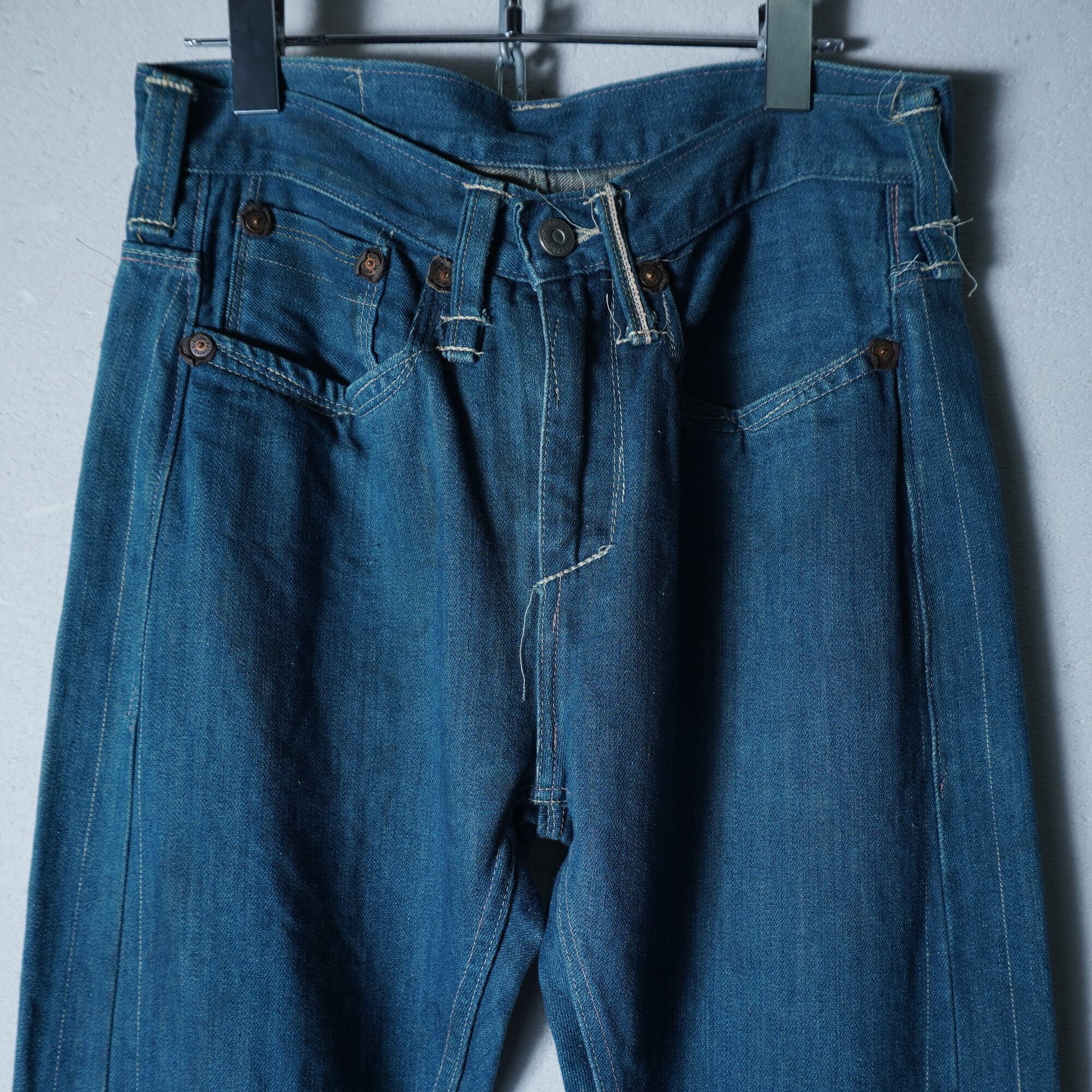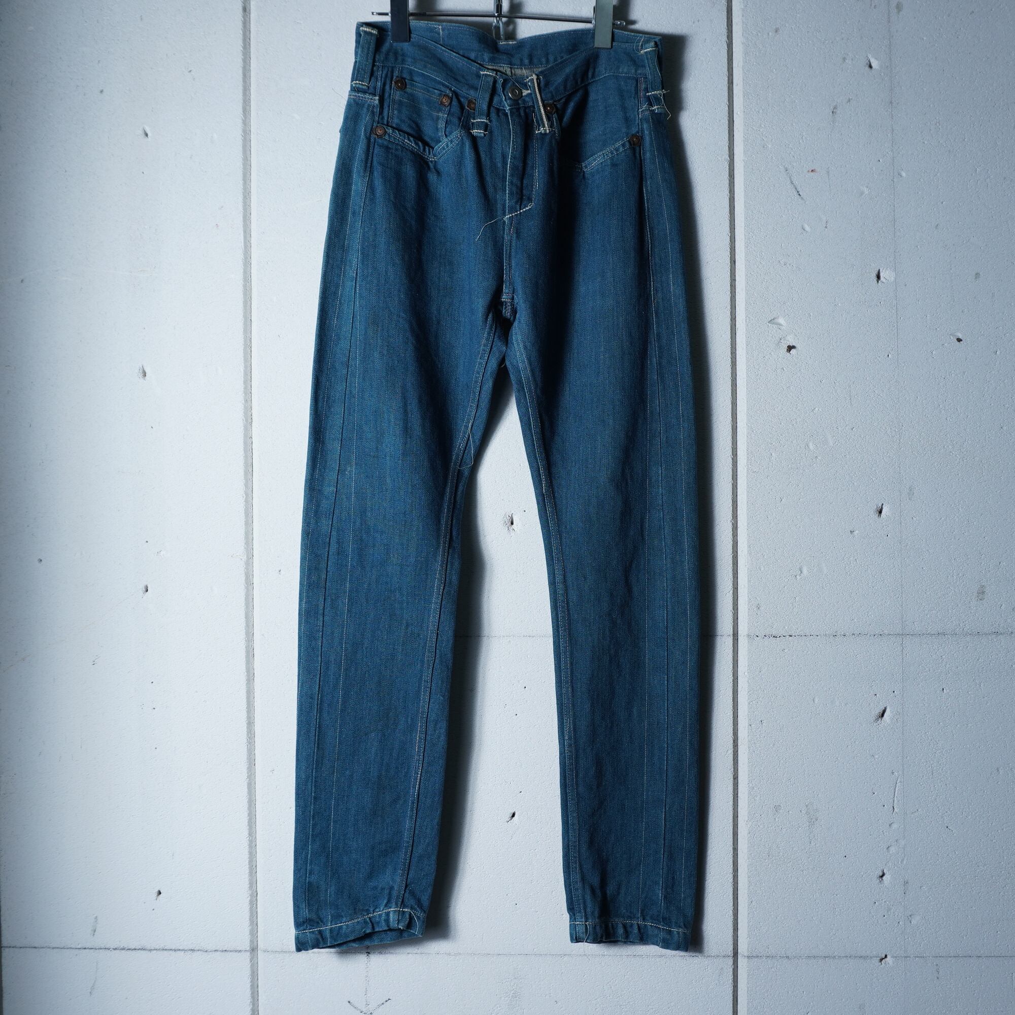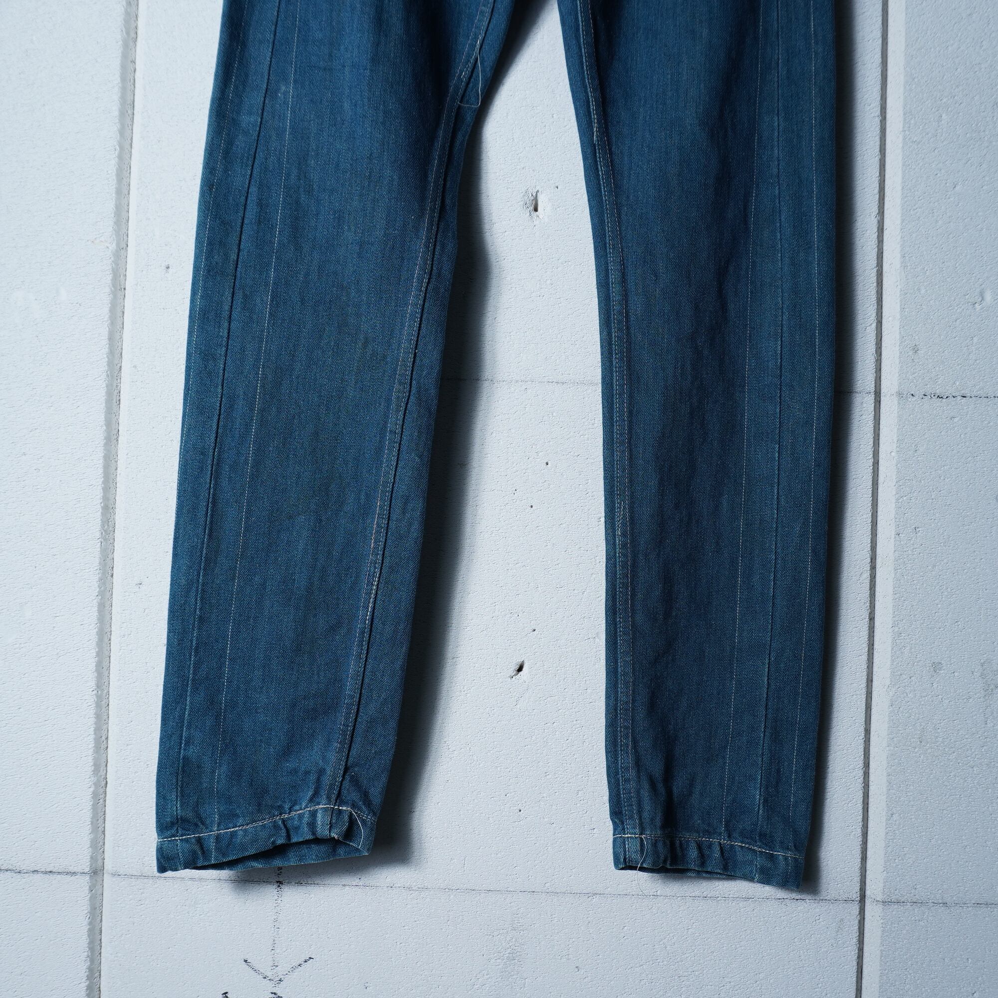 あえて切りっぱなしにされて飛び出た糸やステッチ、切り替えデザインなど現行品にはないディテールがたまらないデニムパンツです。
