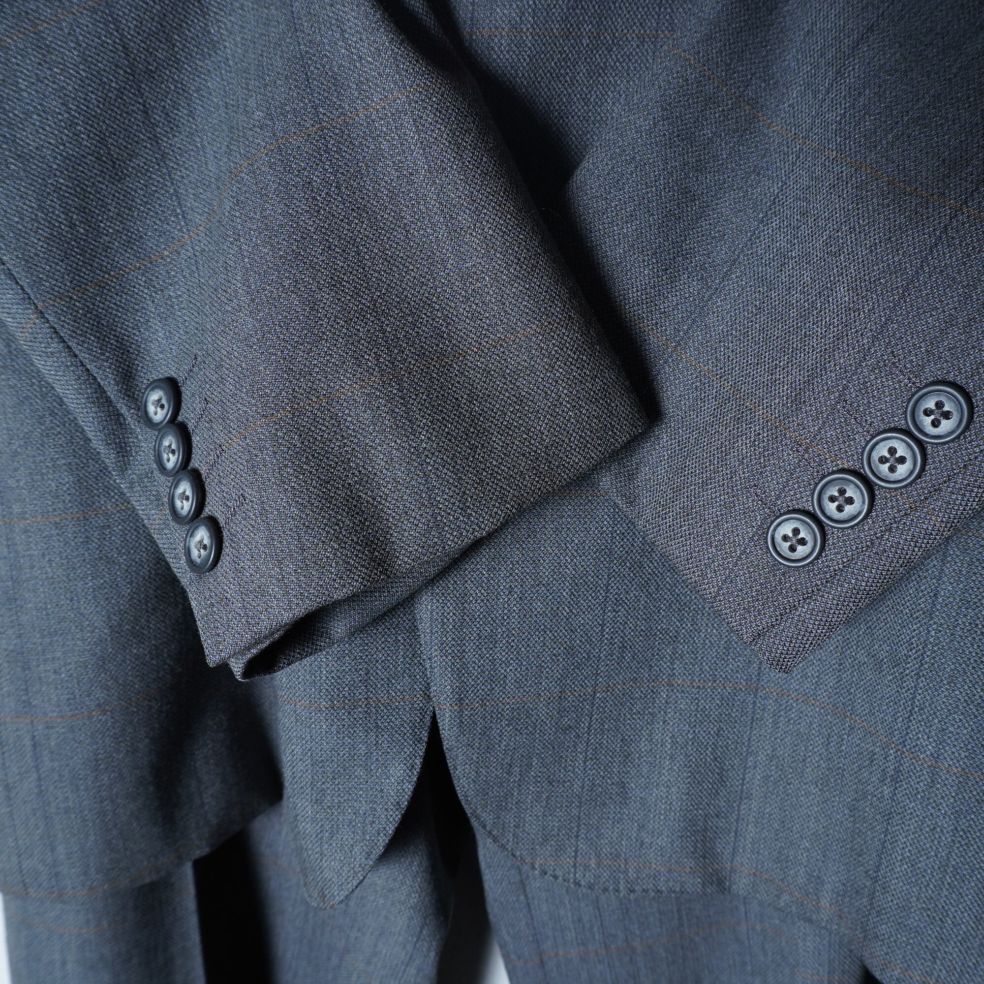 バーバリーのグレンチェックが入ったセットアップ。上品なグレーに小さな格子が集まって大きな格子を構成しているグレンチェックが施され、クラシックながらもモダンな雰囲気を演出します。バーバリーならではの洗練されたデザインと卓越したテーラリング技術が光る、特別な一着。