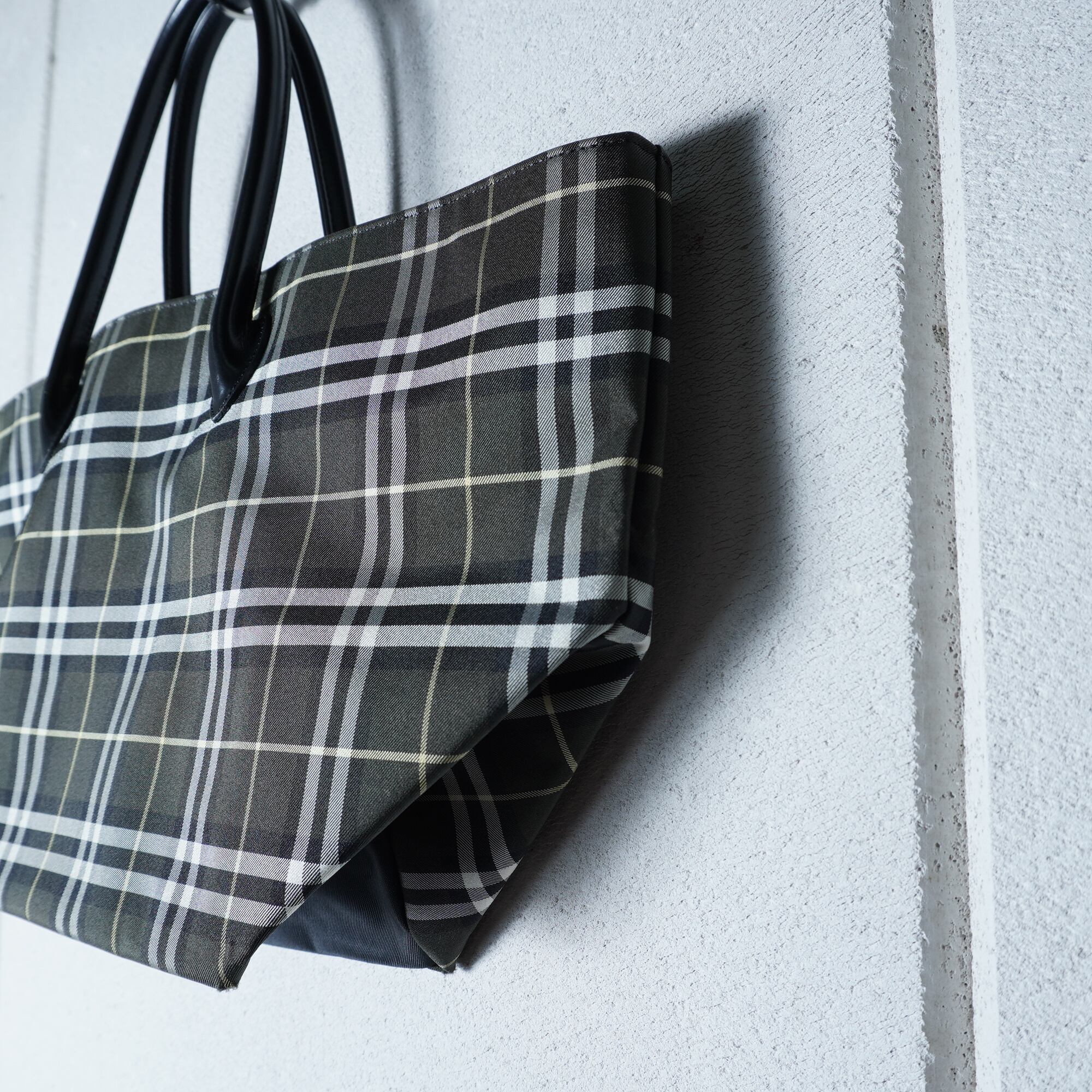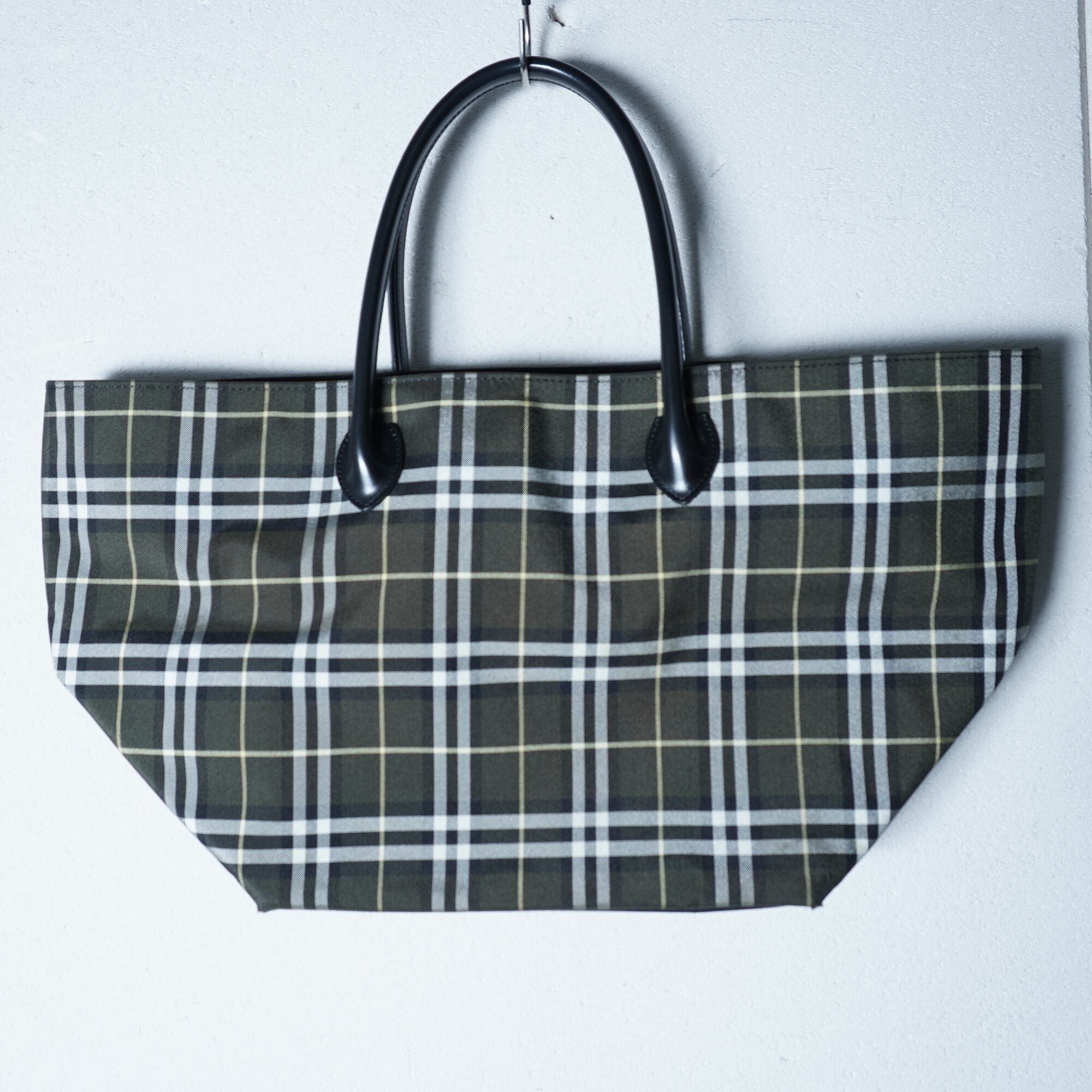 【BURBERRY】バーバリー 美品チェック柄レザー切替トートバッグ khaki & black & white
