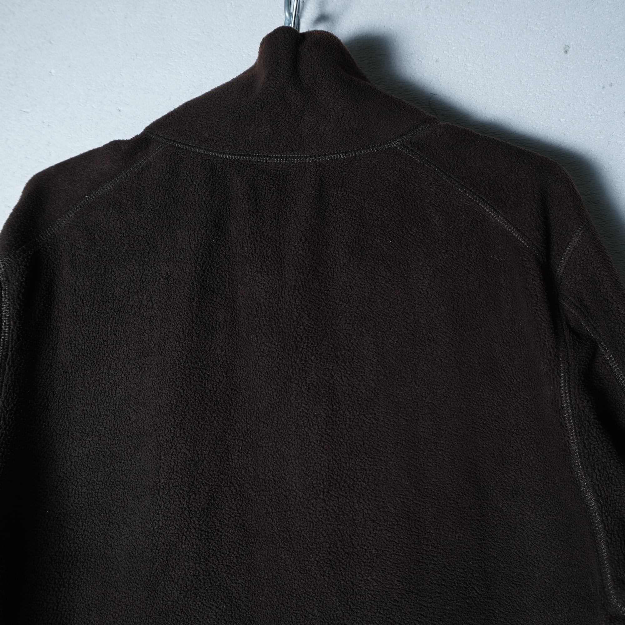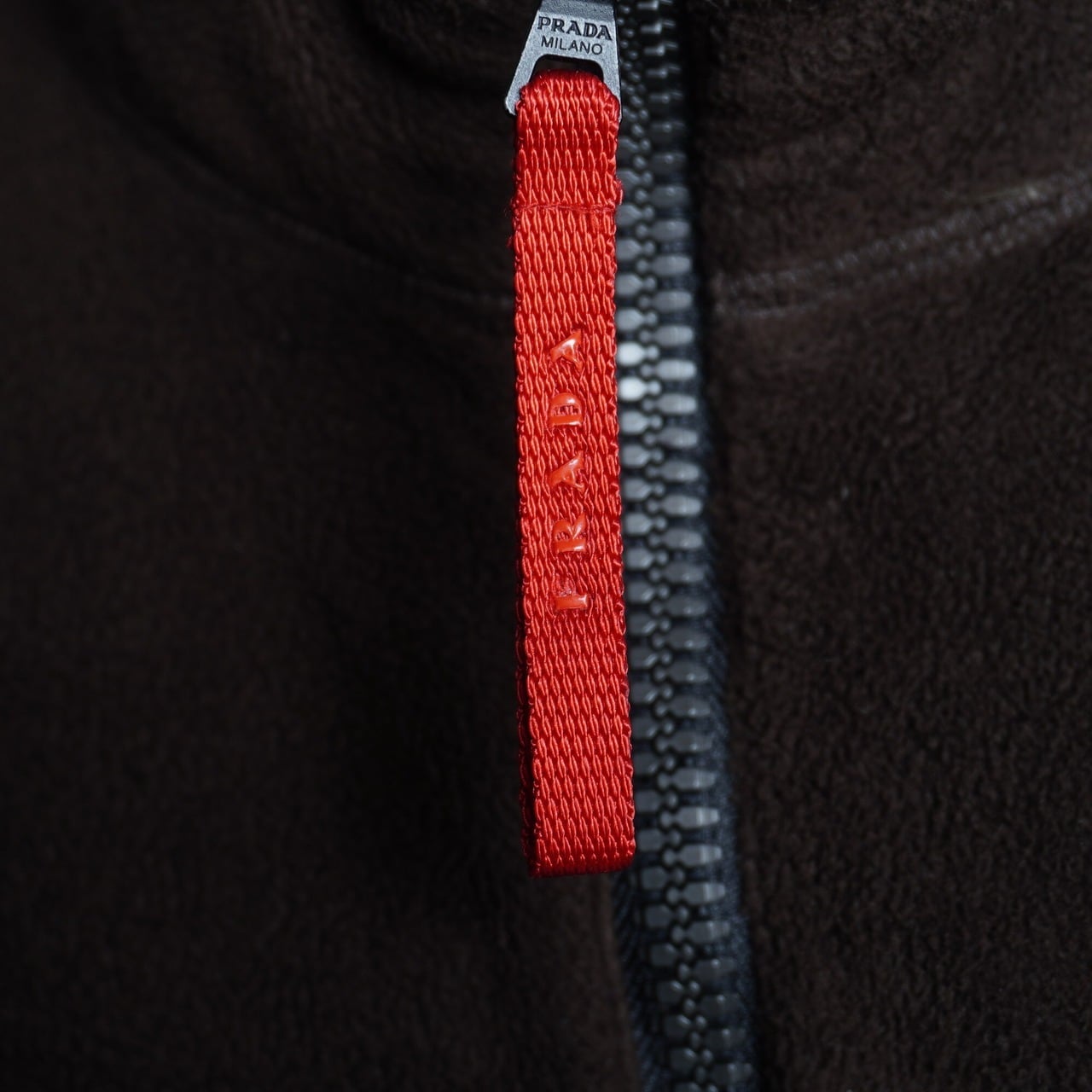 このPRADAのダークブラウンフリースジャケットは、洗練されたミニマルデザインと実用性を見事に融合させた一着です。上質なフリース素材を贅沢に使用し、高級感と暖かさを両立させています。フロントには大きなジッパー開閉を採用し、アクセントとなる赤いプルタブがデザインのポイントに。サイドには機能的なジップポケットを配置し、実用性も確保しています。ハイネックデザインで首元までしっかりと防寒できる仕様となっています。