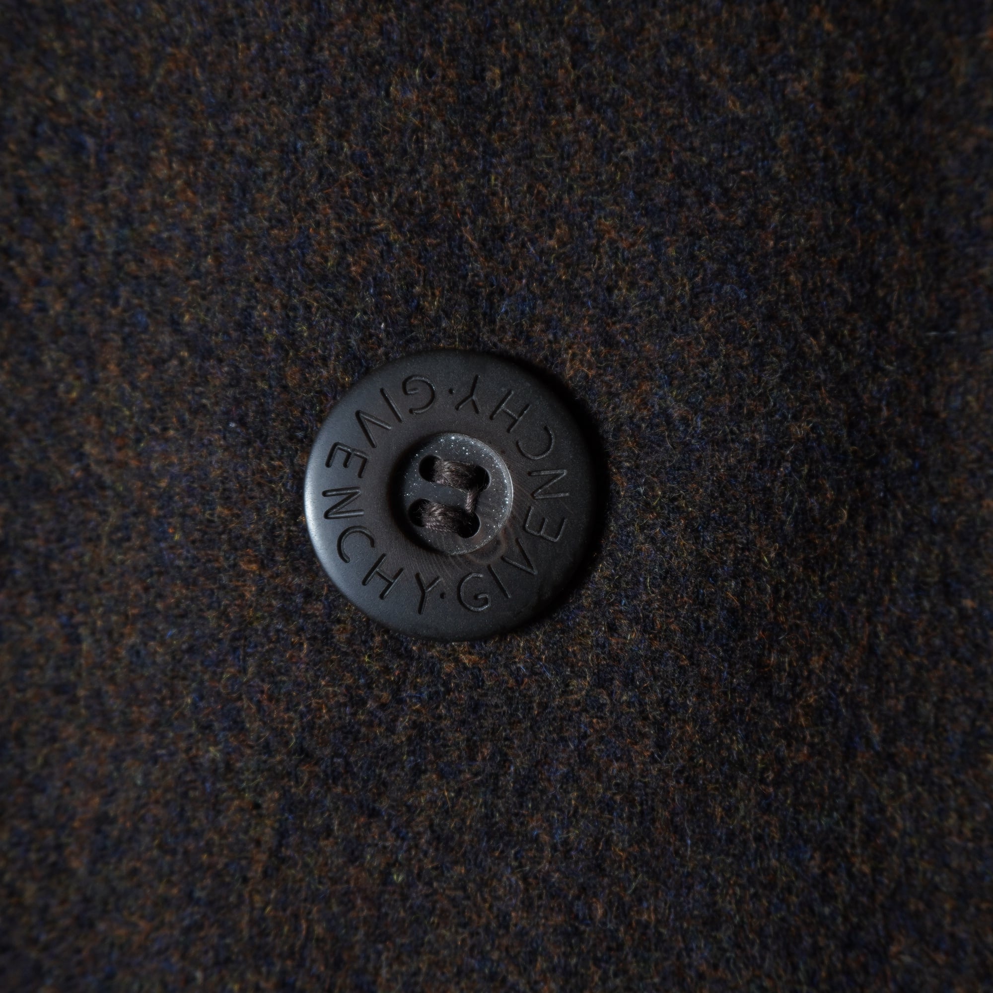 深みのある色が目を惹くジバンシーのコート。遠目で見るとブラウンですが、近くでよく見ると様々な色が使われており、その素材はウールとカシミヤで上質な肌触りです。目立つフロントのダブルボタンにはジバンシーの刻印もあり、着るだけで様になる何をどう合わせてもお洒落になる最高の一着です。