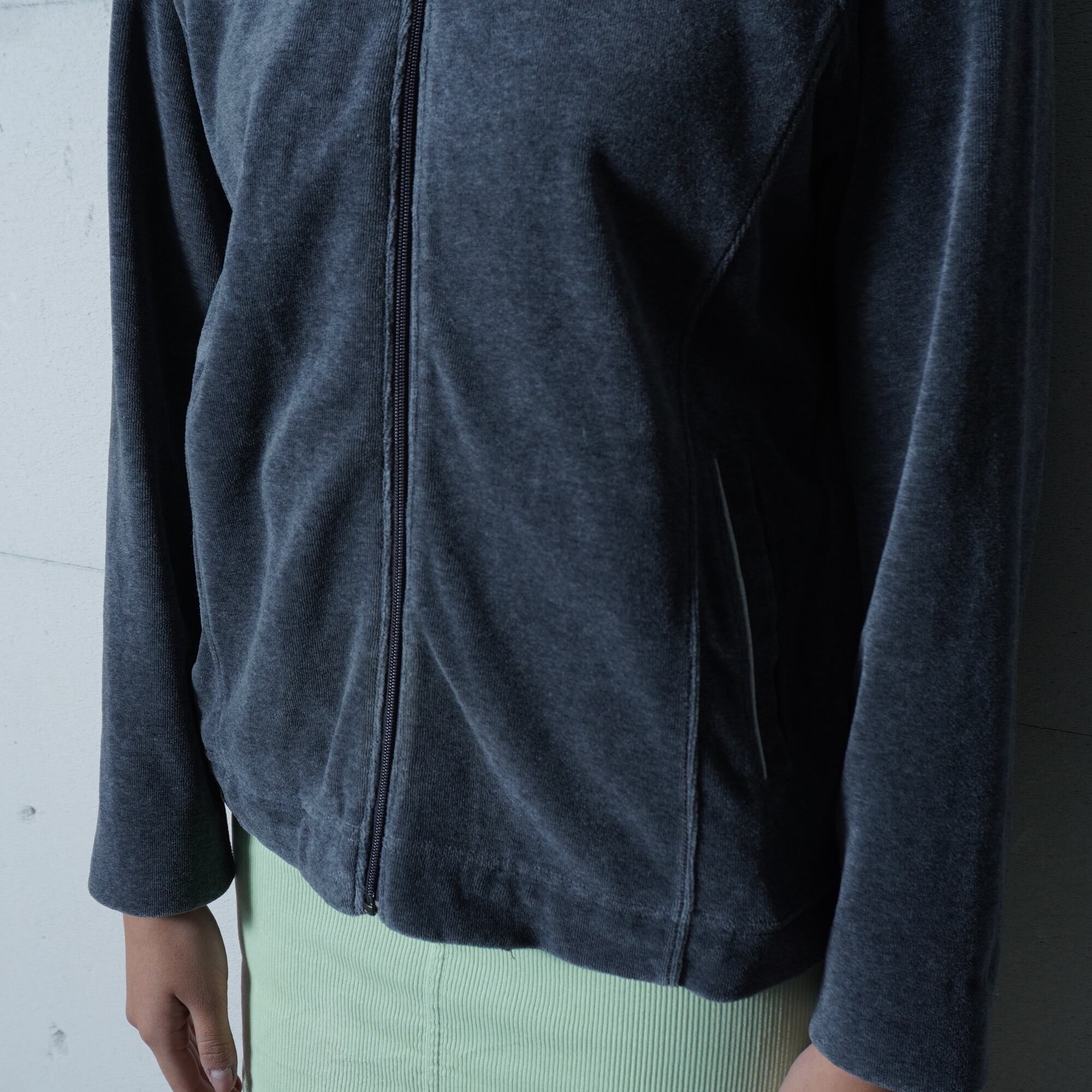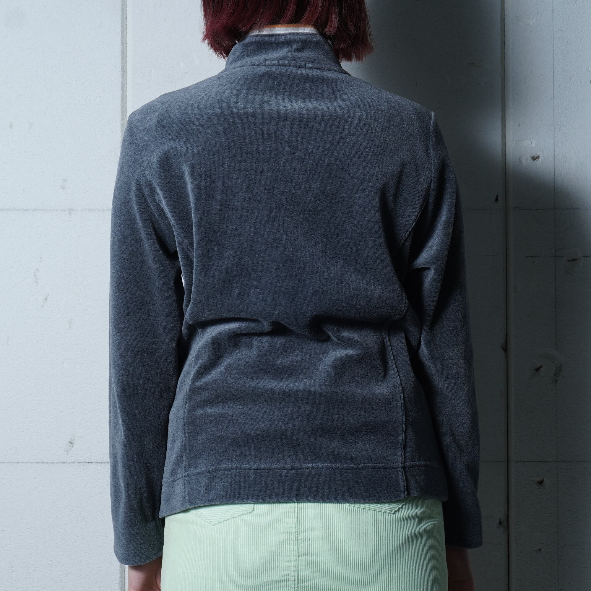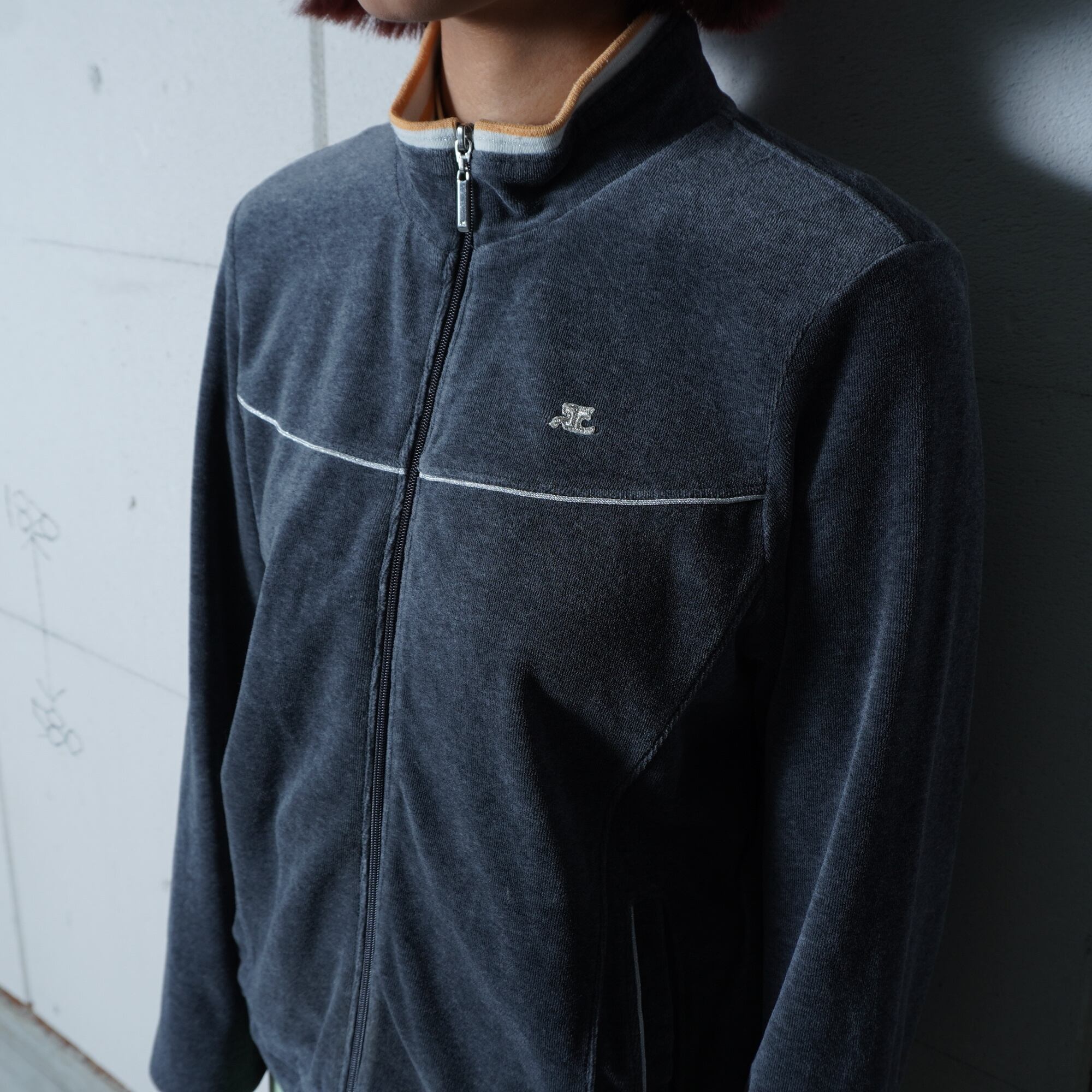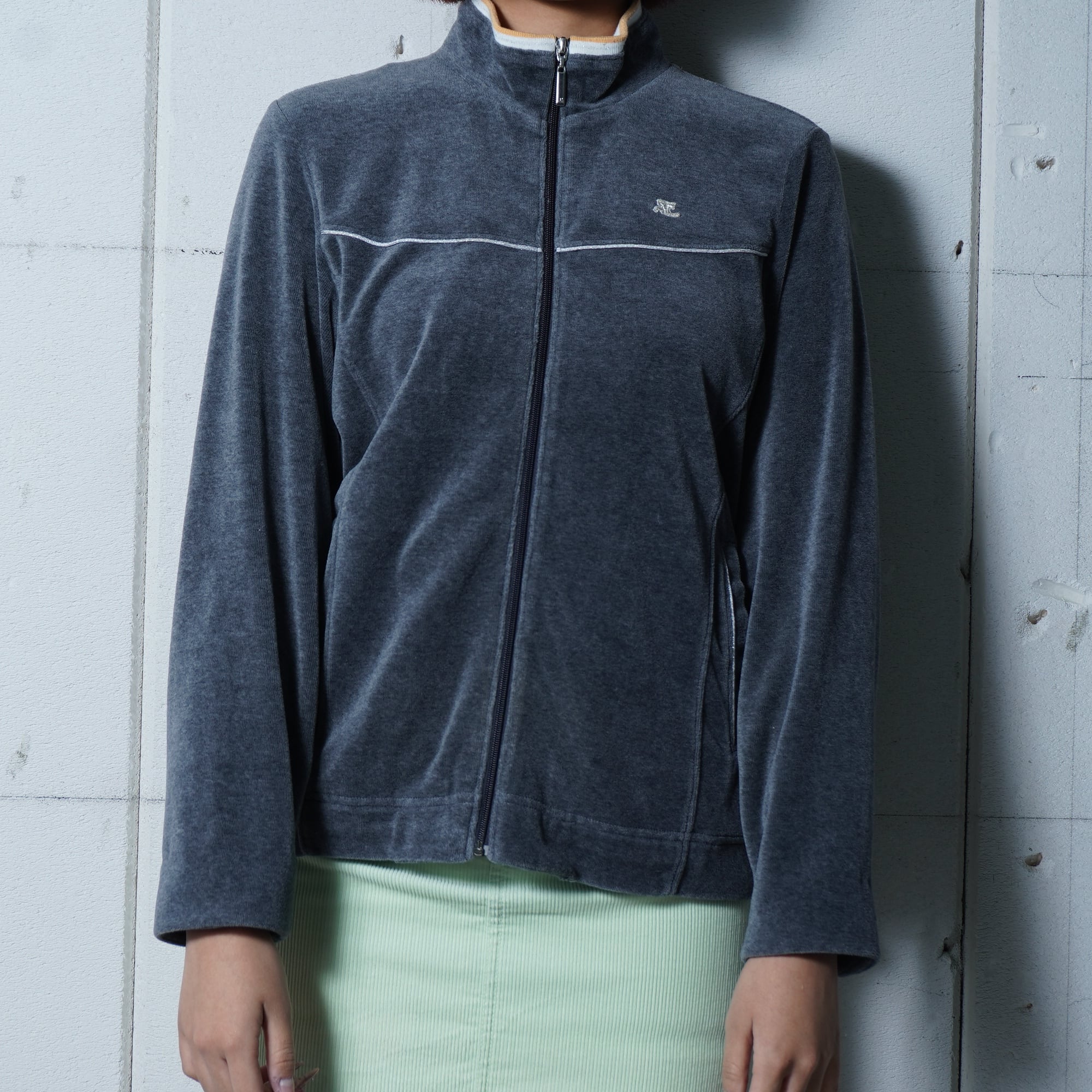 シックなグレーカラーで、大人の落ち着きとクールな雰囲気を演出。胸元のブランドロゴ刺繍が、さりげなくも確かな存在感をアピール。フロントZIP仕様で、カジュアルにもモードにも自在にアレンジ可能。スリムなシルエットが、洗練されたスタイルを際立たせる。