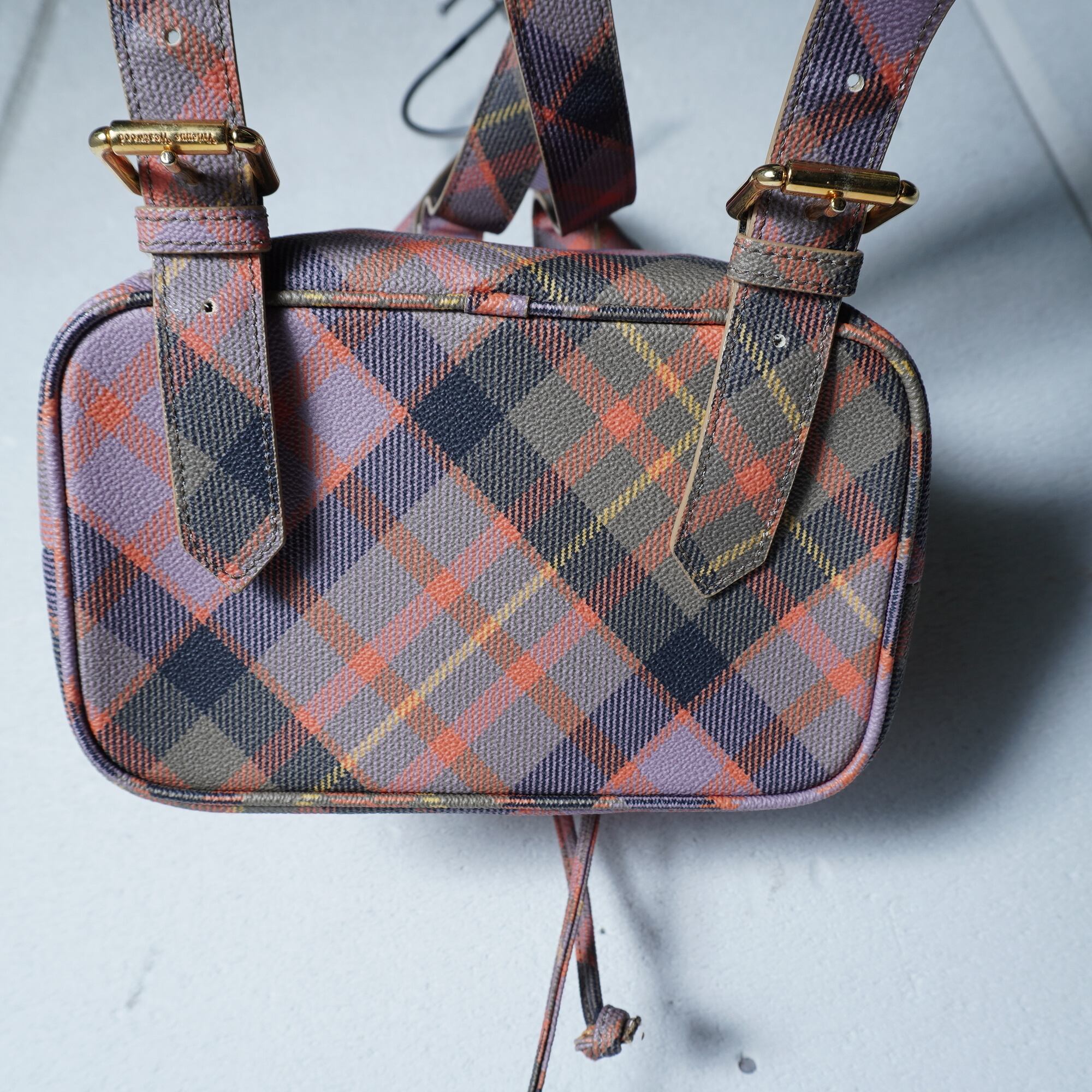 ・オレンジ、パープル、ブラックのカラーコンビネーションが見事に調和し、個性的なスタイルを引き立てる