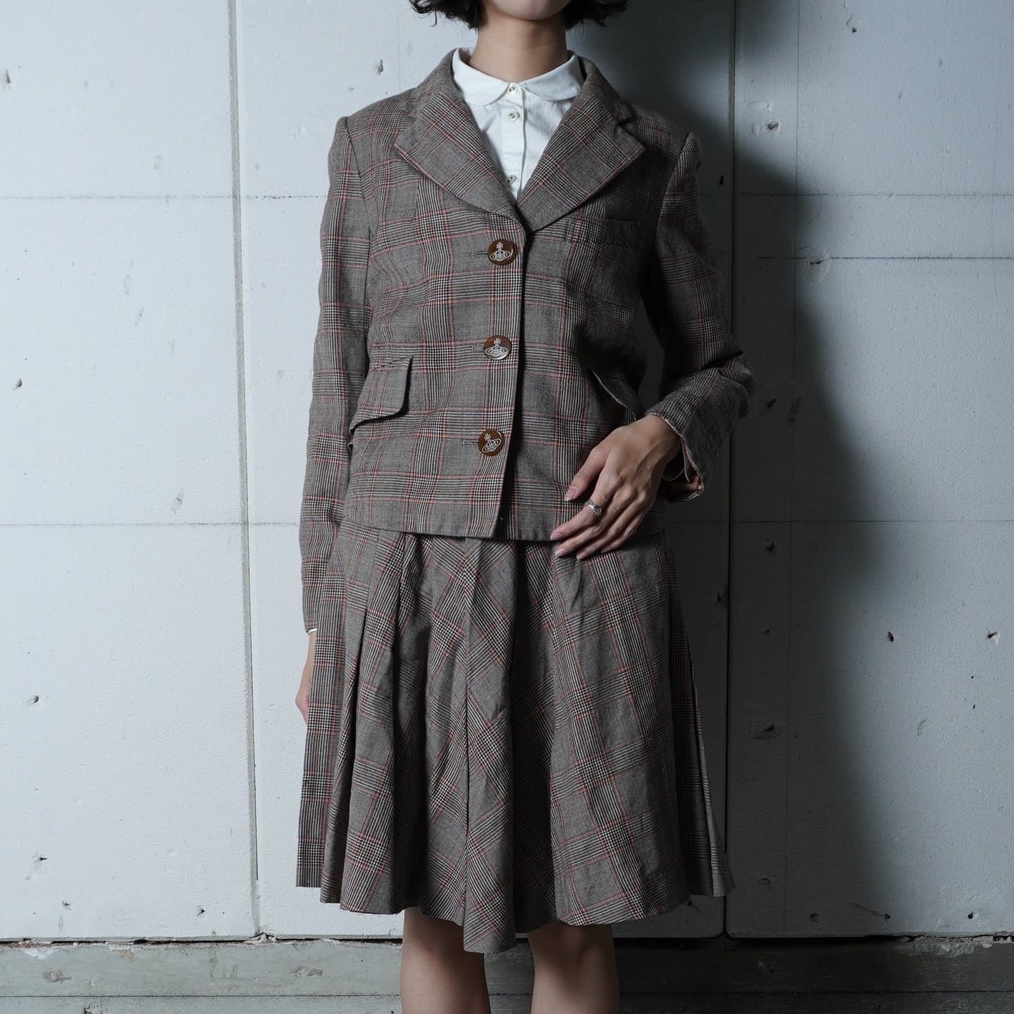 【Vivienne Westwood】ヴィヴィアンウエストウッド オーブロゴボタン チェック柄ウールジャケット・スカートセットアップ gray&pink