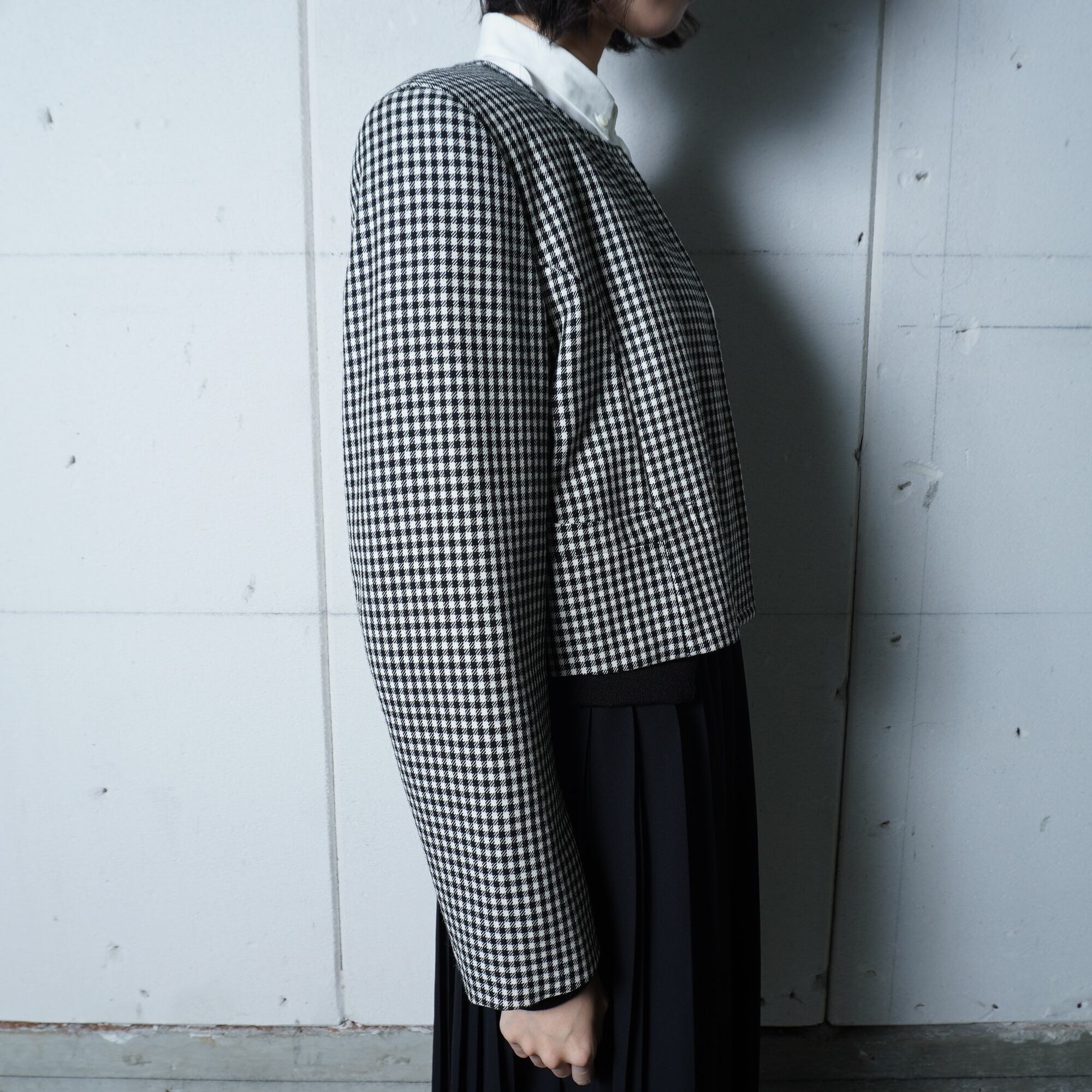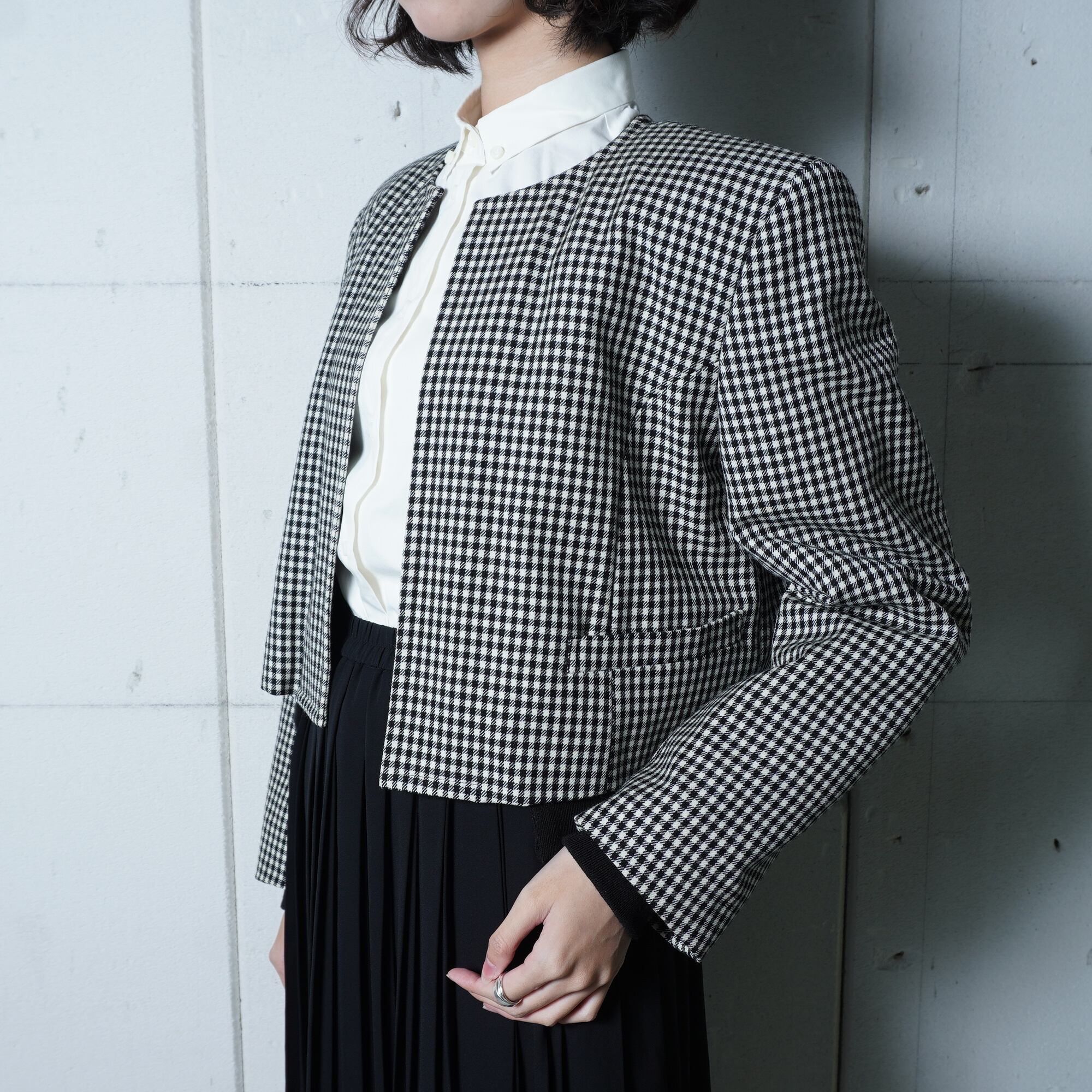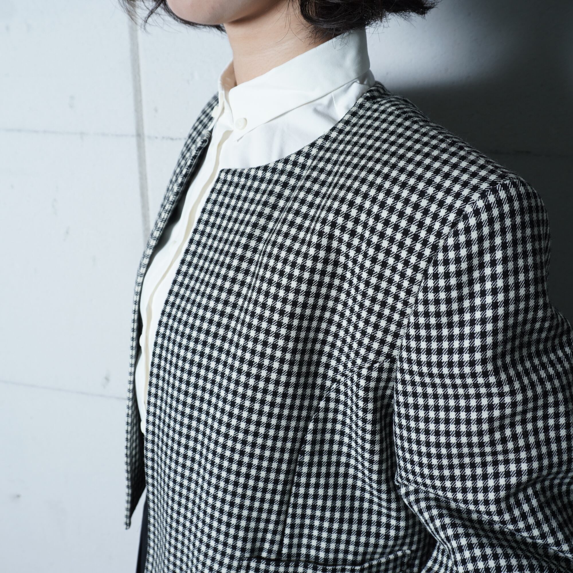 ・洗練された千鳥格子柄とクールなノーカラーが特徴的