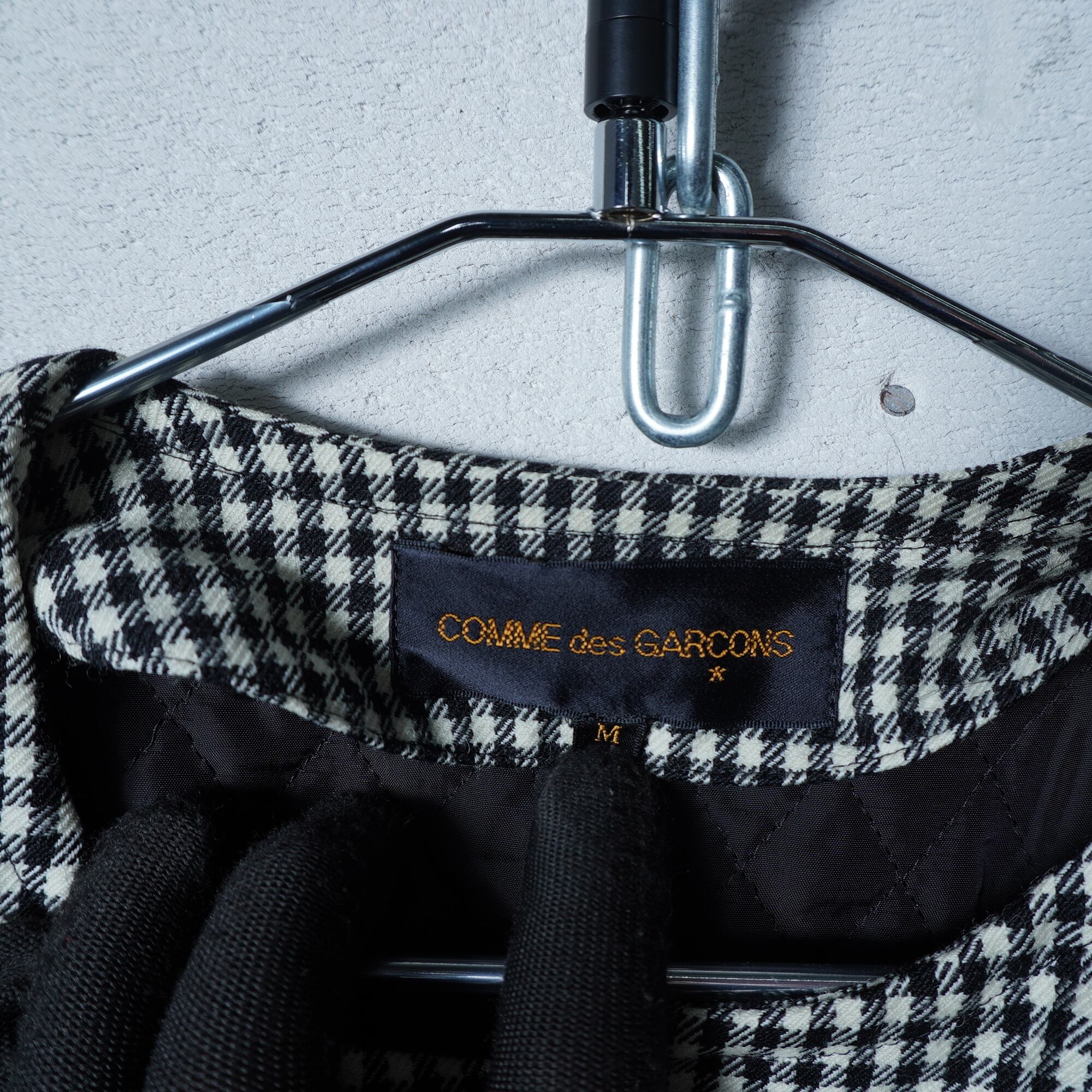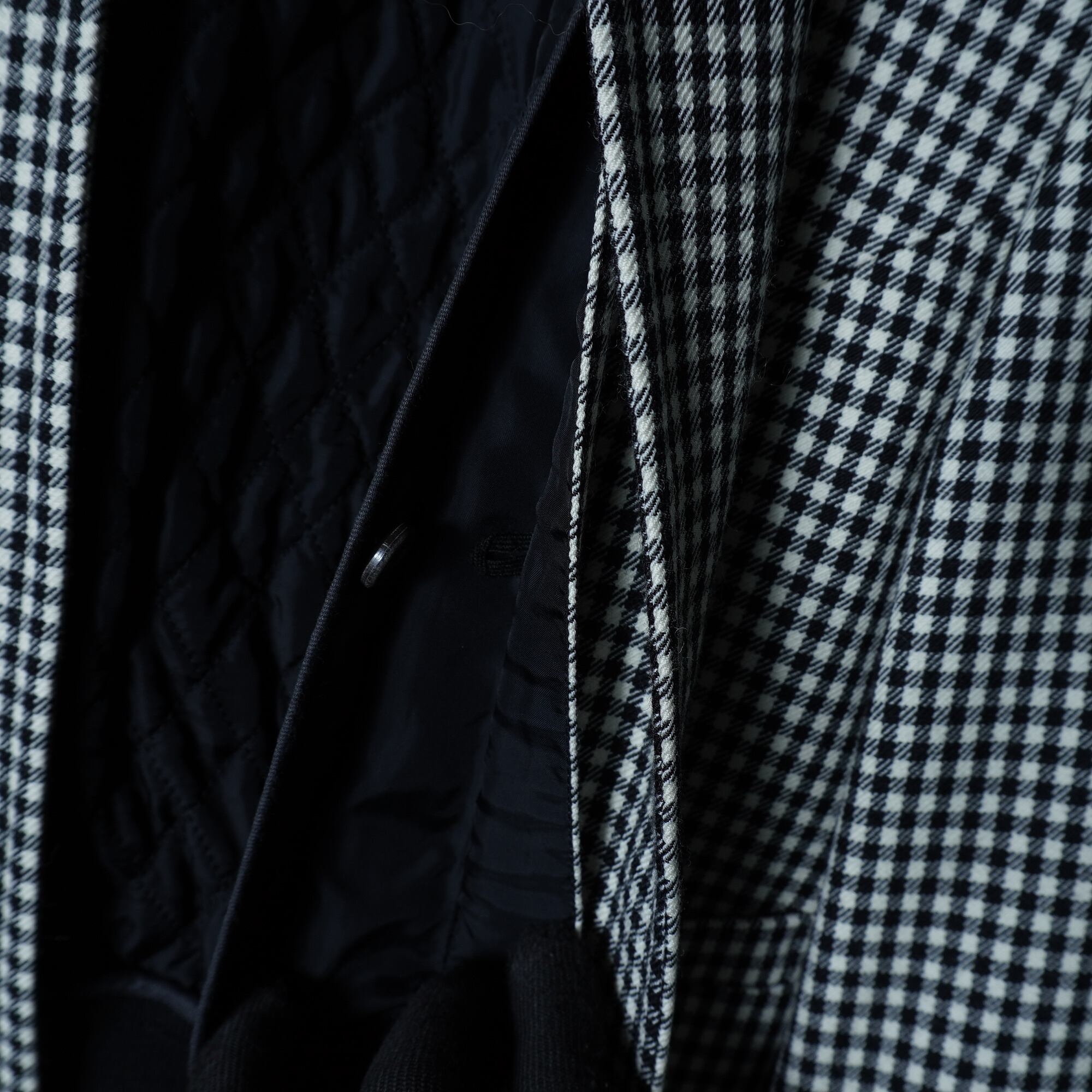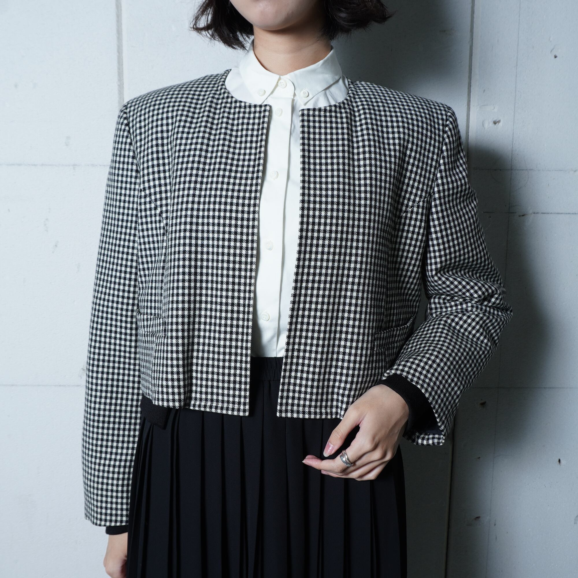 ・洗練された千鳥格子柄とクールなノーカラーが特徴的