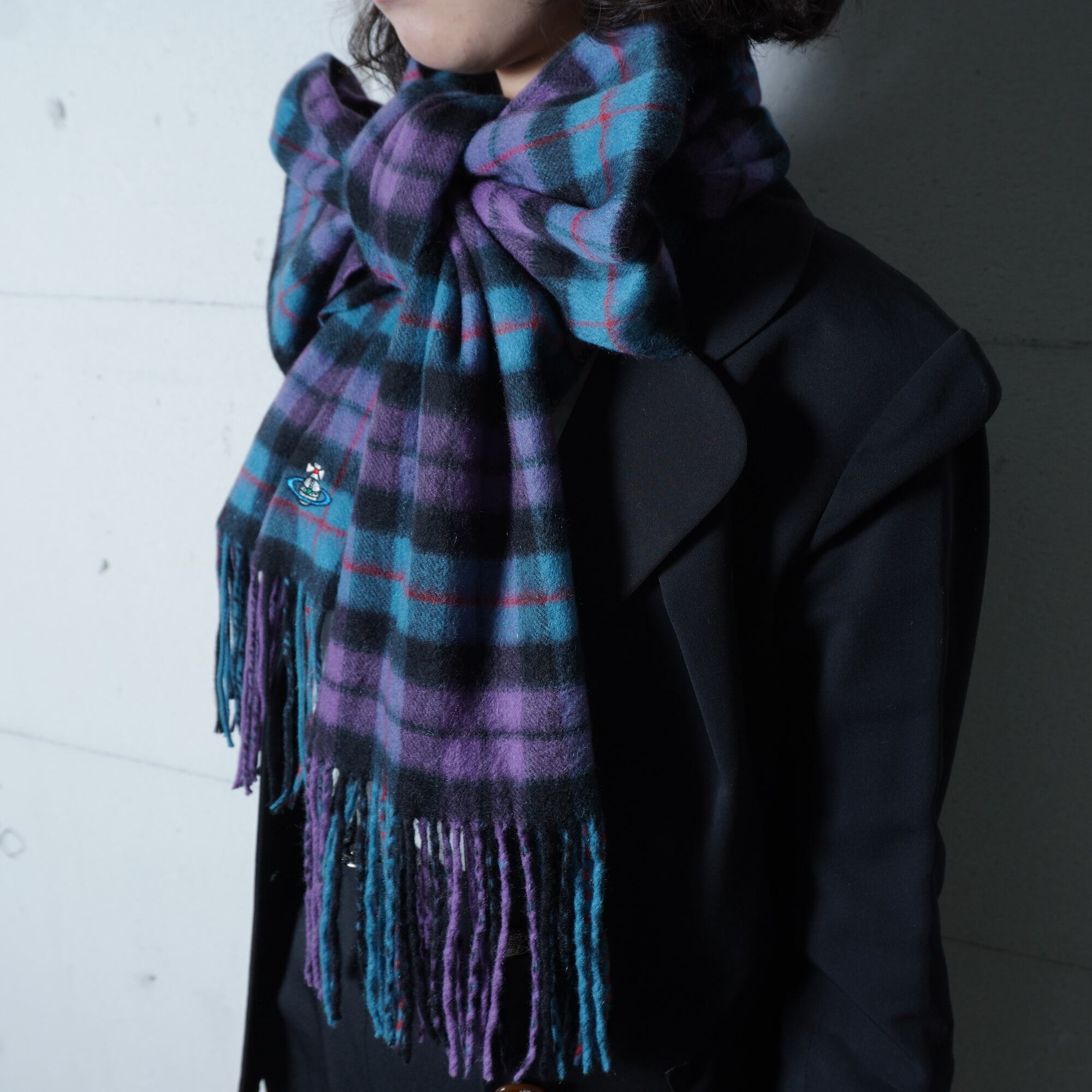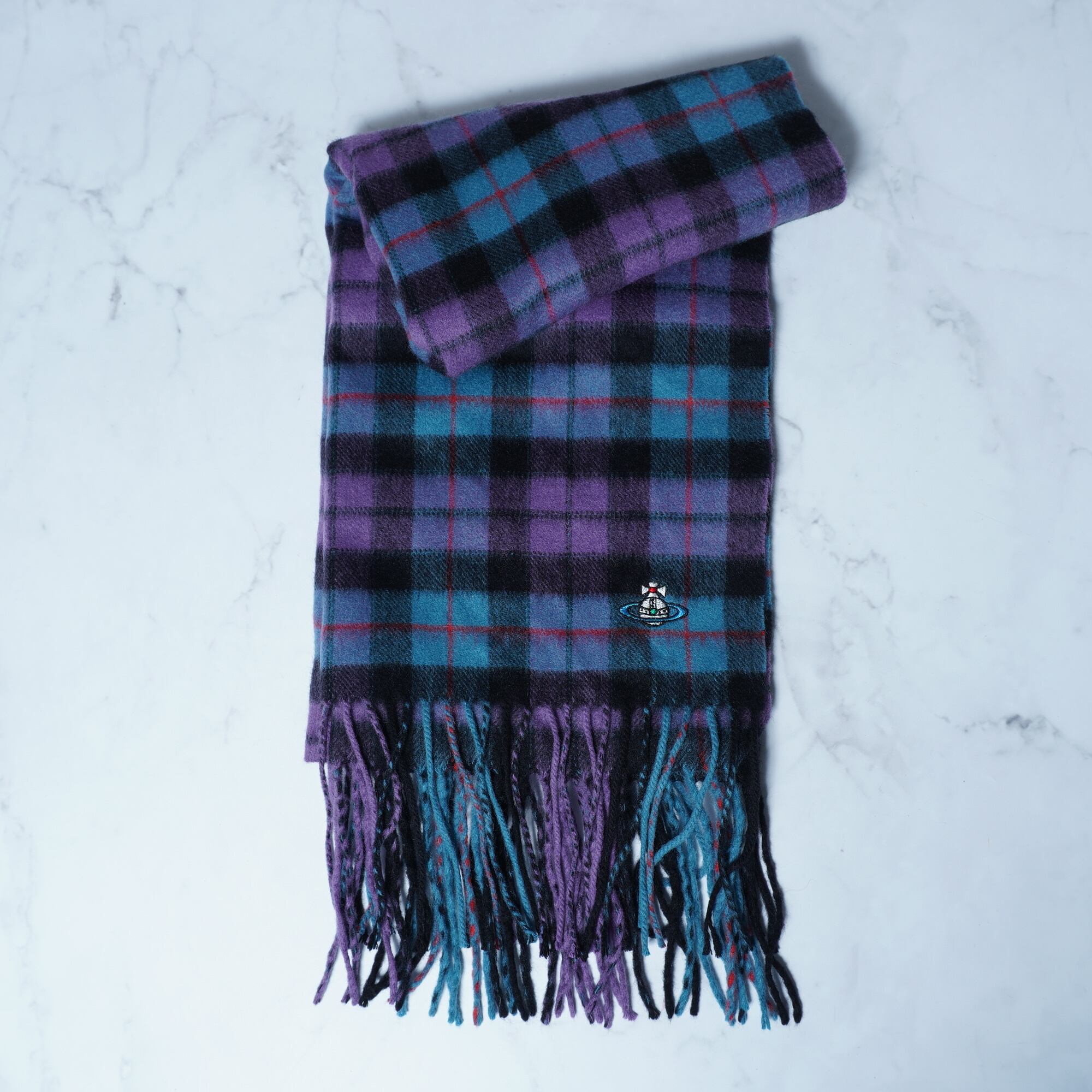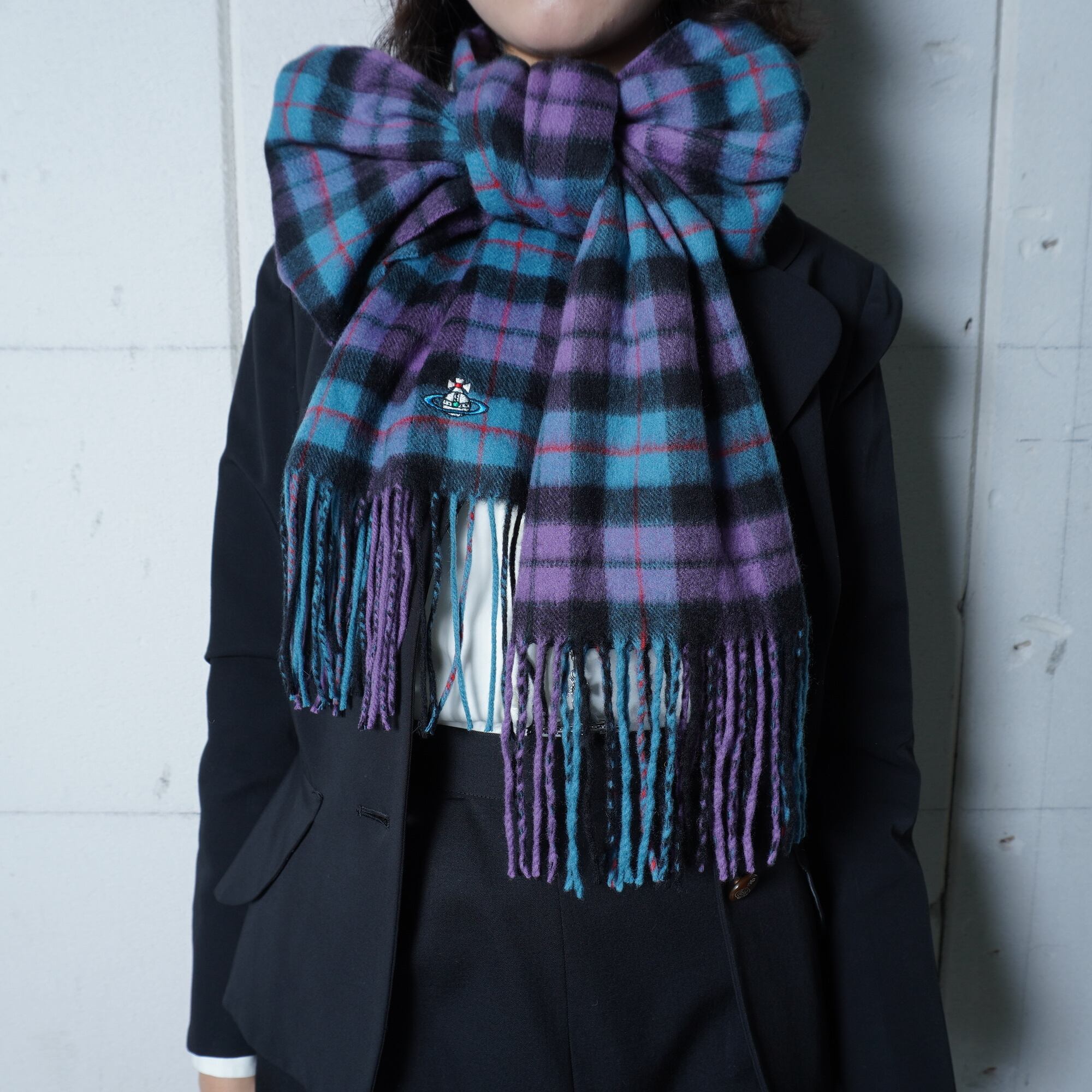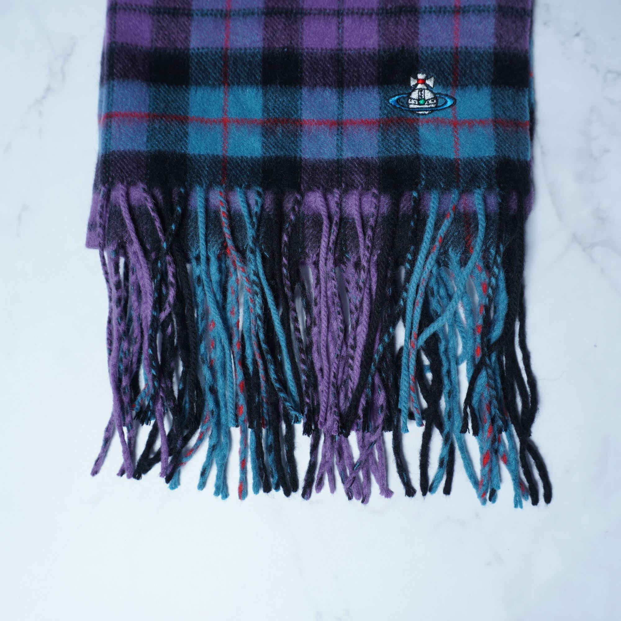 【Vivienne Westwood】ヴィヴィアンウエストウッド "オーブロゴ刺繍” カシミアフリンジマフラー purple&blue&black