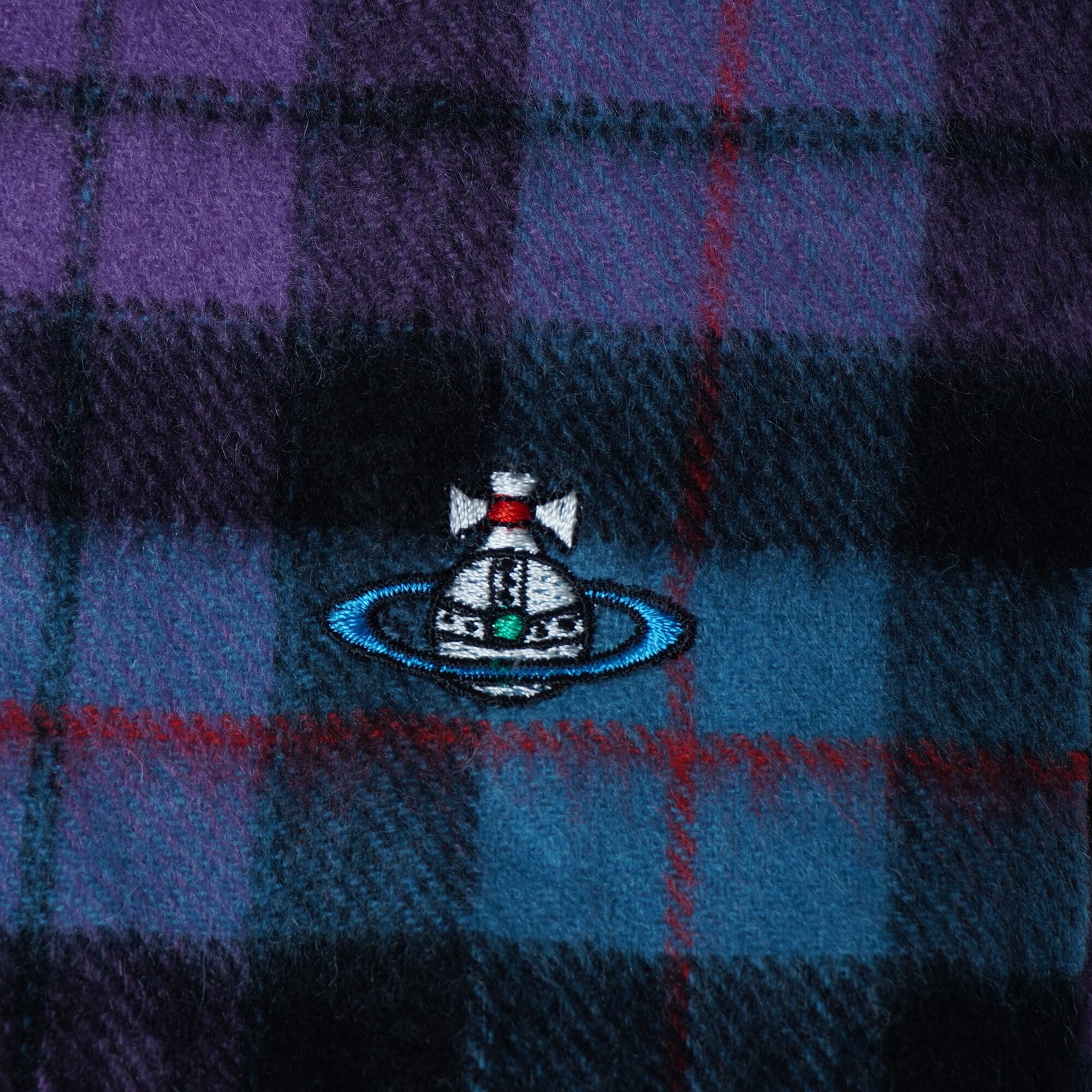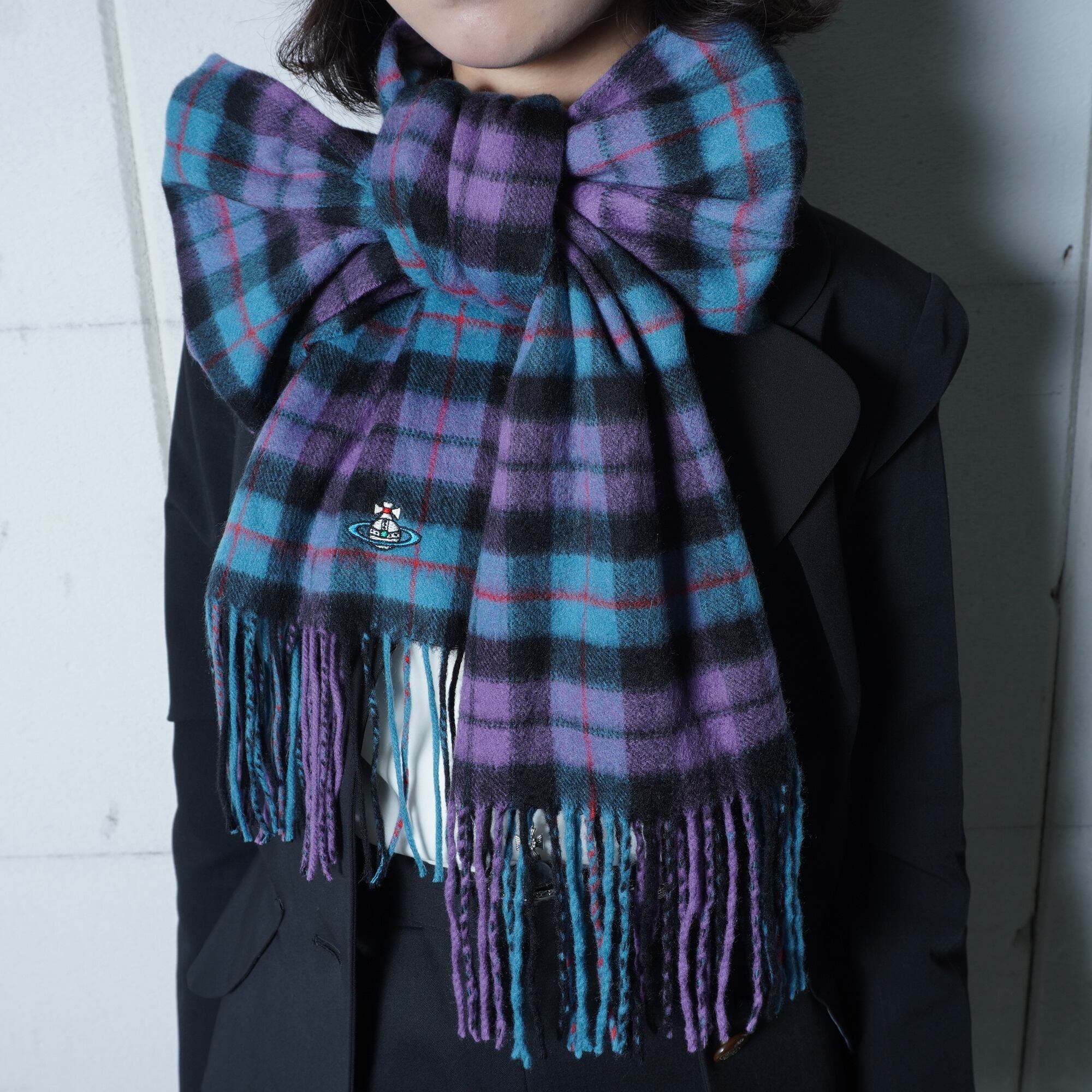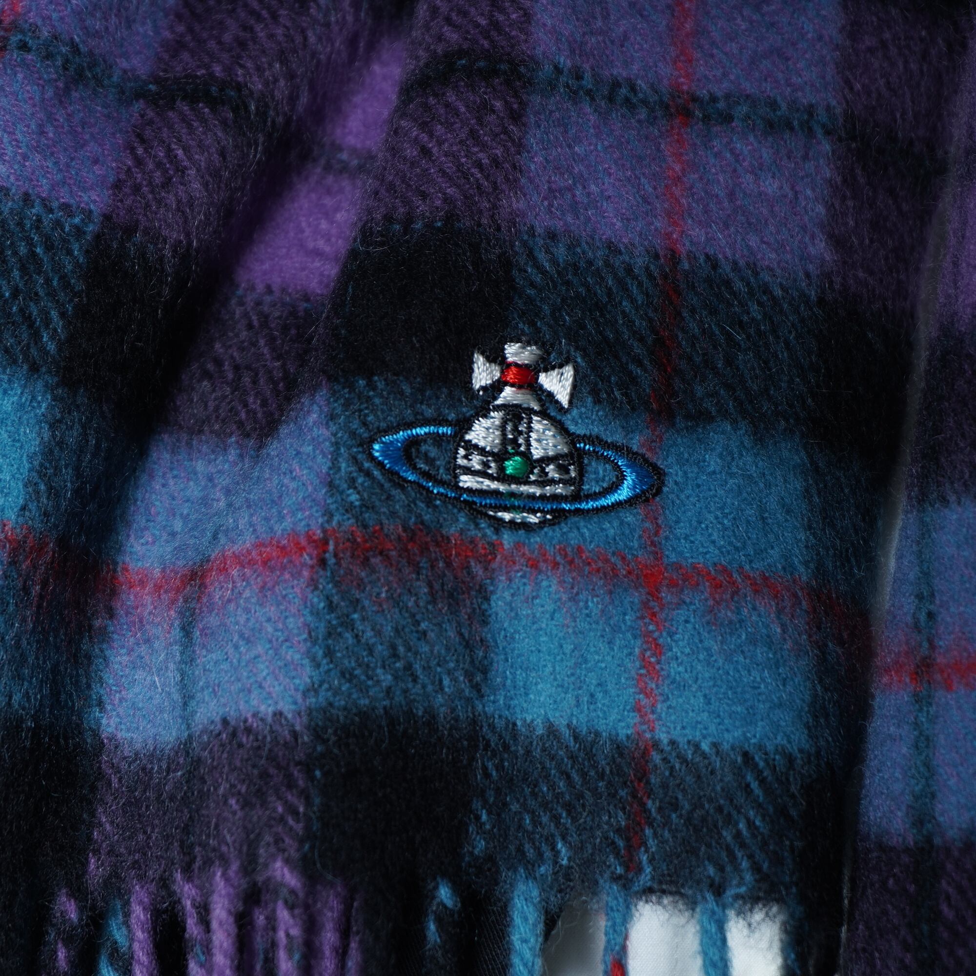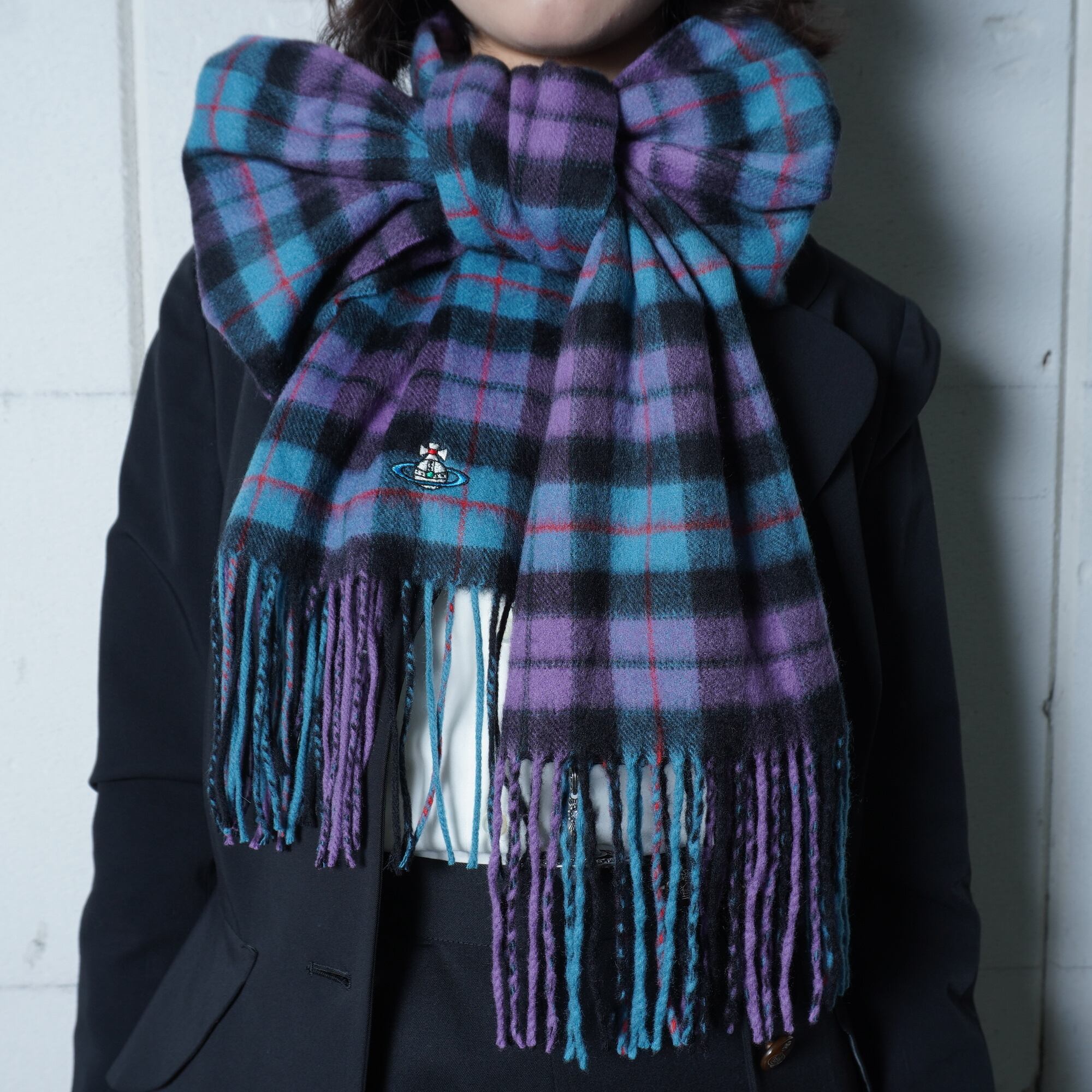 【Vivienne Westwood】ヴィヴィアンウエストウッド "オーブロゴ刺繍” カシミアフリンジマフラー purple&blue&black