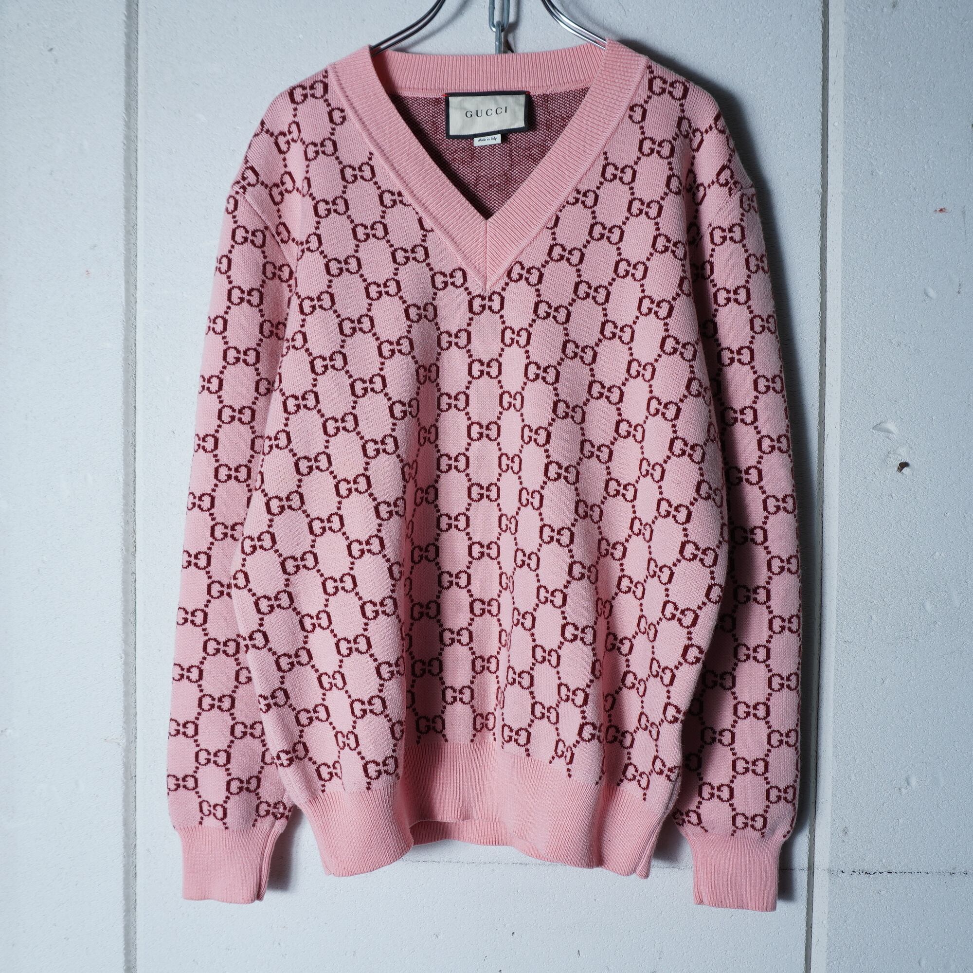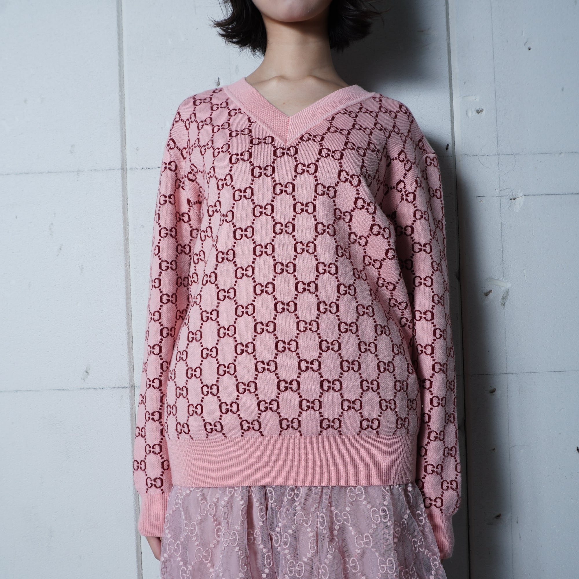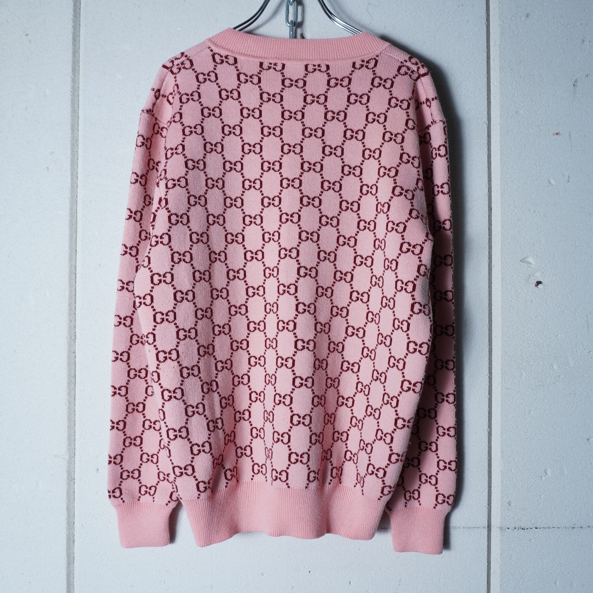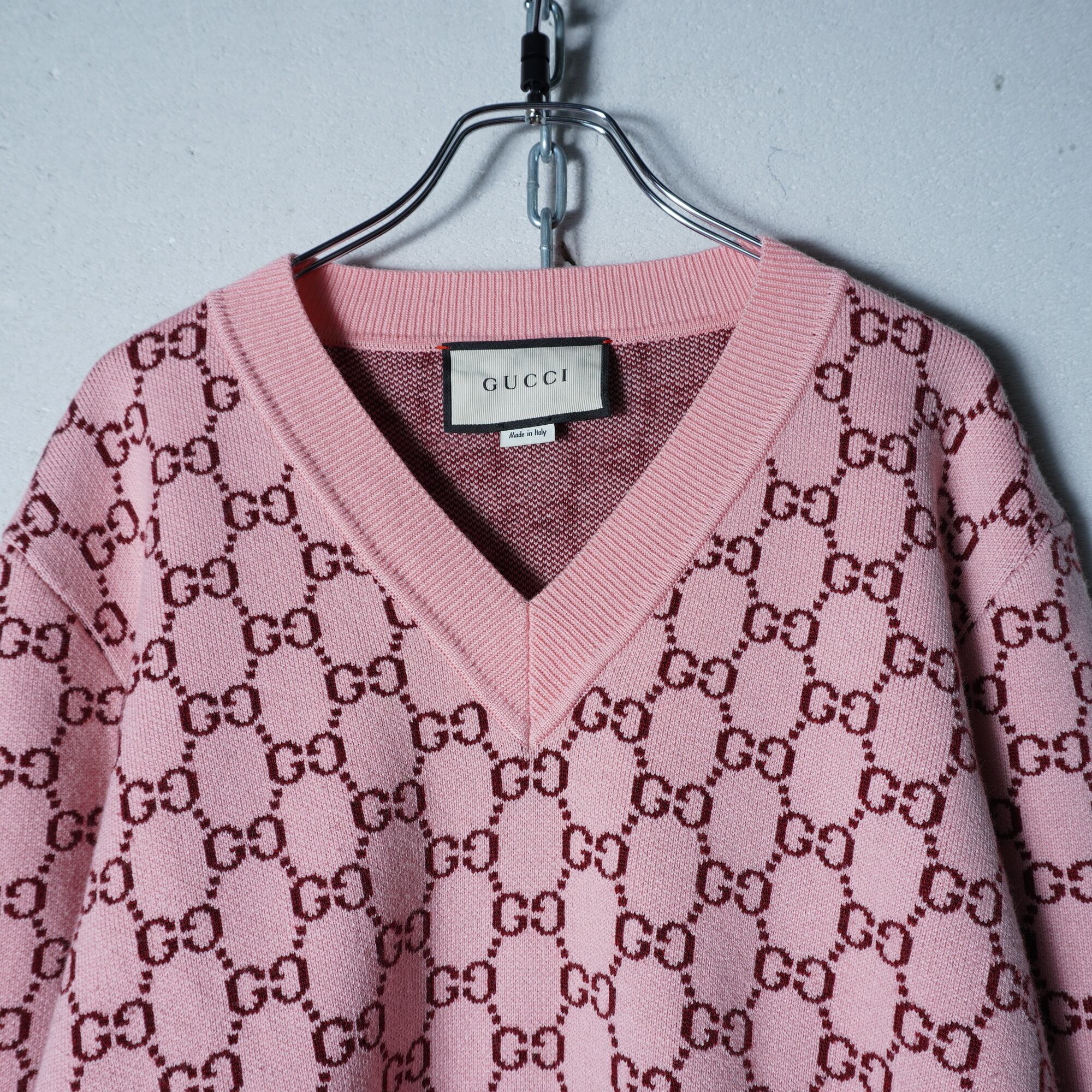 【GUCCI】グッチ ”GGロゴ総柄”WOOL100%Vネックニット pink