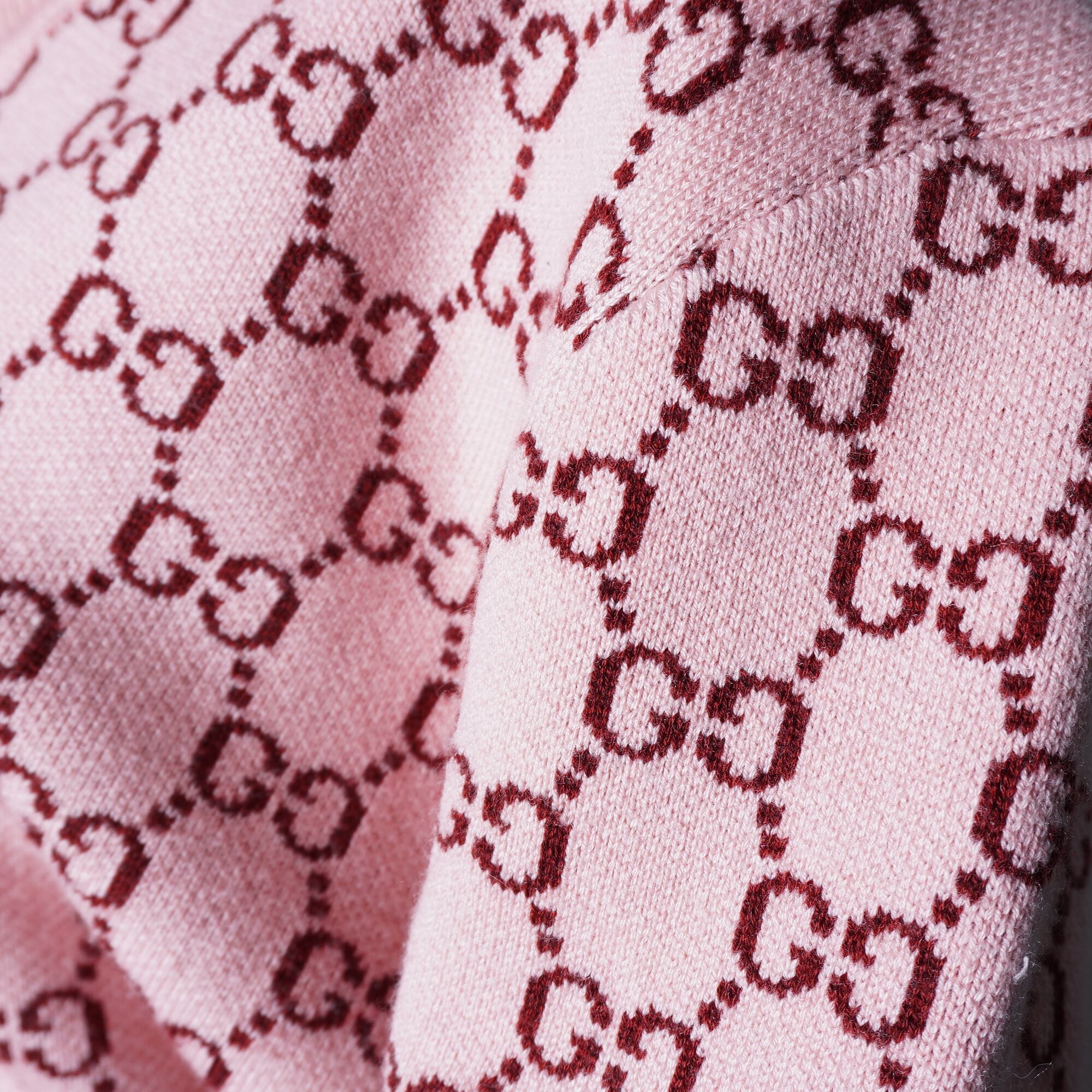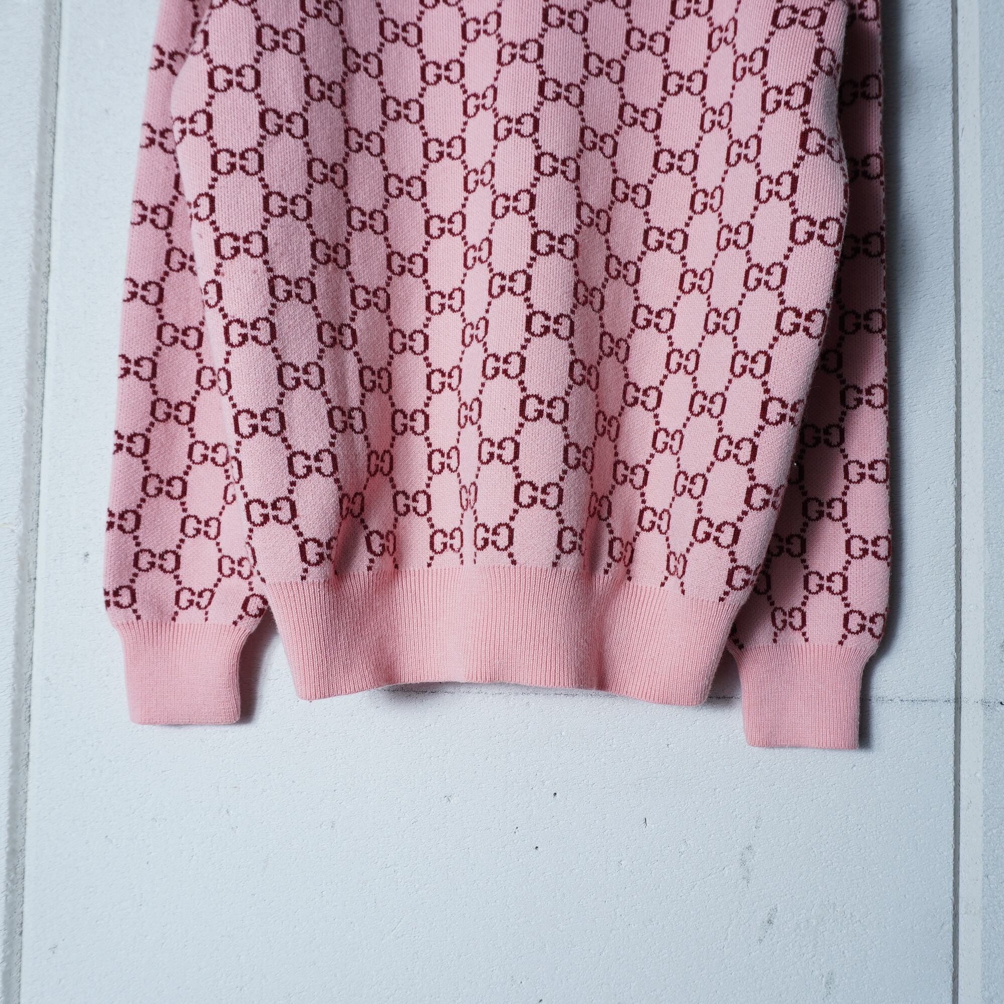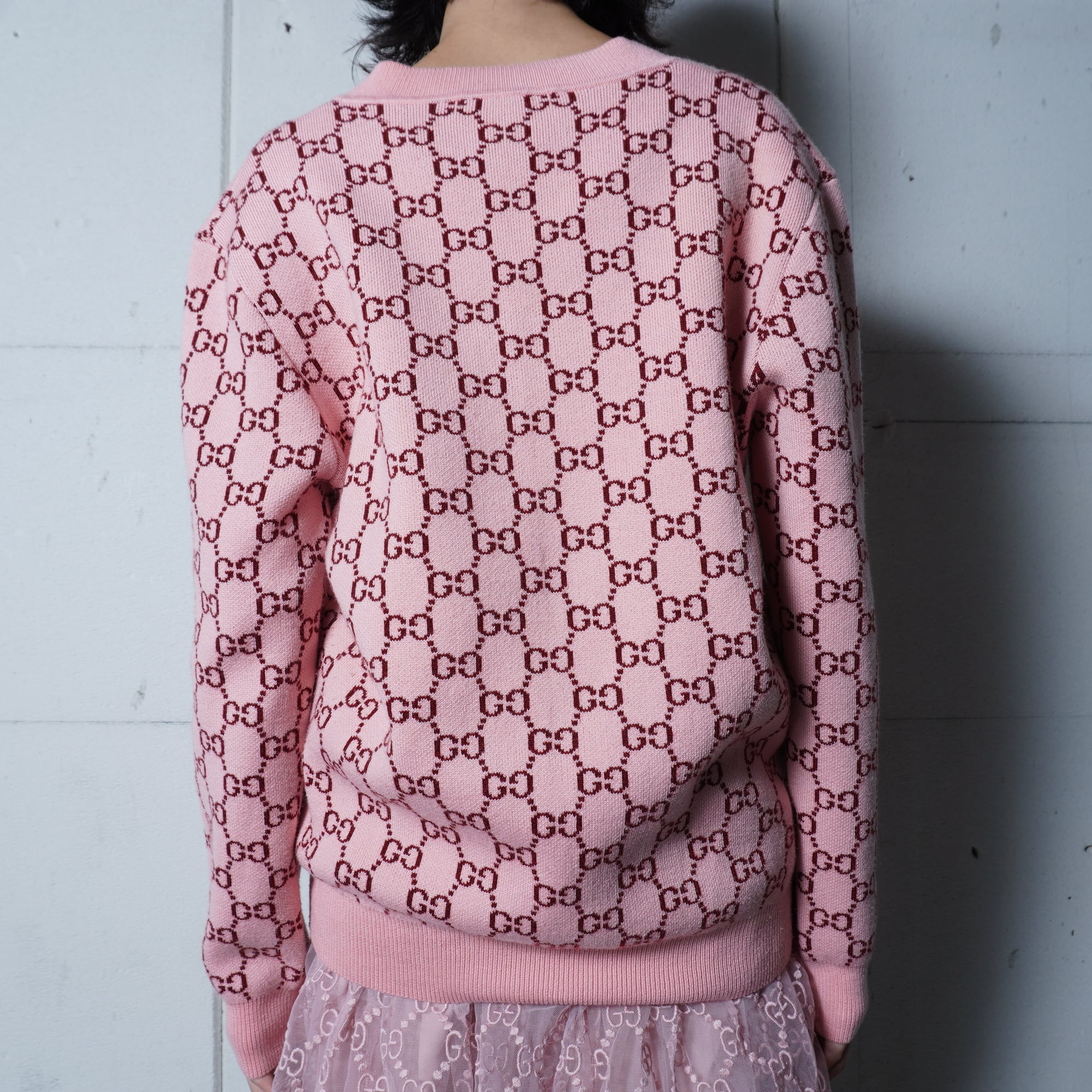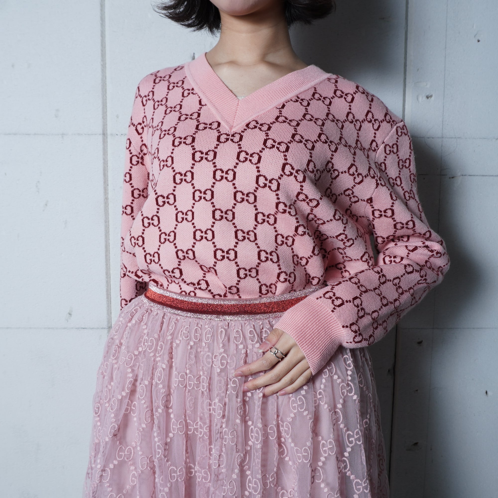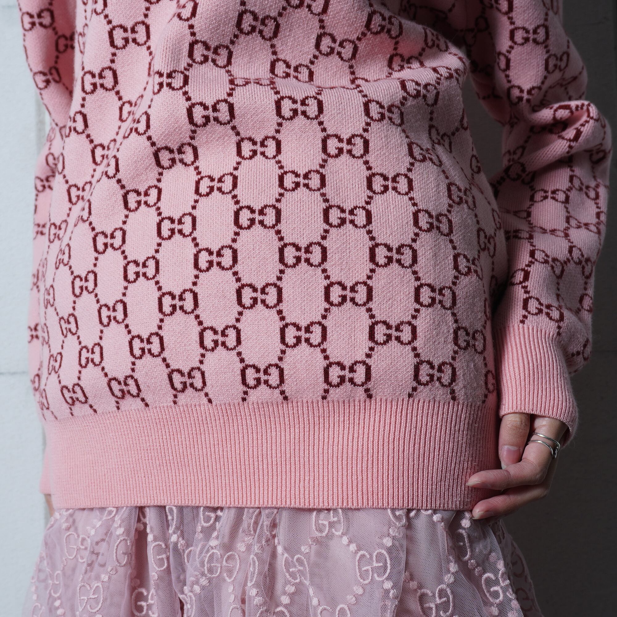 【GUCCI】グッチ ”GGロゴ総柄”WOOL100%Vネックニット pink