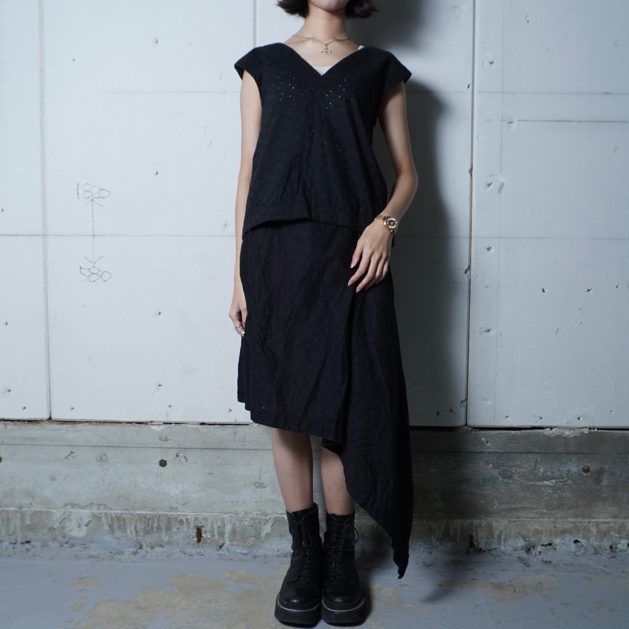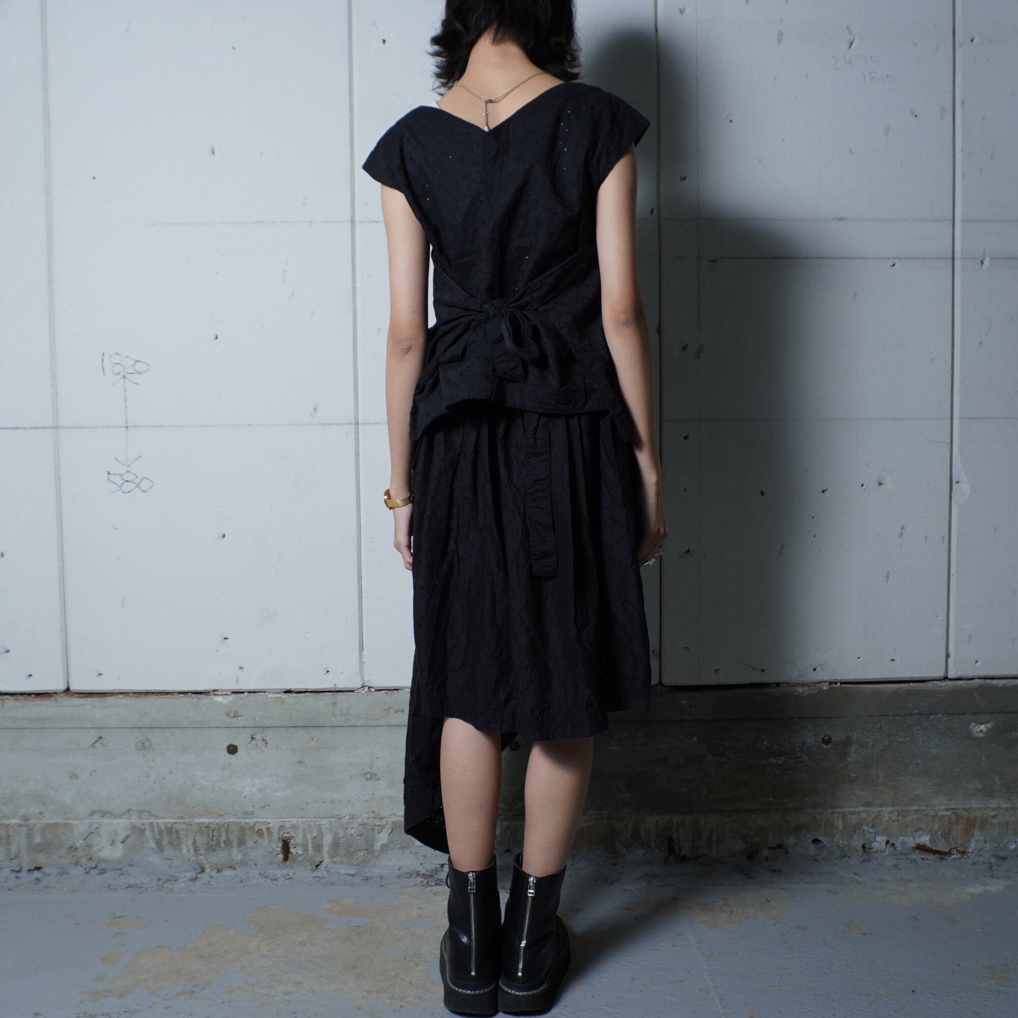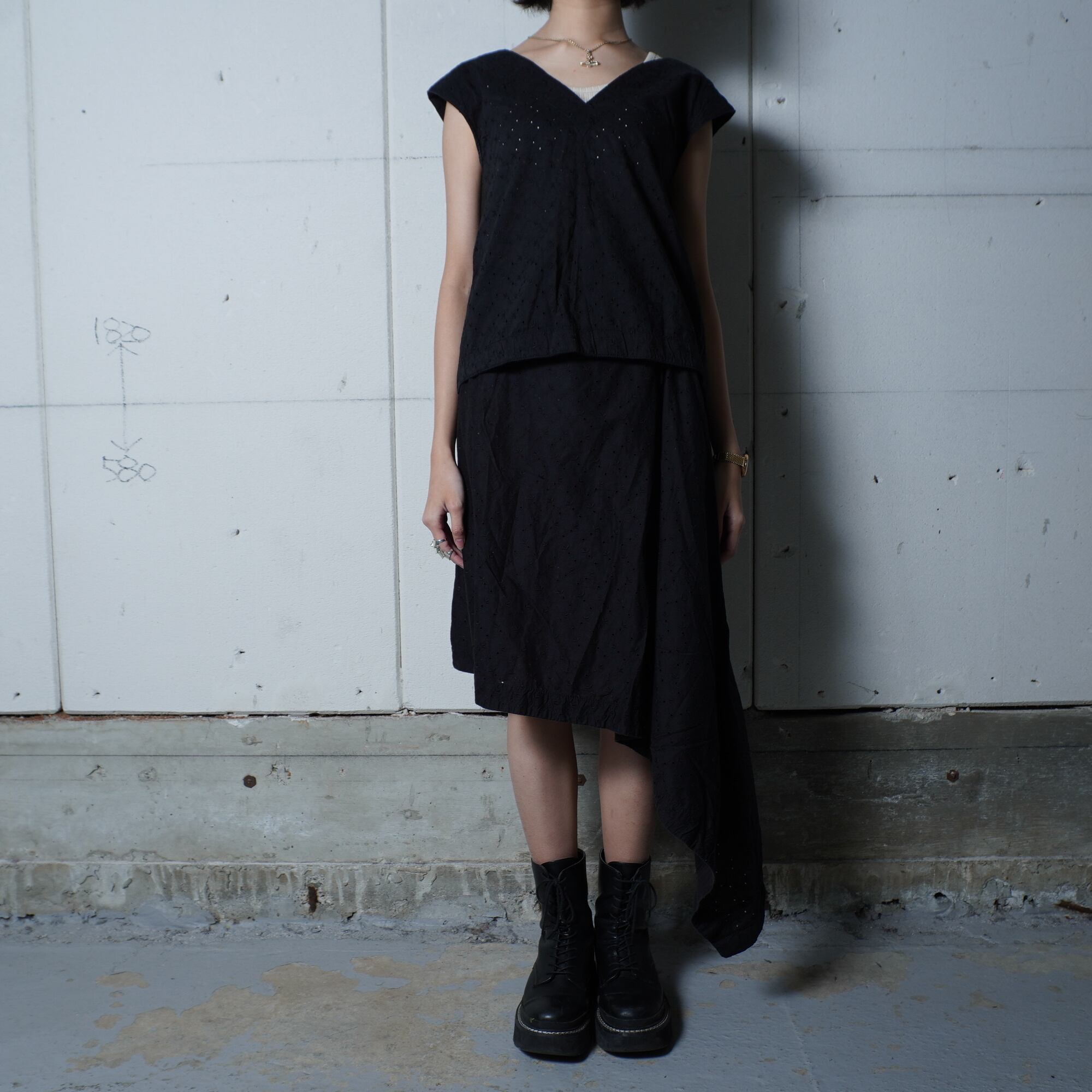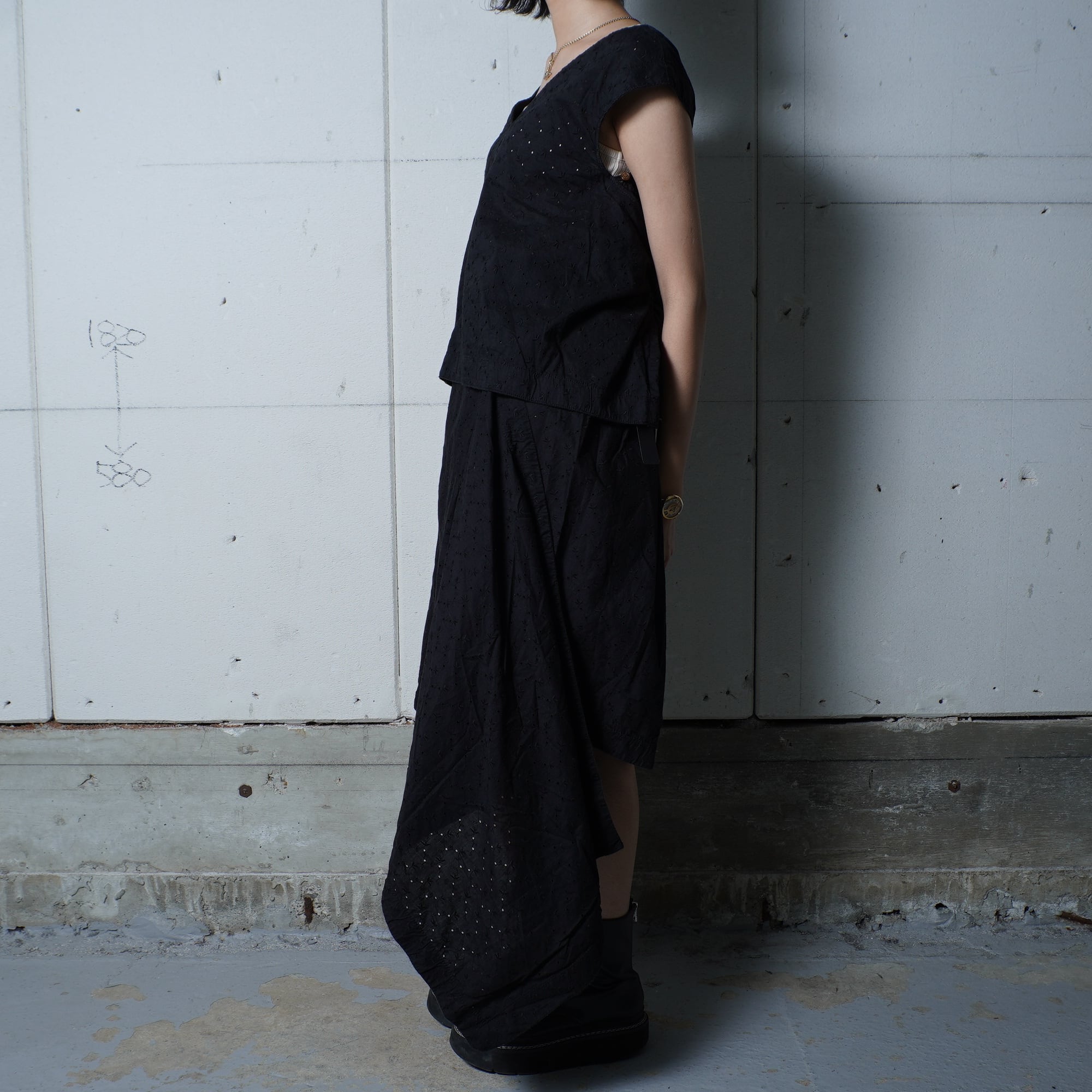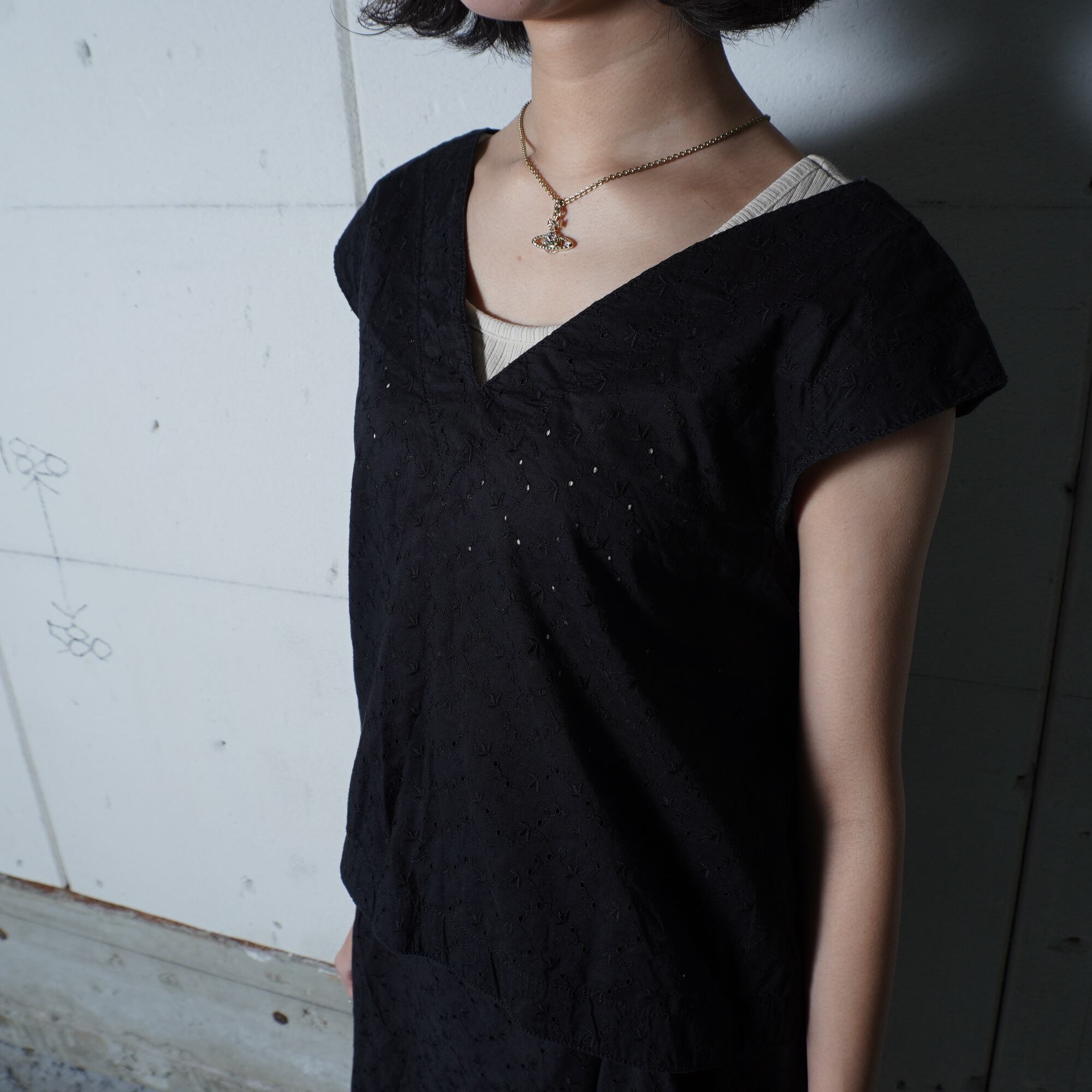 ・ノースリーブのトップスが涼しげな印象を与え、スカートと合わせて洗練されたスタイルを演出