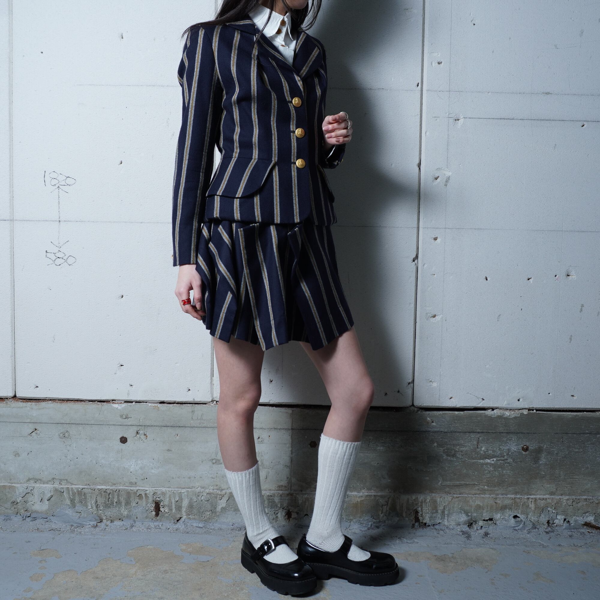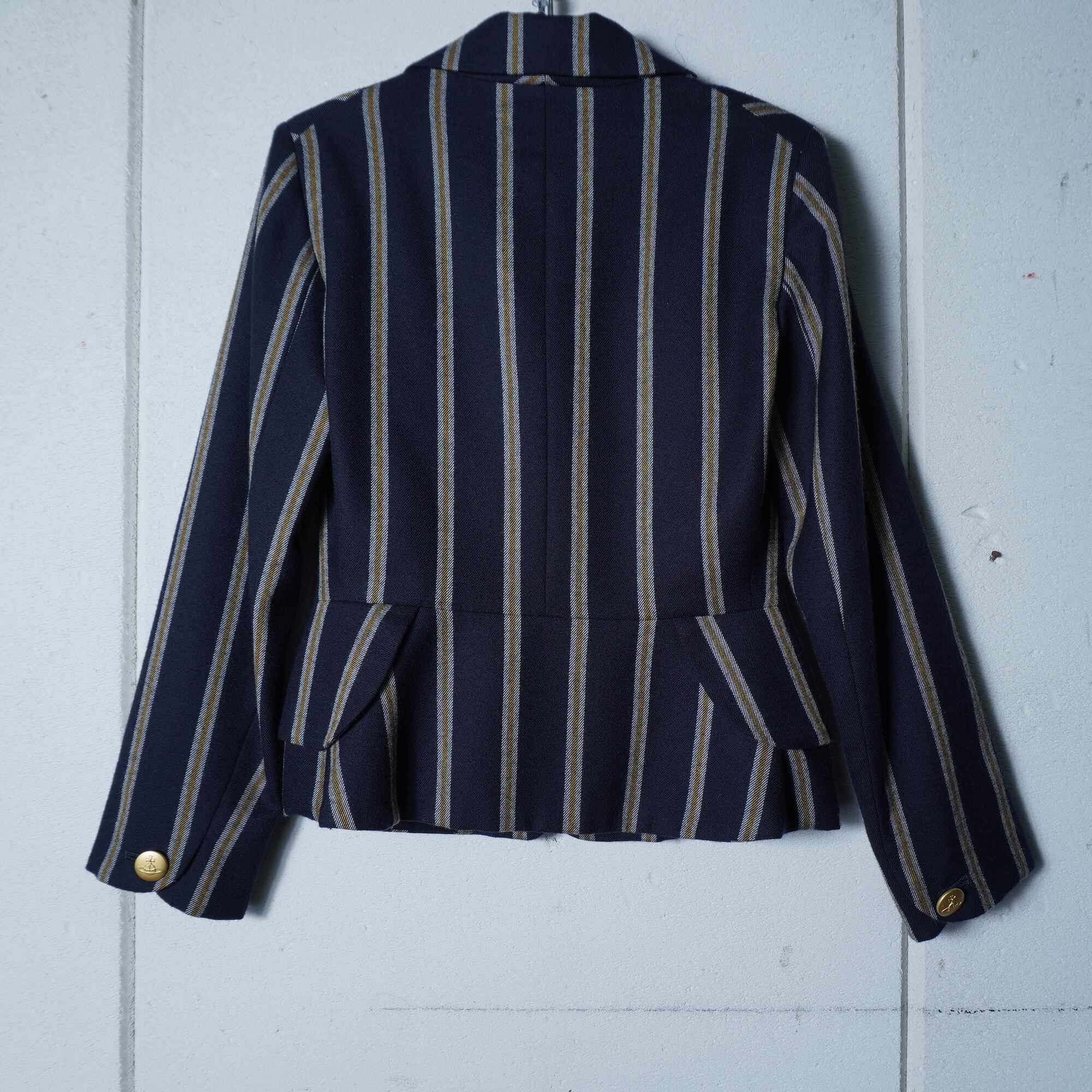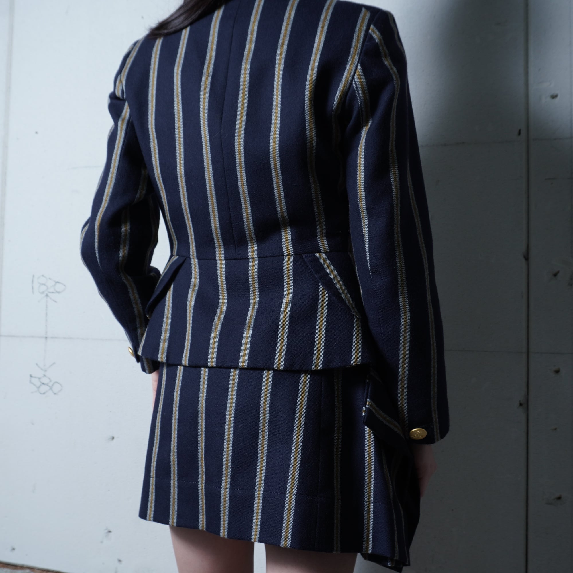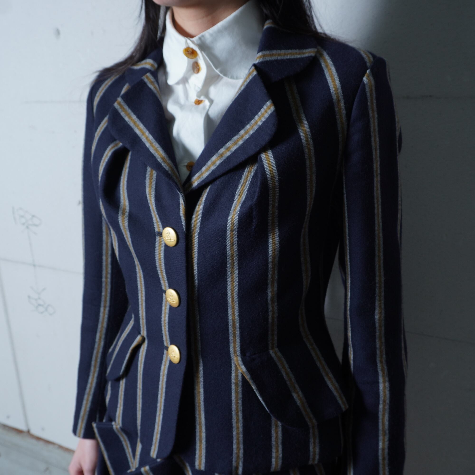 【Vivienne Westwood】ヴィヴィアンウエストウッド ”オーブロゴ金ボタン” WOOL100%ストライプジャケット・変形スカートセットアップ navy&white&yellow