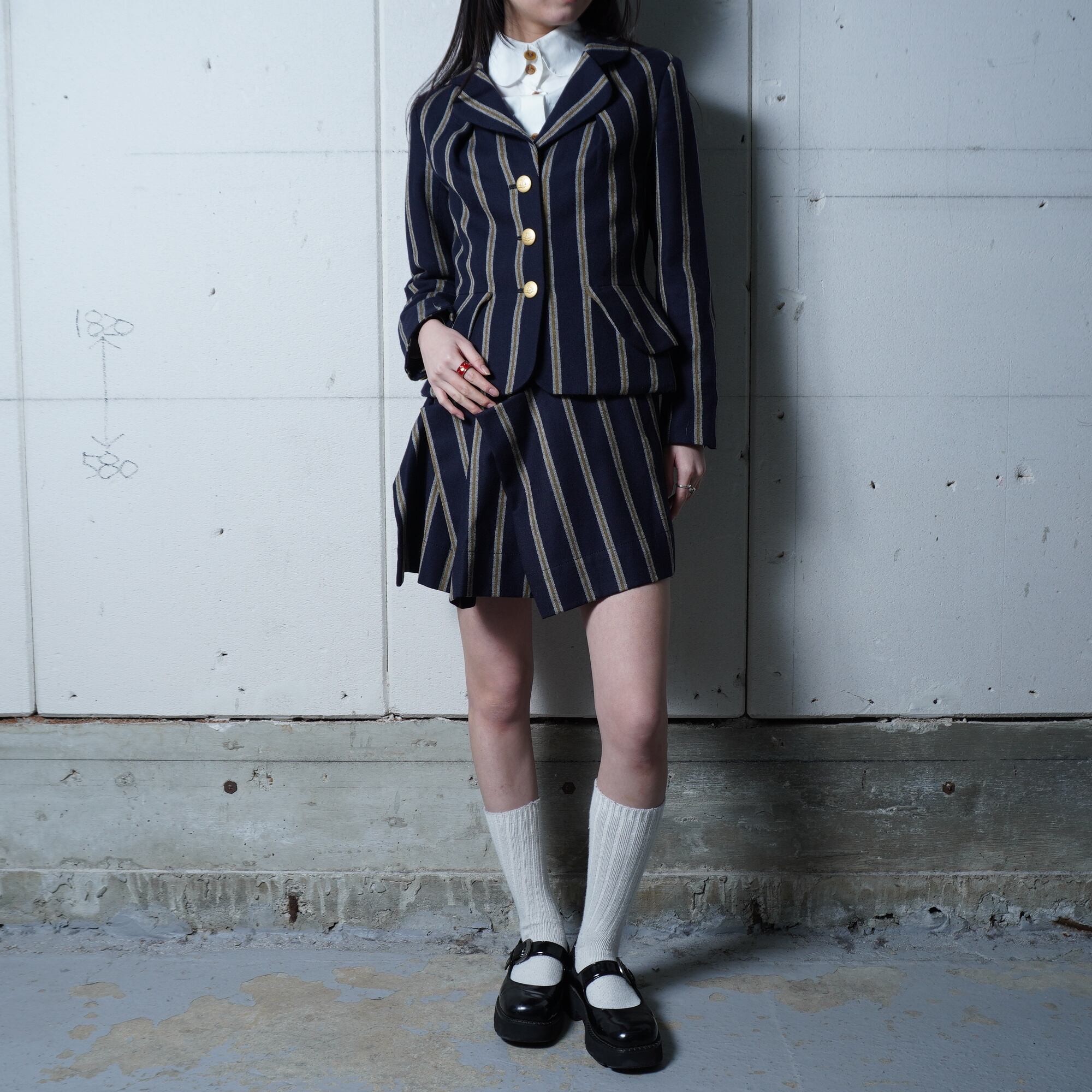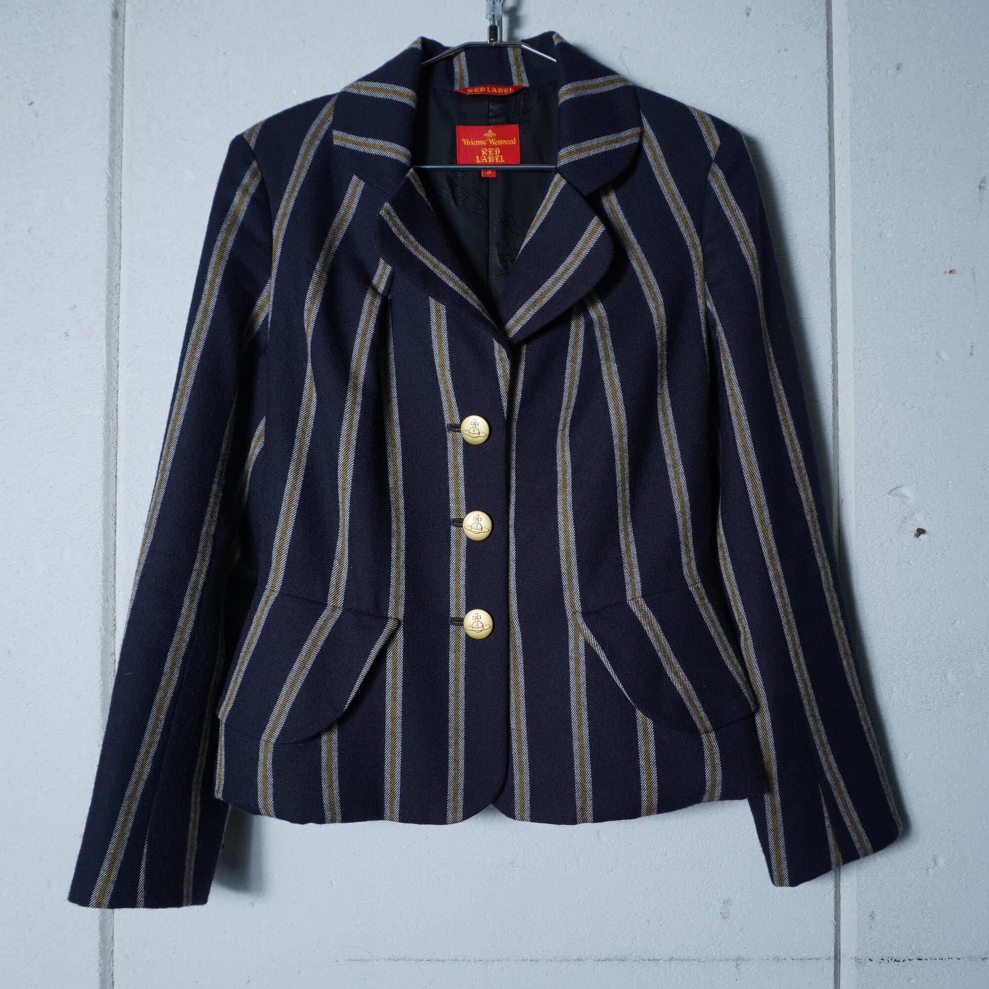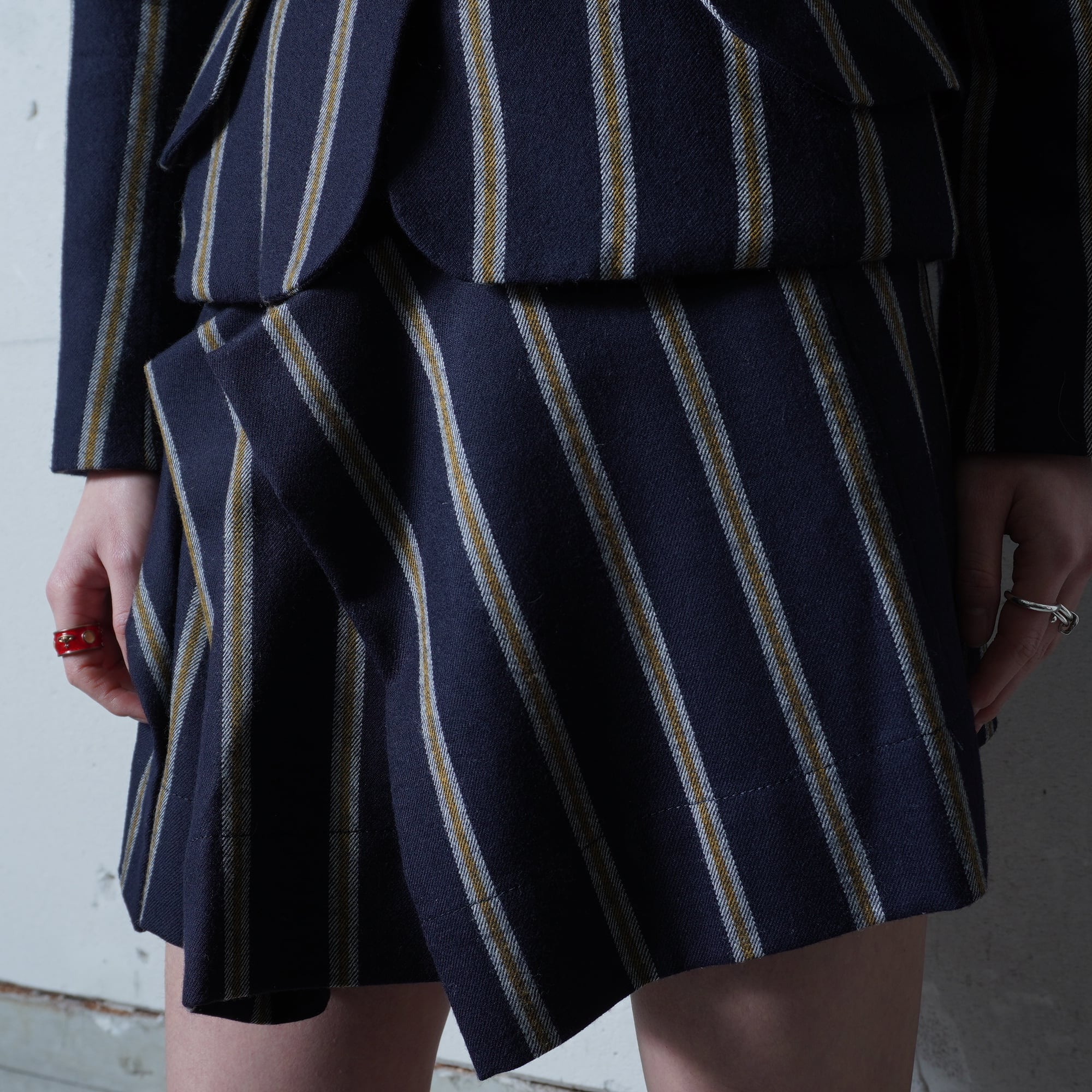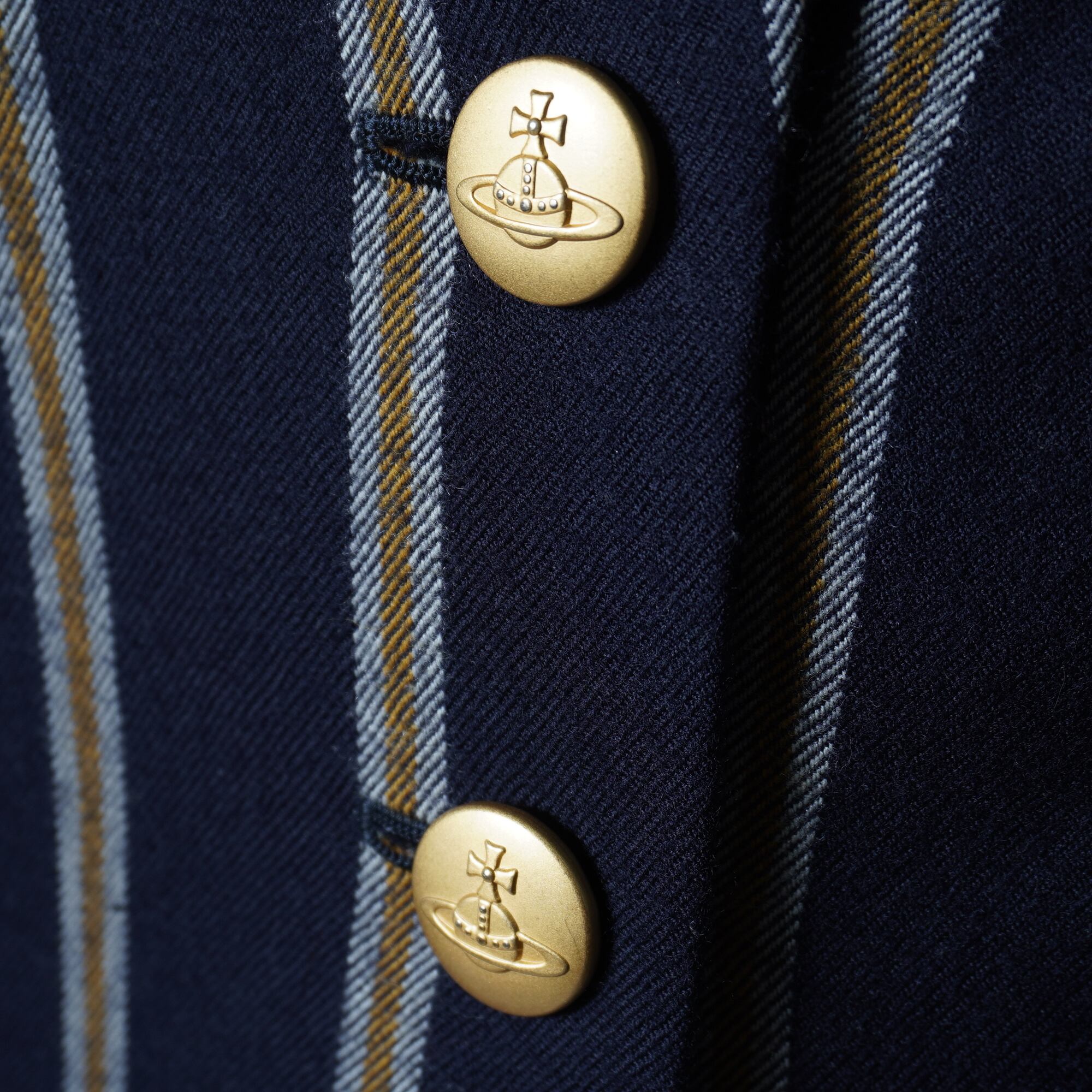 【Vivienne Westwood】ヴィヴィアンウエストウッド ”オーブロゴ金ボタン” WOOL100%ストライプジャケット・変形スカートセットアップ navy&white&yellow