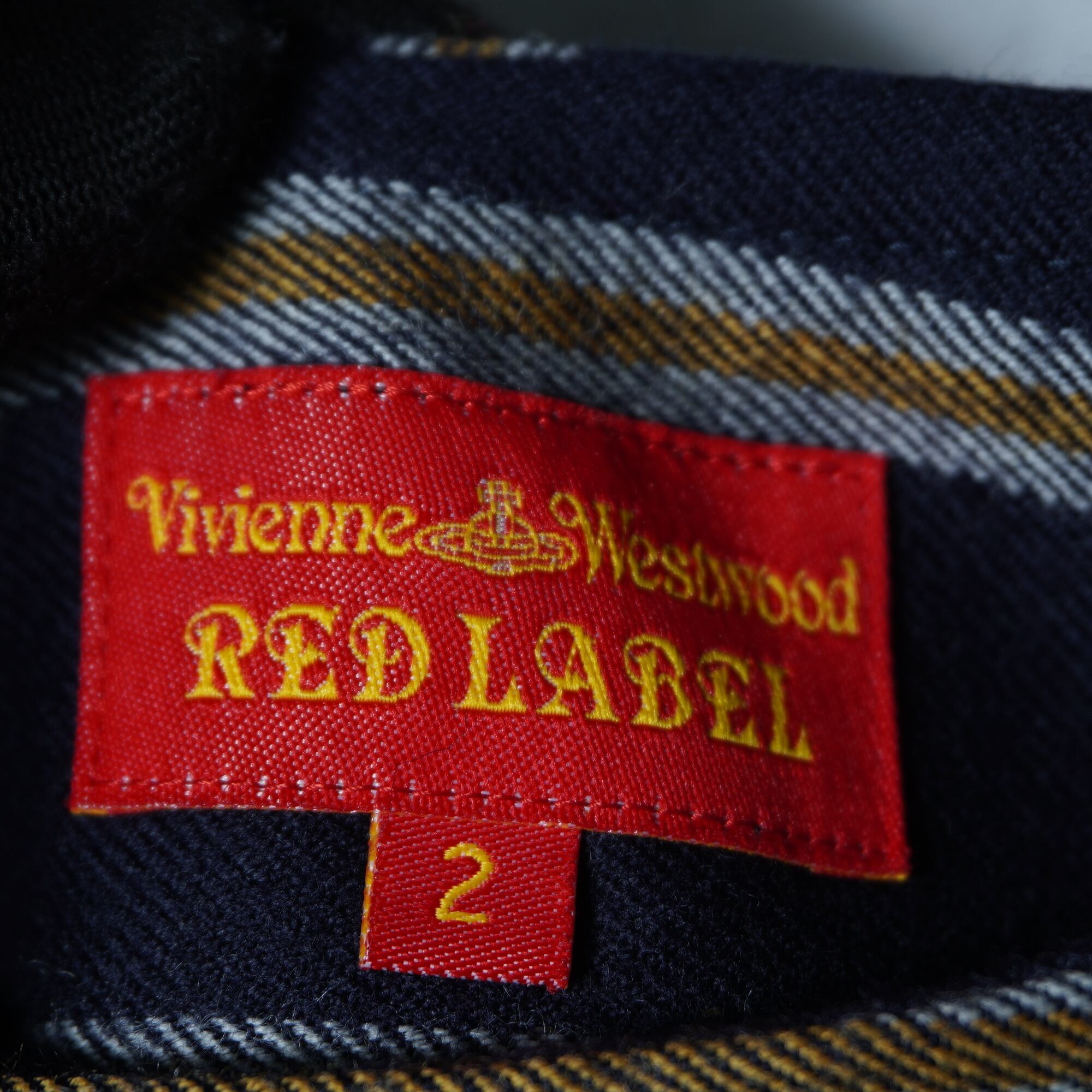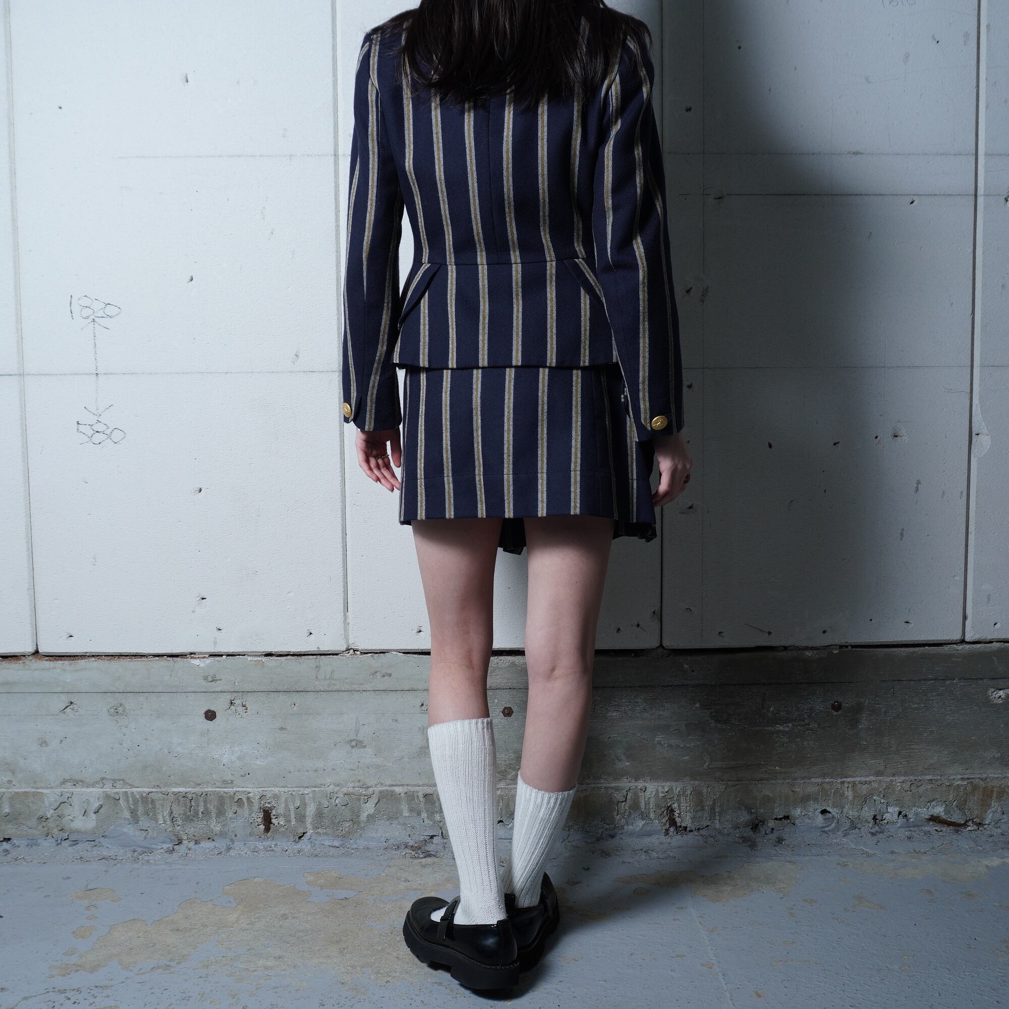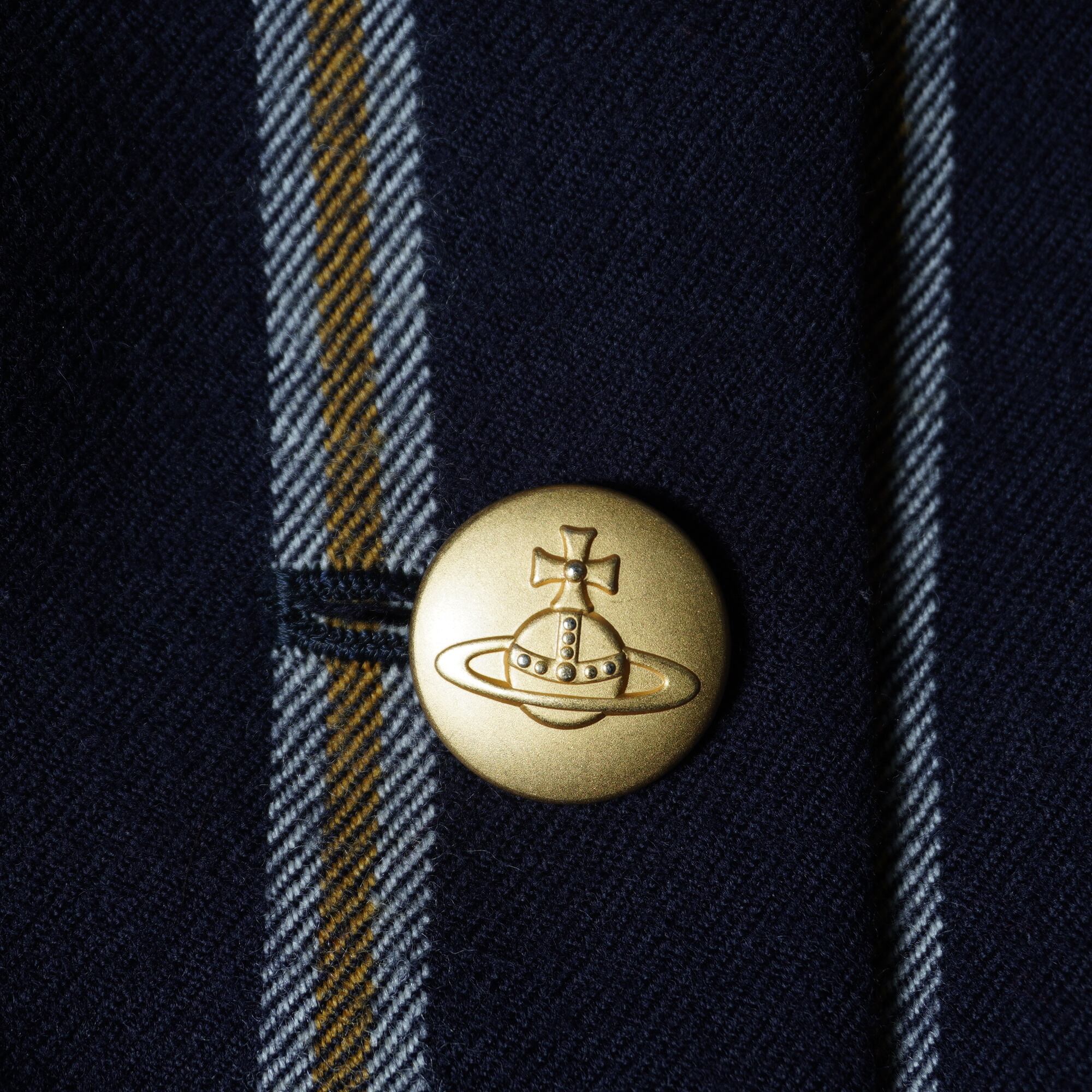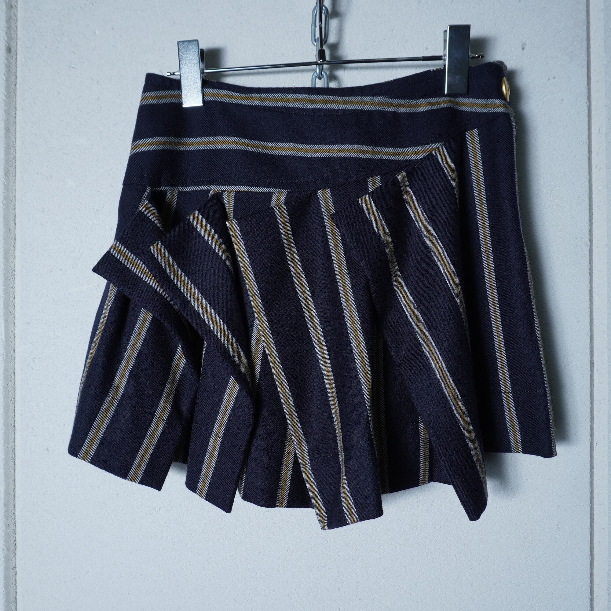 【Vivienne Westwood】ヴィヴィアンウエストウッド ”オーブロゴ金ボタン” WOOL100%ストライプジャケット・変形スカートセットアップ navy&white&yellow