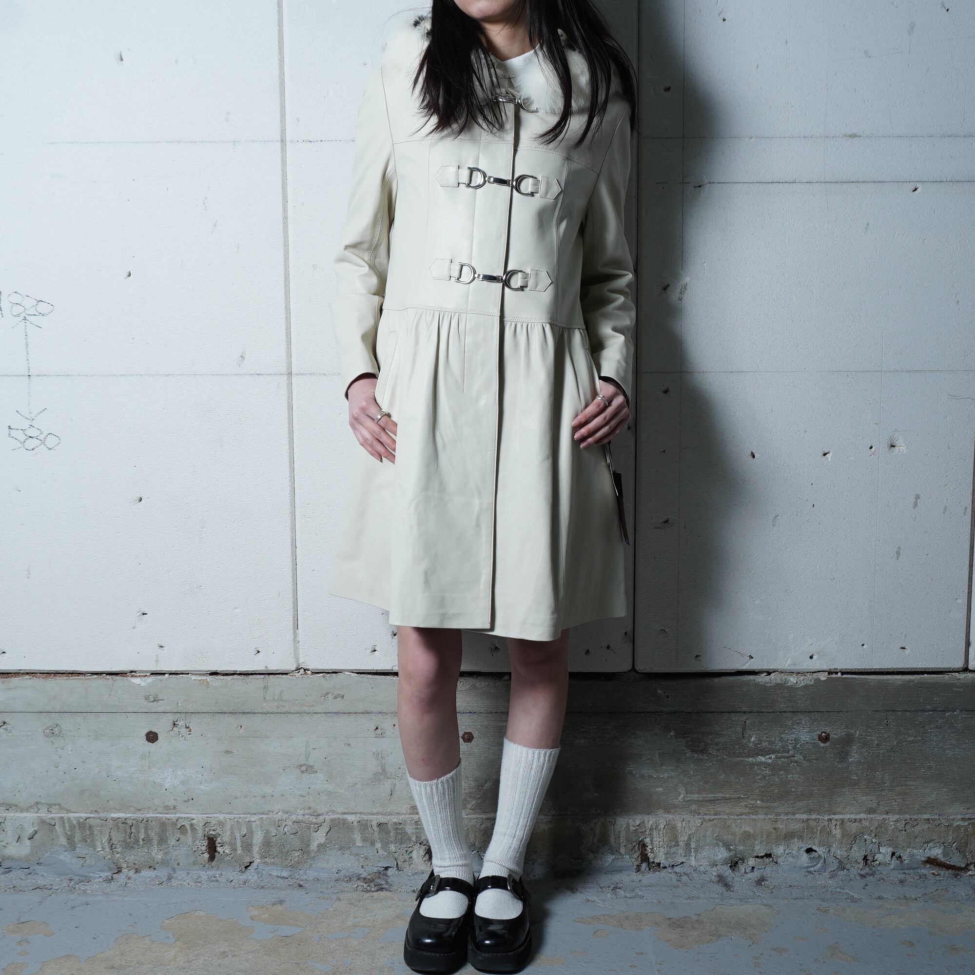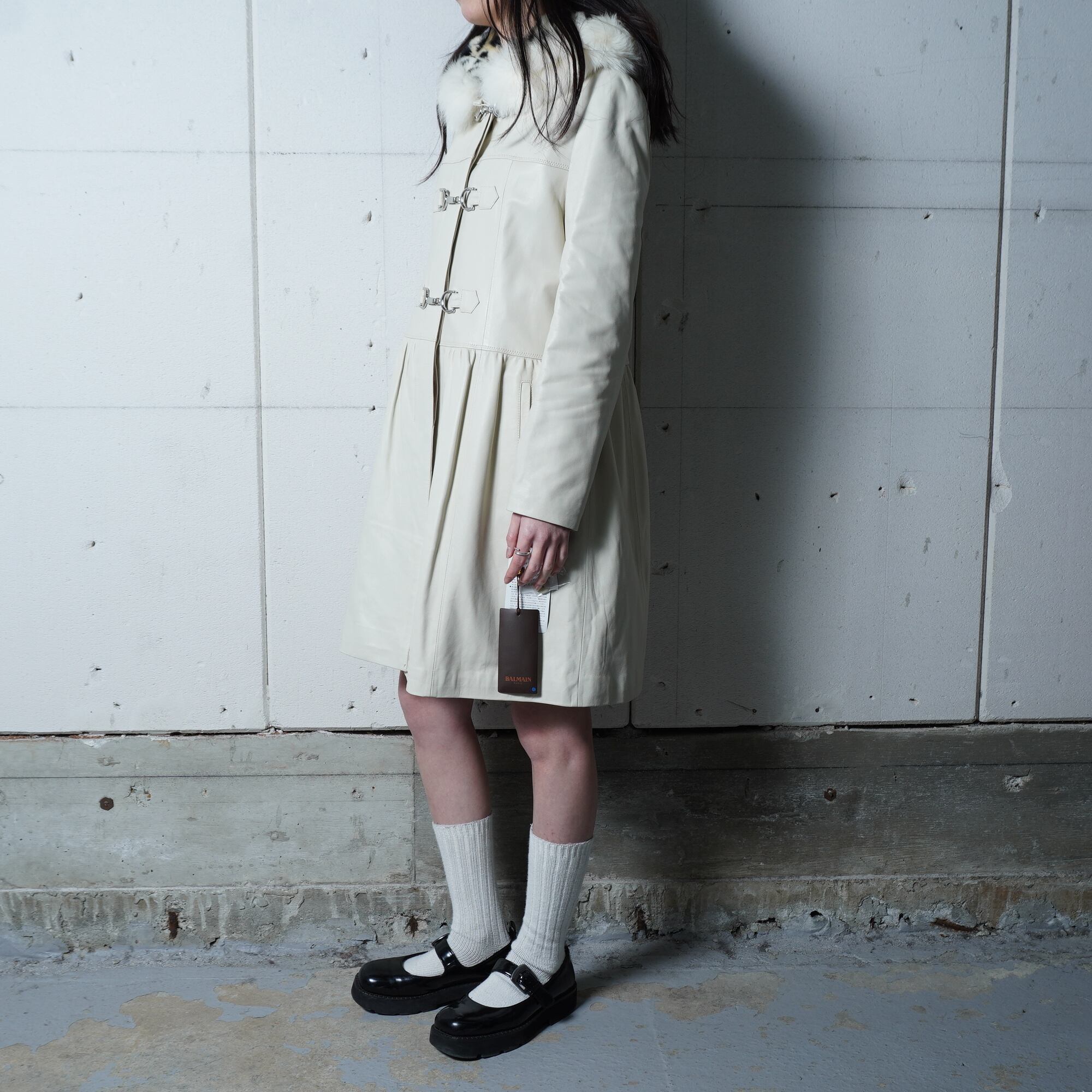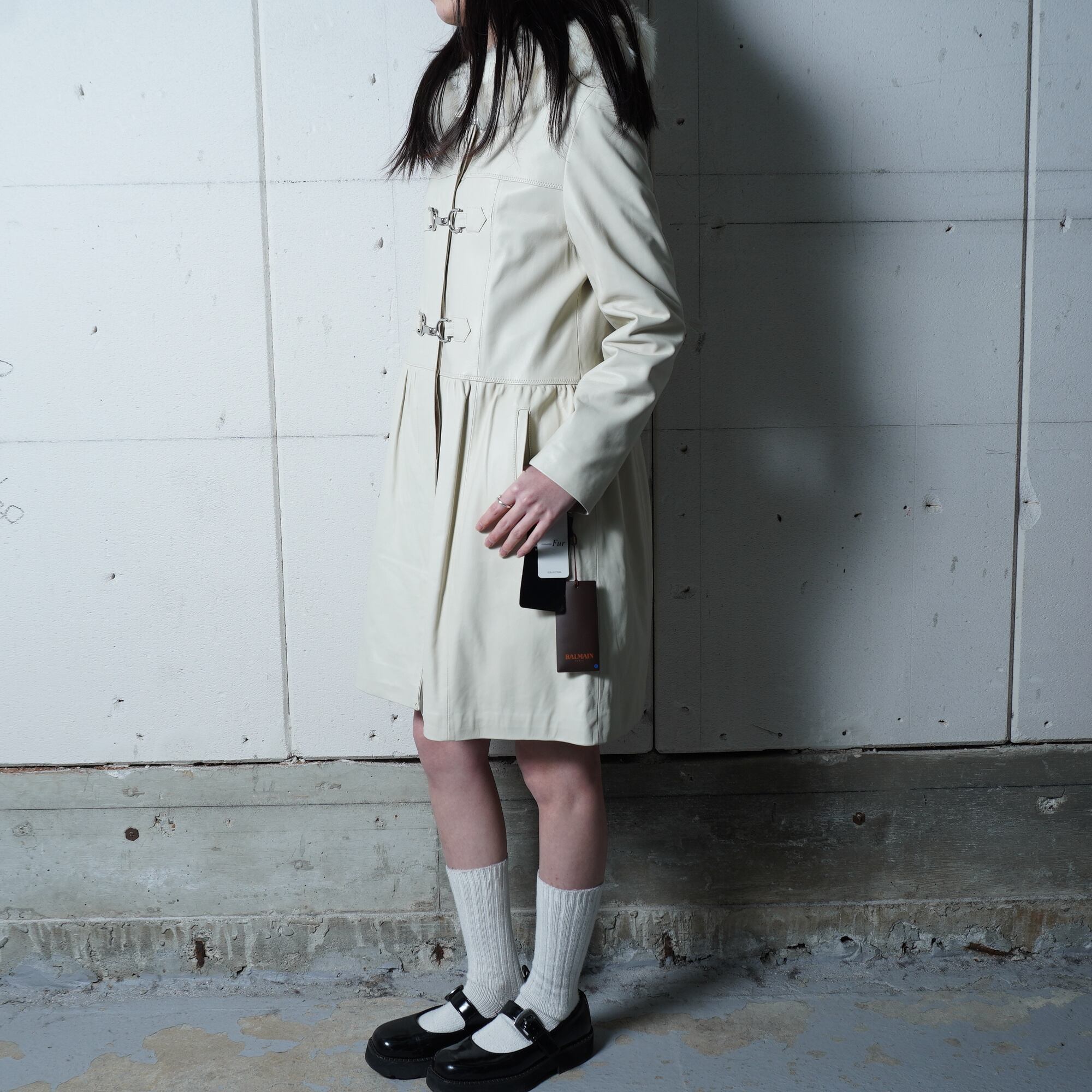 【BALMAIN】バルマン 極美品 タグ付きリアルフォッタスファーフード ラムレザーロングコート ivory