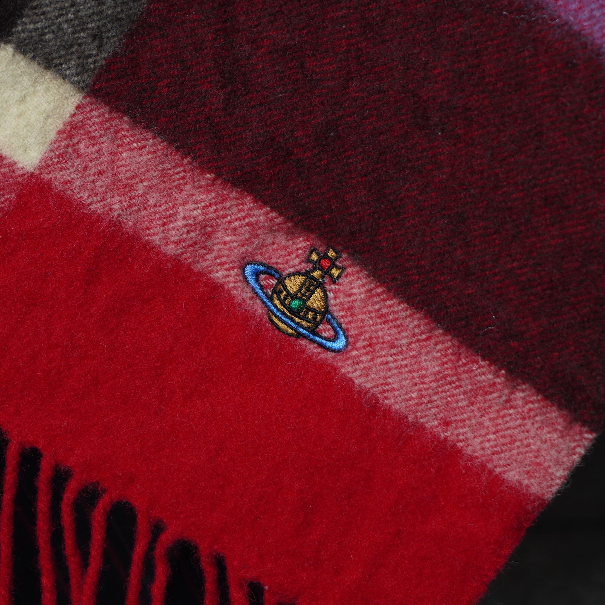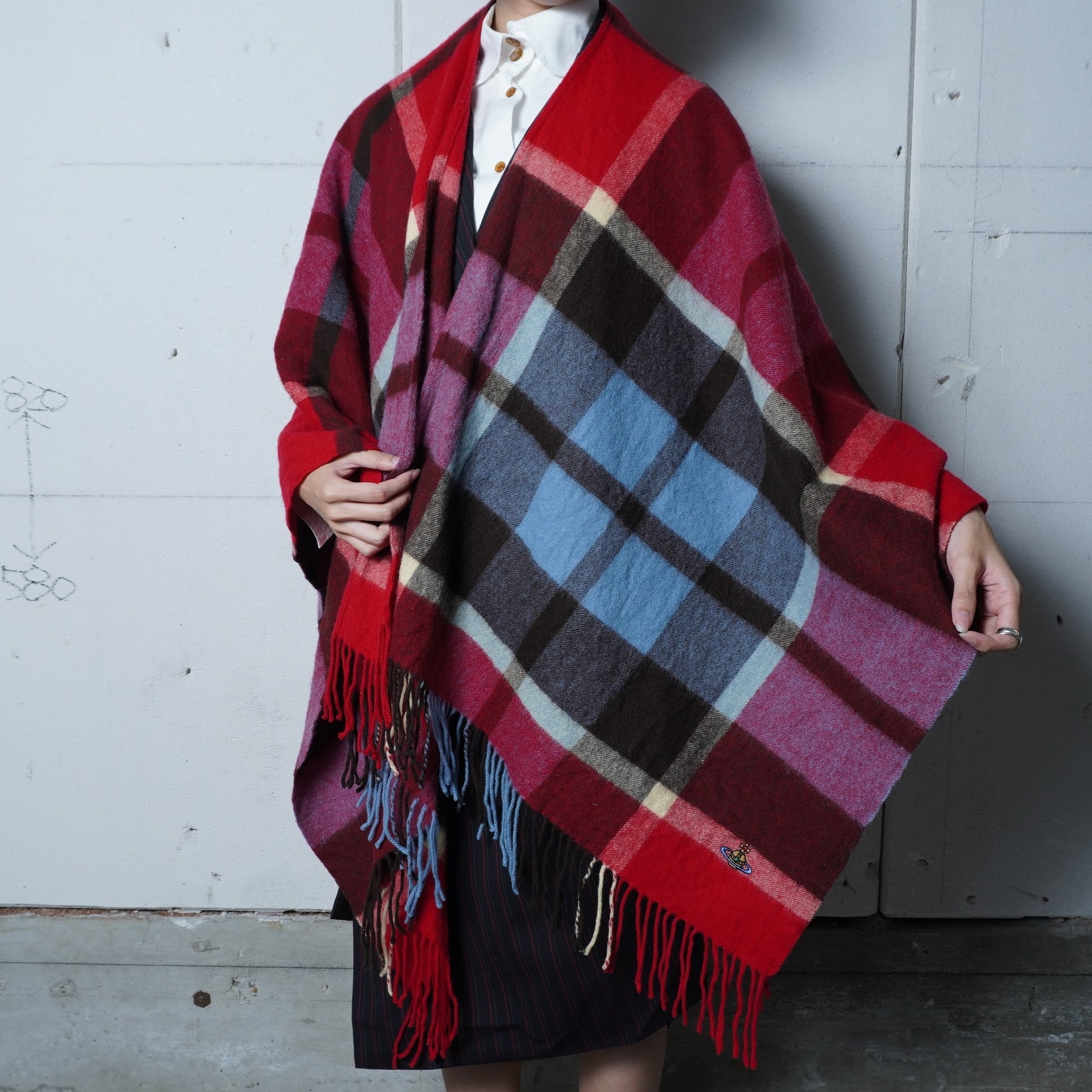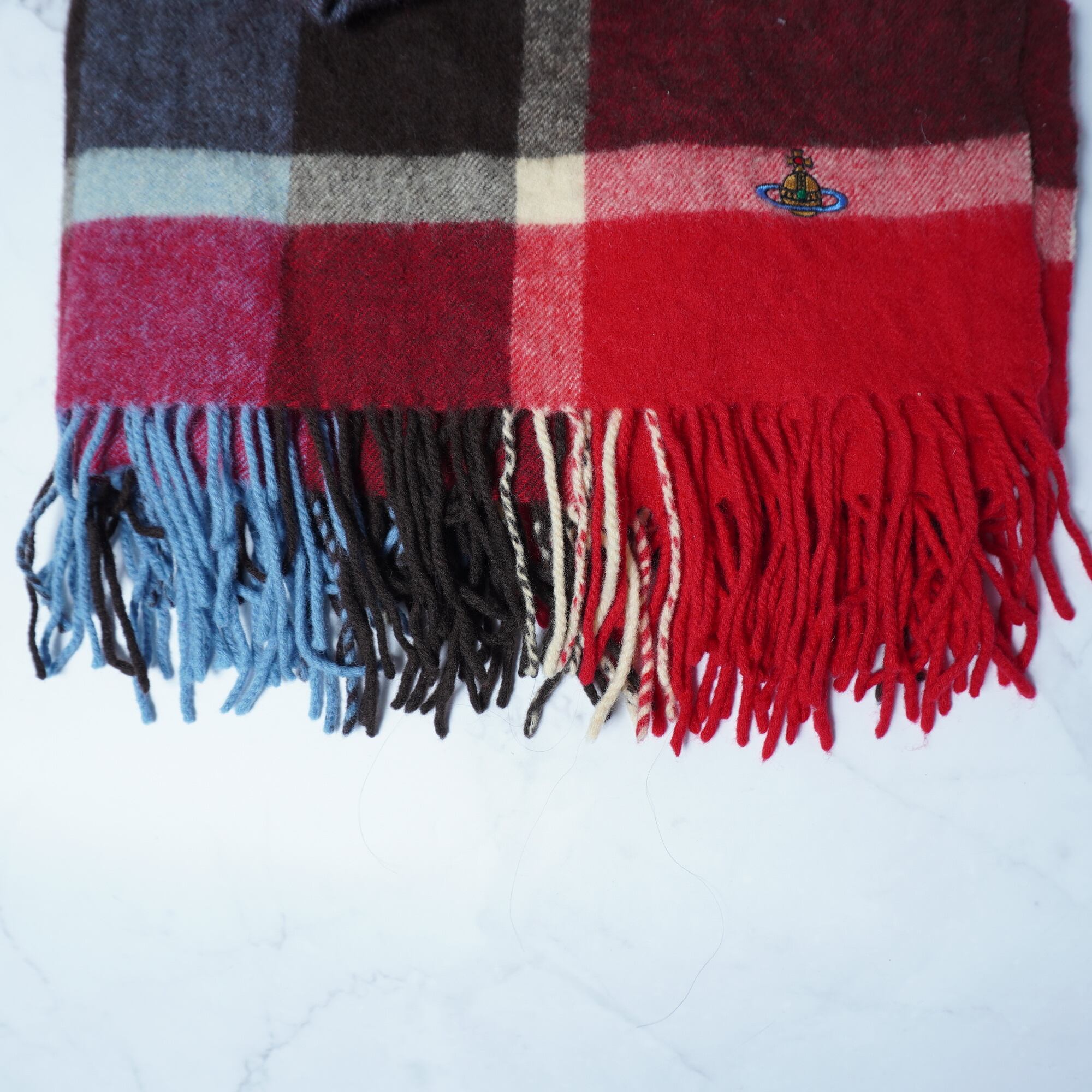 【Vivienne Westwood】ヴィヴィアンウエストウッド ”オーブロゴ刺繍” WOOL100%チェック柄ショールマフラー red&blue&brown