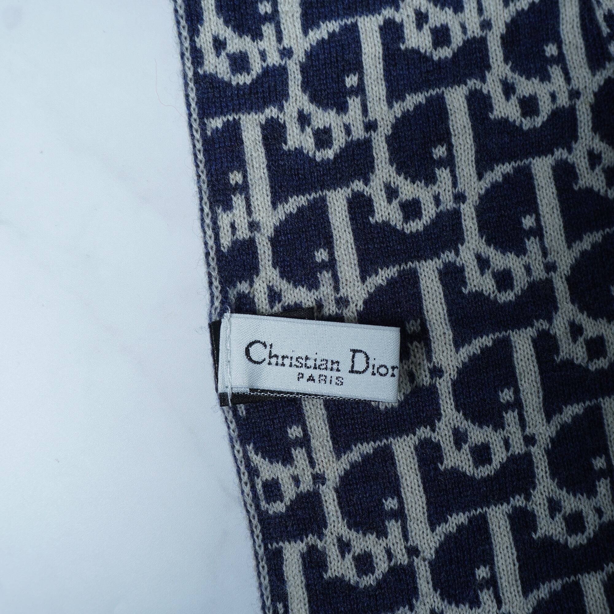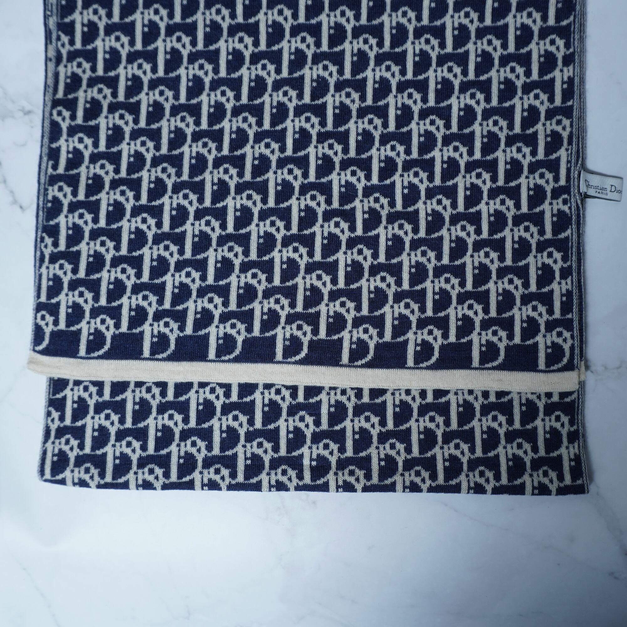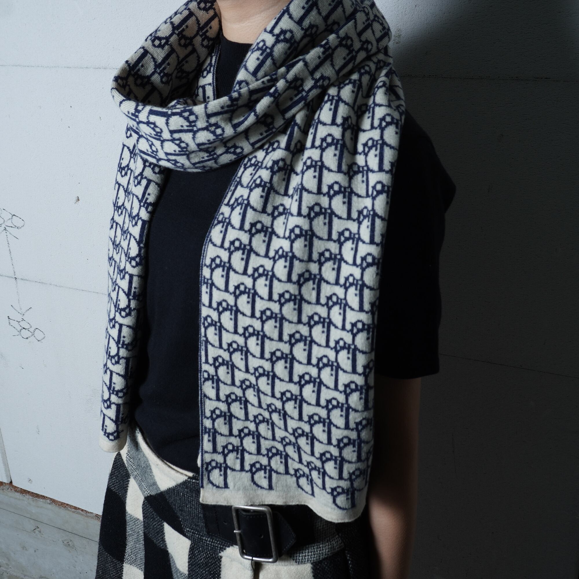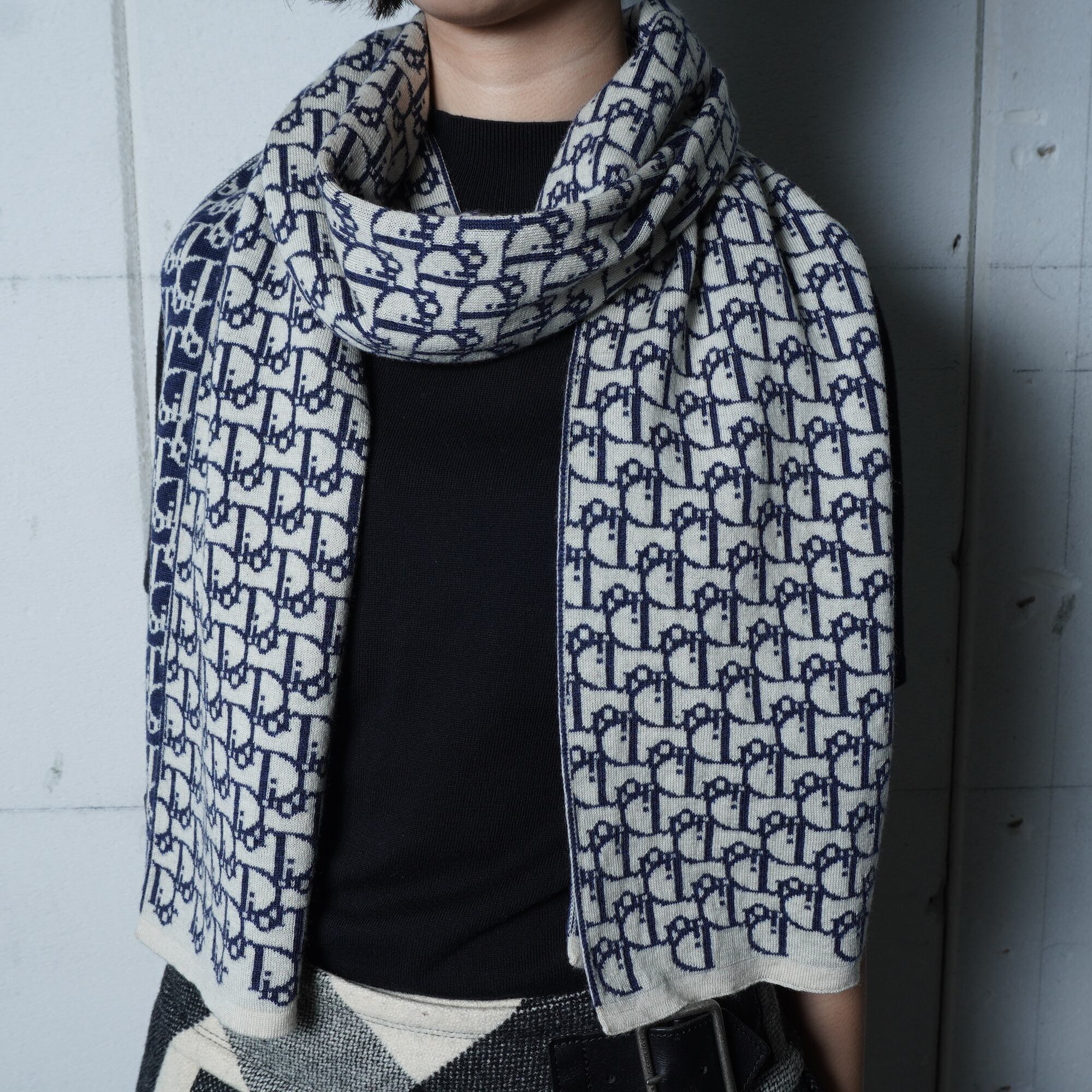【Christian Dior】クリスチャンディオール トロッター総柄 ウール100%マフラー navy&whiyte