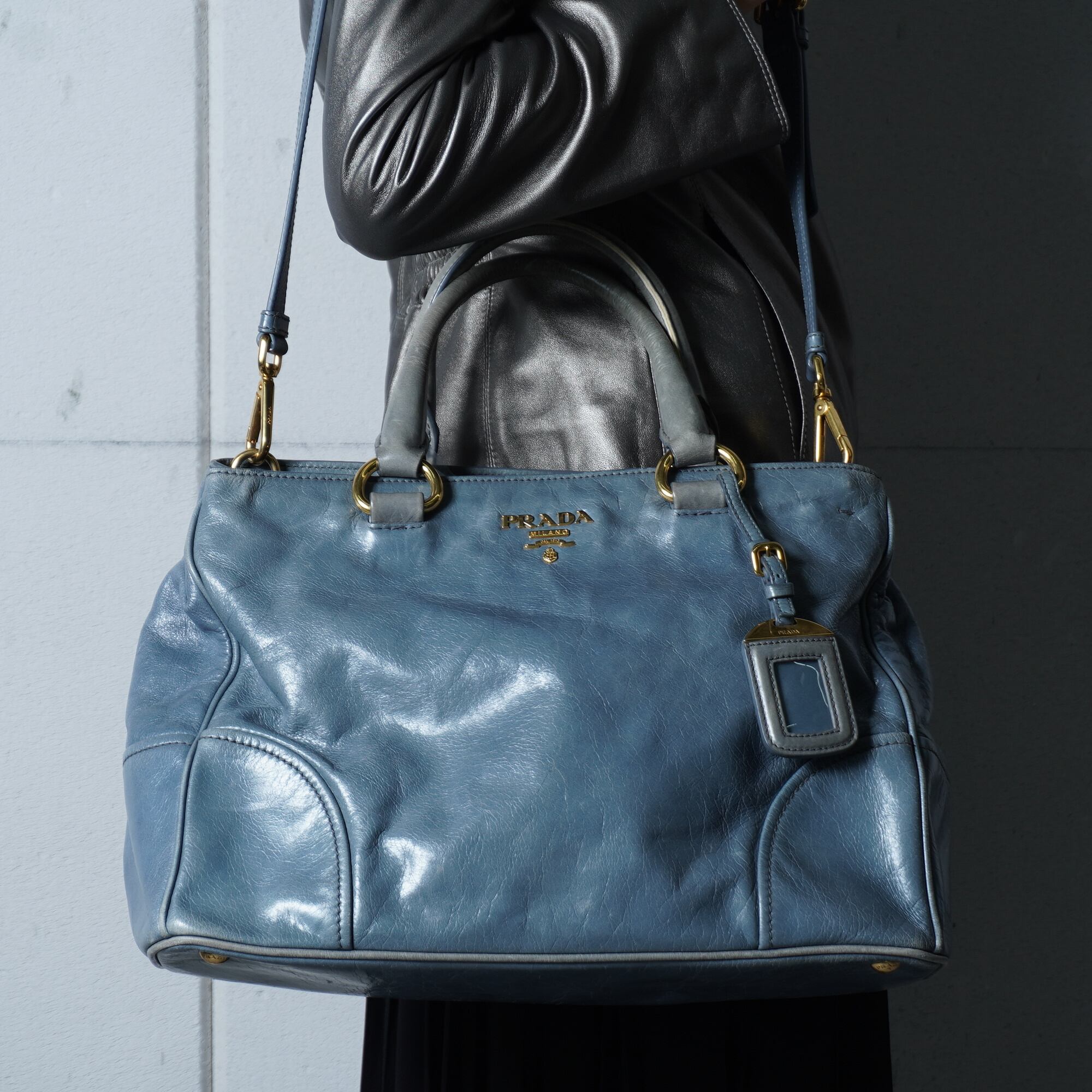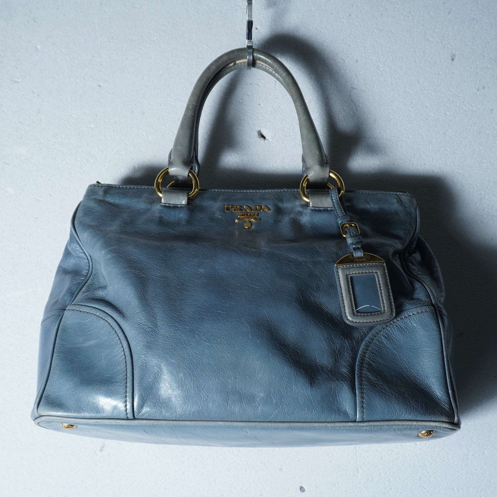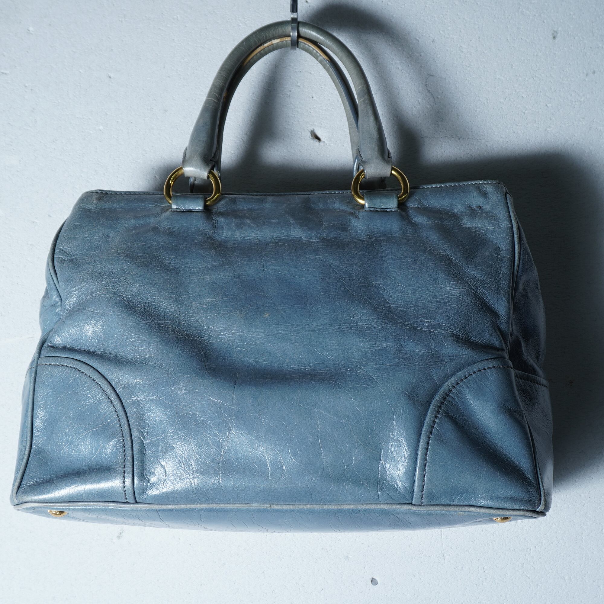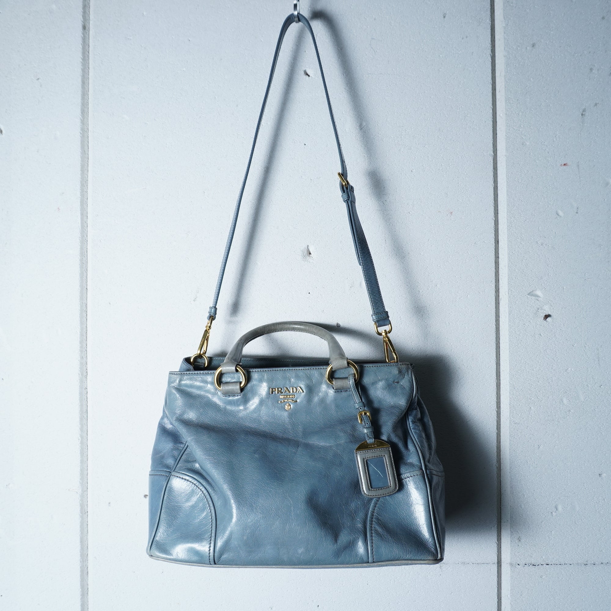 【PRADA】プラダ ”ゴールドロゴ” ヴィテッロシャインカウレザーショルダーハンドバッグ light blue