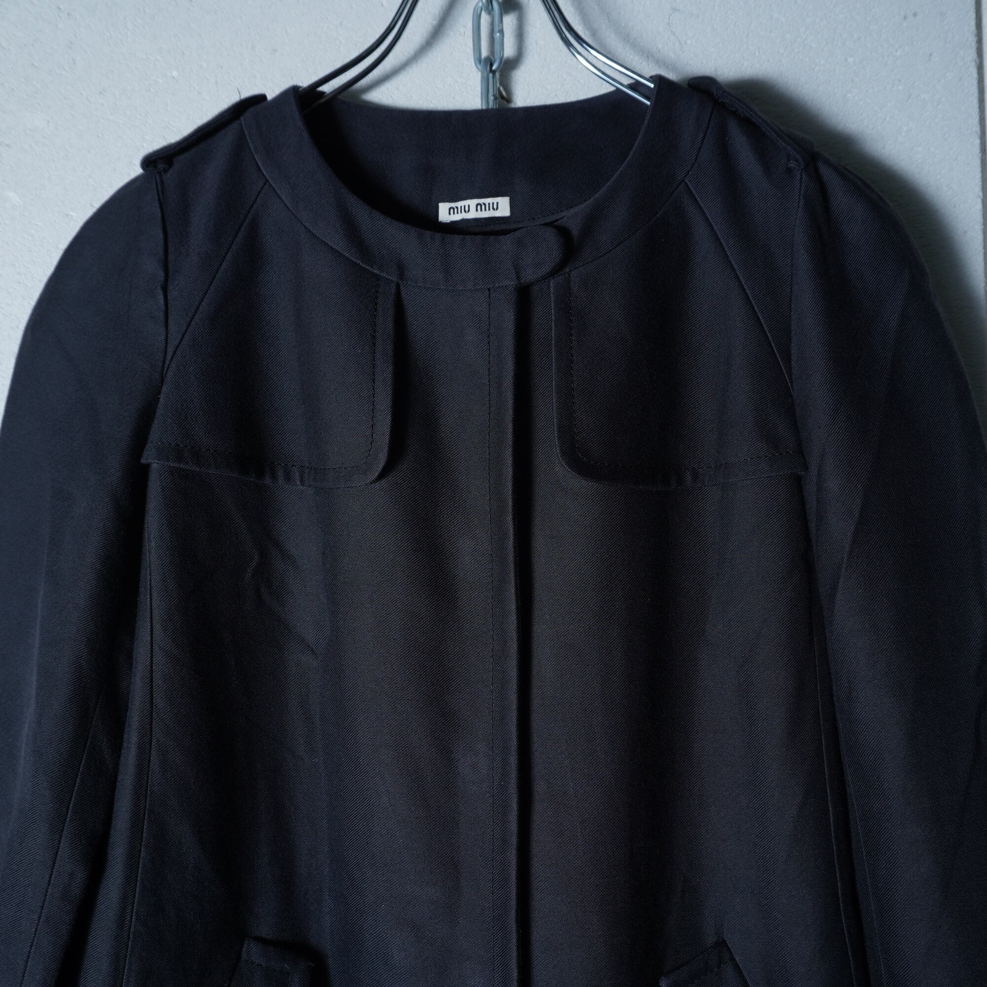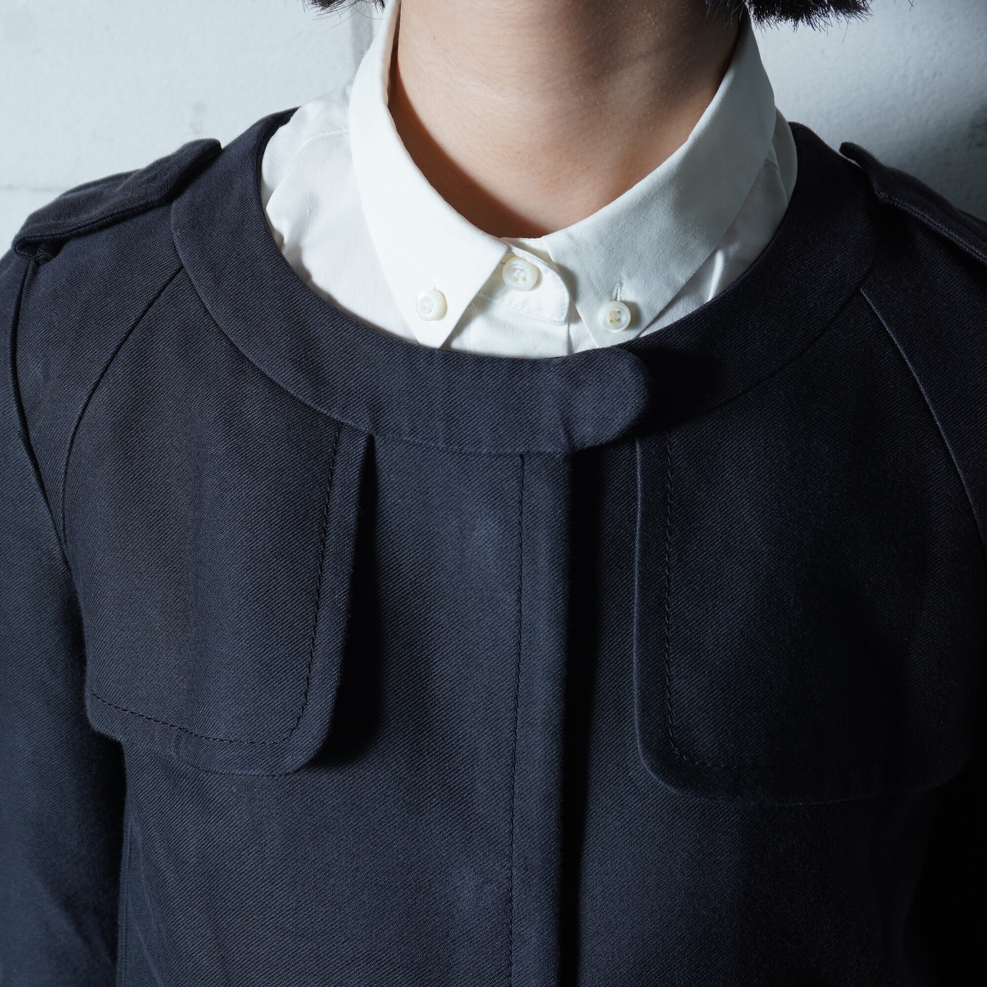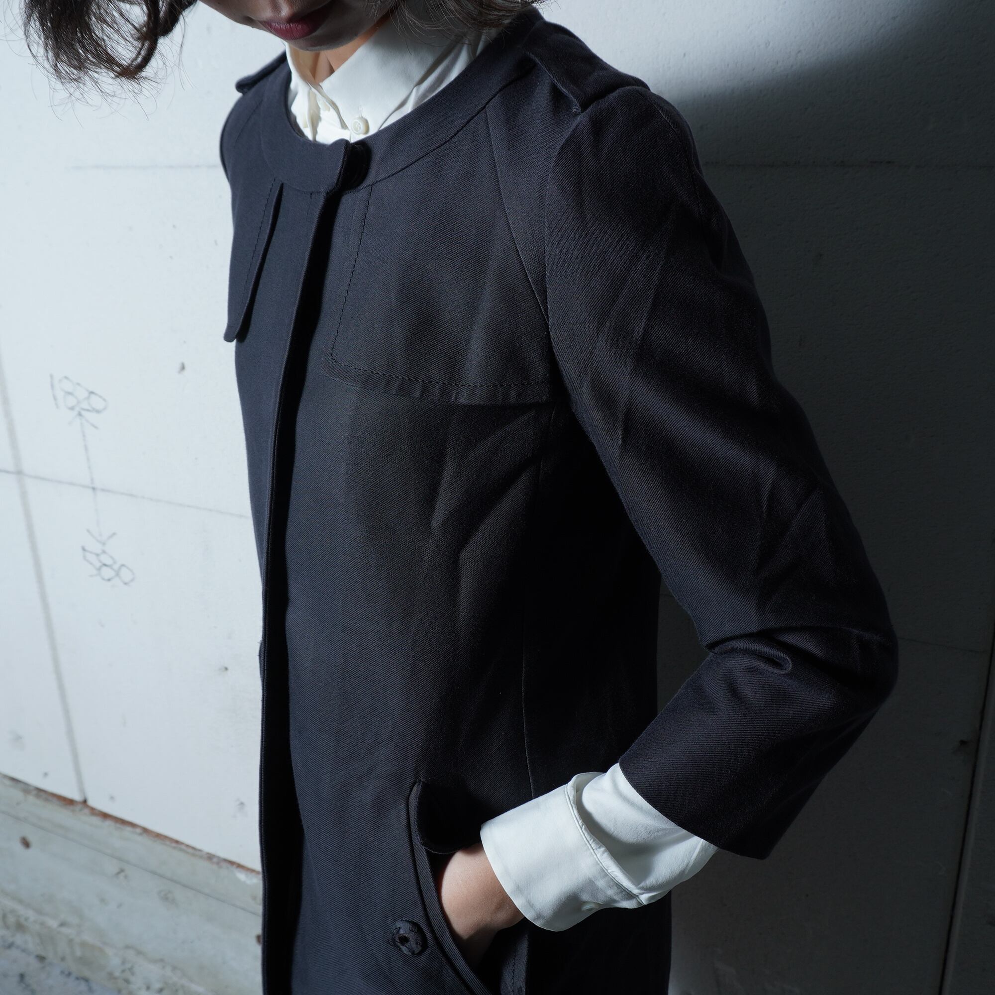 ・ノーカラー仕立てが上品さを引き立てる
