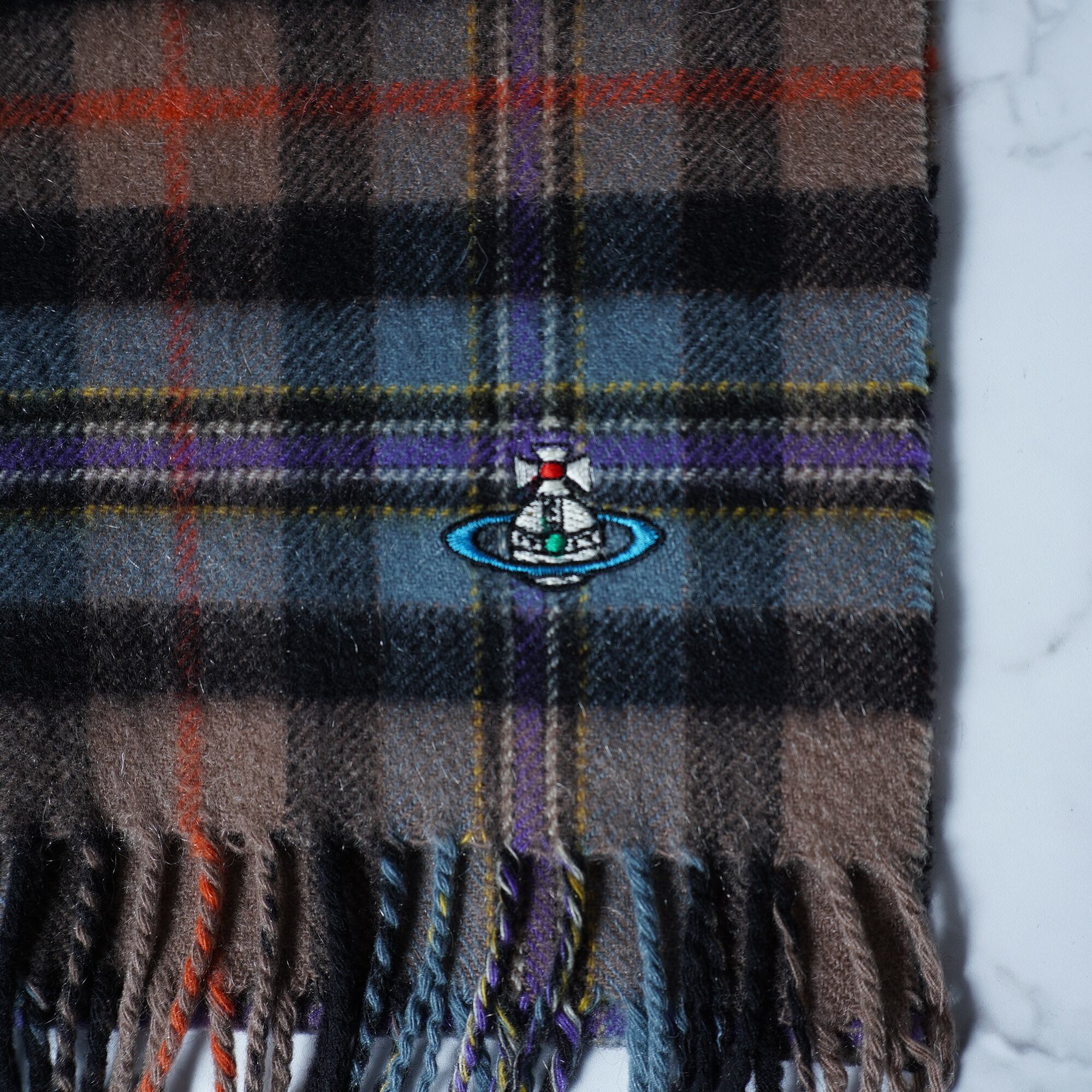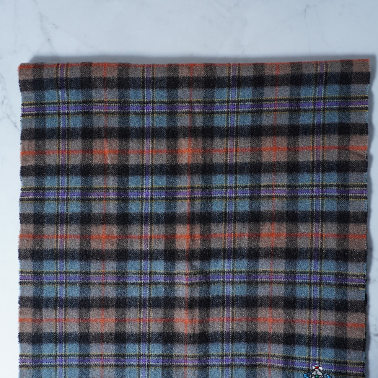 【Vivienne Westwood】ヴィヴィアンウエストウッド オーブロゴ刺繍 チェック柄カシミヤマフラー purple&brown&black