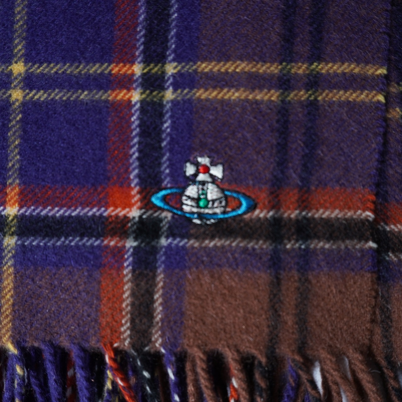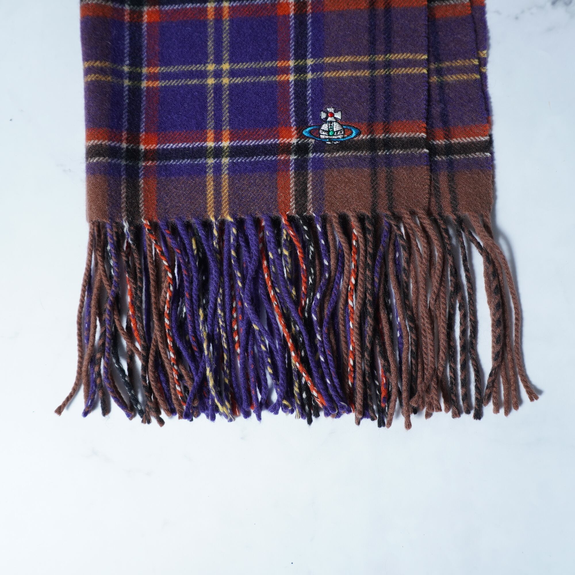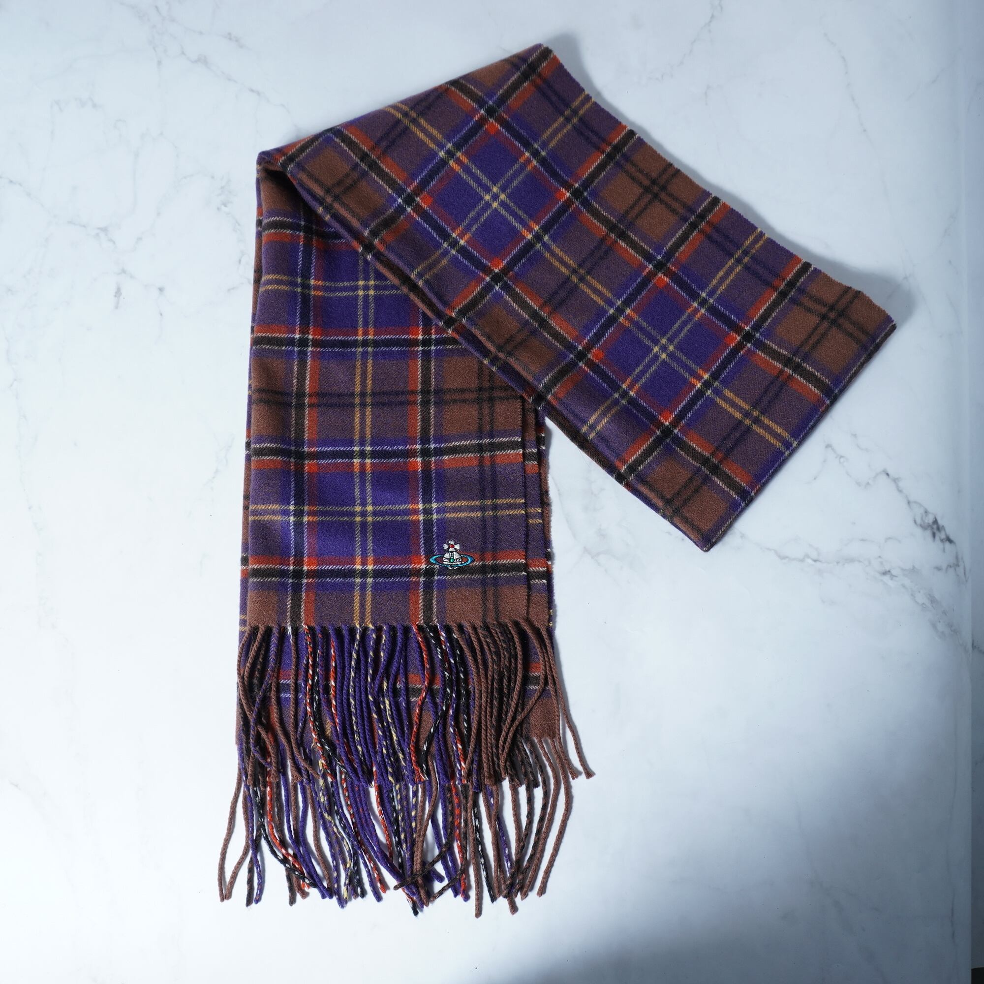 【Vivienne Westwood】ヴィヴィアンウエストウッド オーブロゴ刺繍 タータンチェックカシミアマフラー brown&perple&orange
