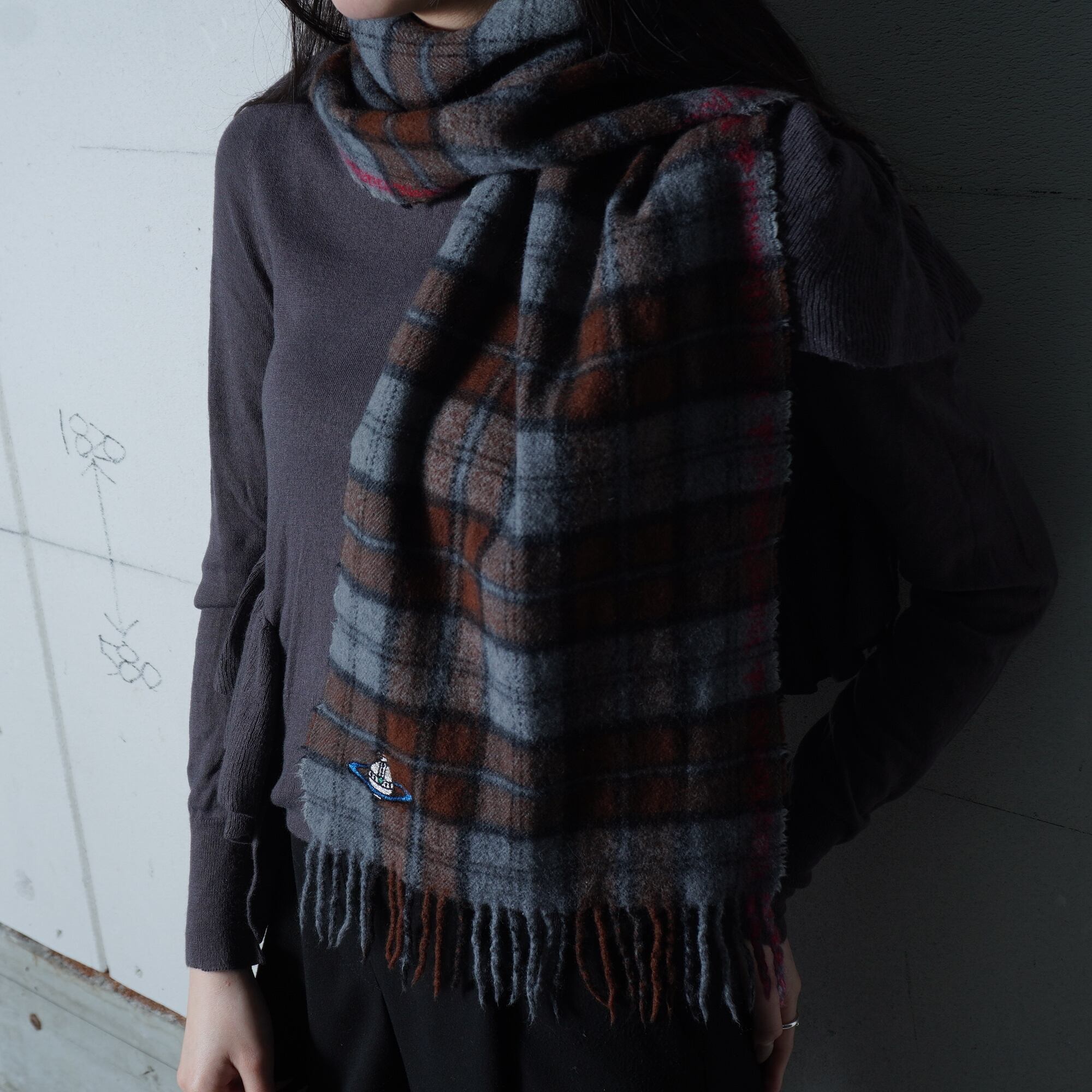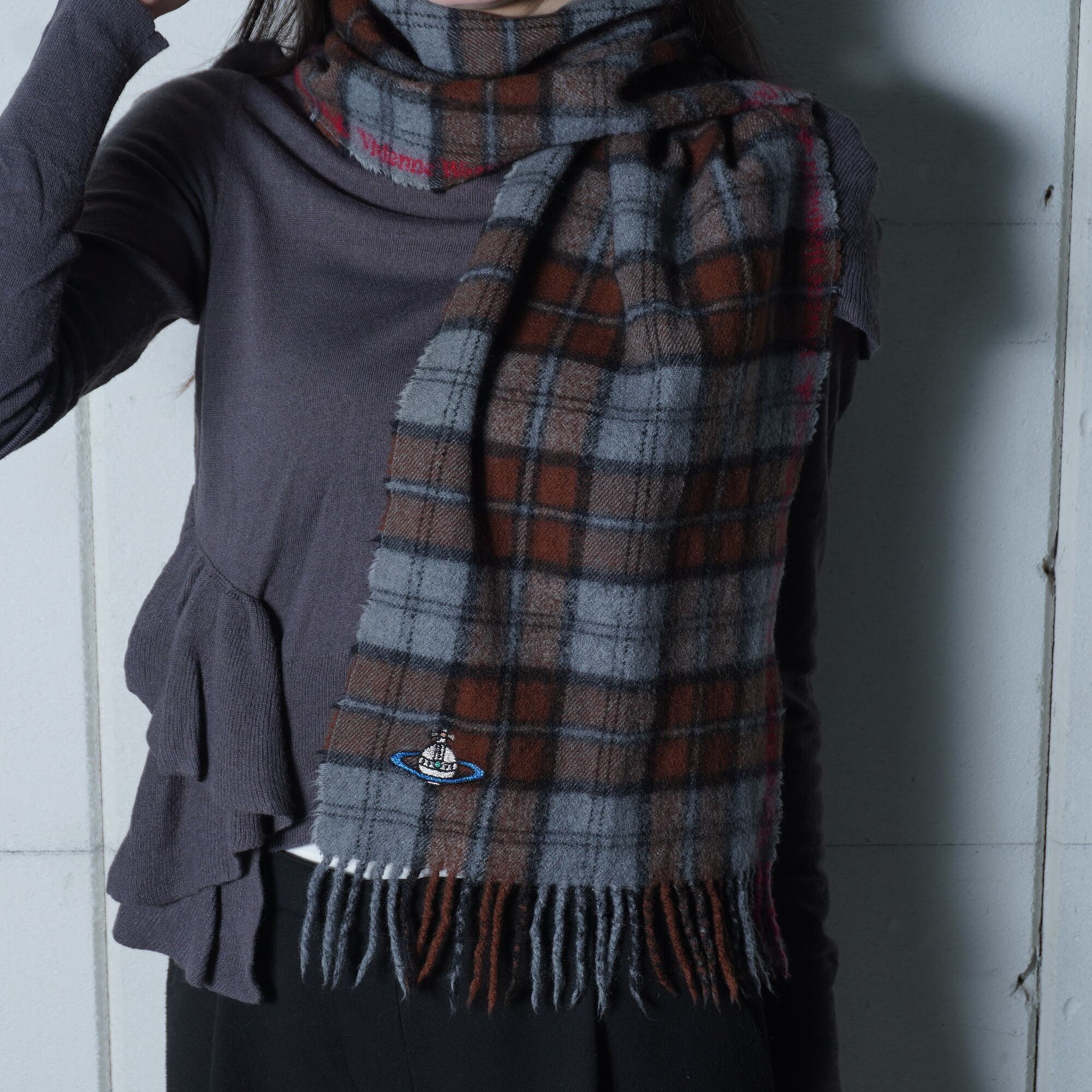 【Vivienne Westwood】ヴィヴィアンウエストウッド オーブ・ロゴライン刺繍フリンジマフラー brown&gray&black