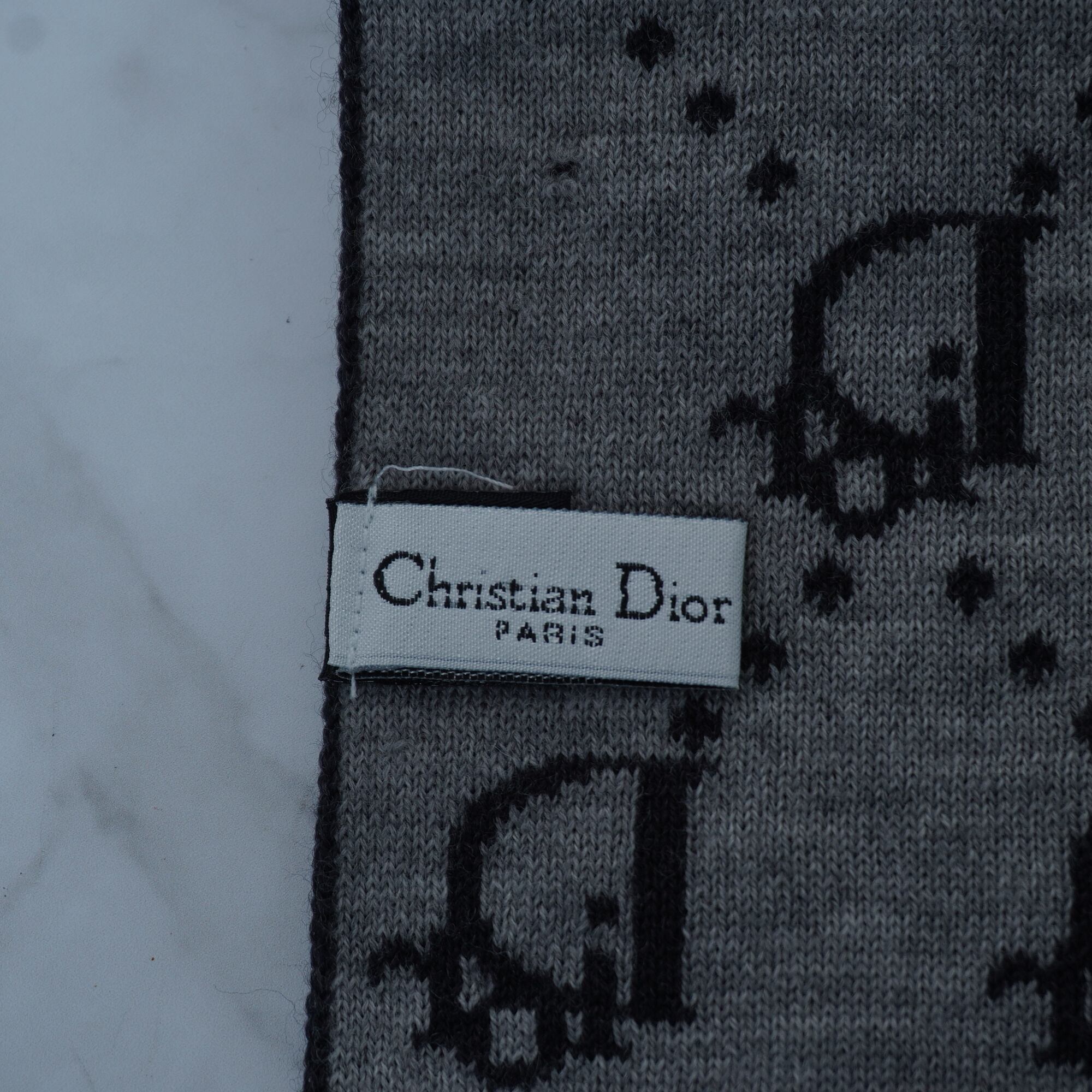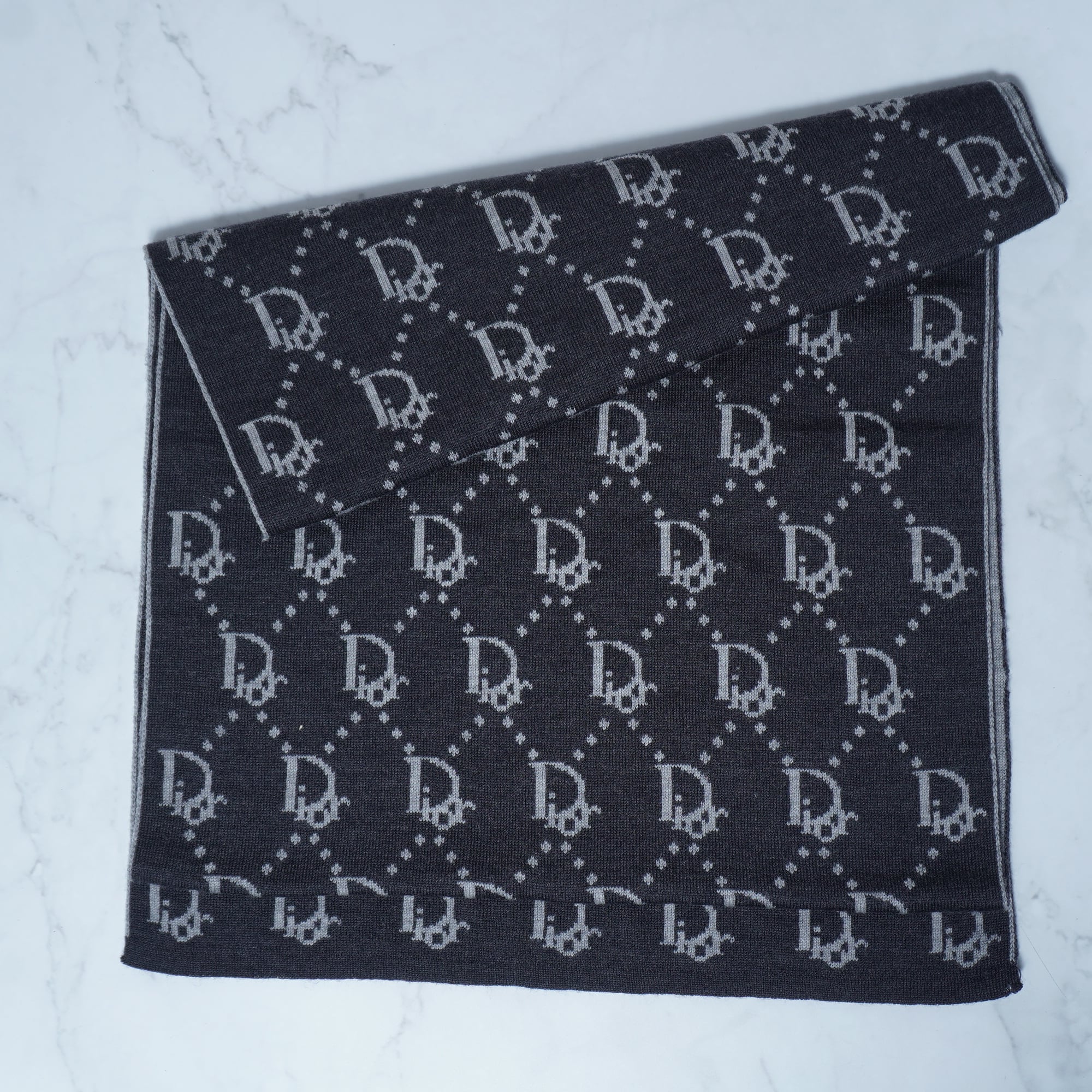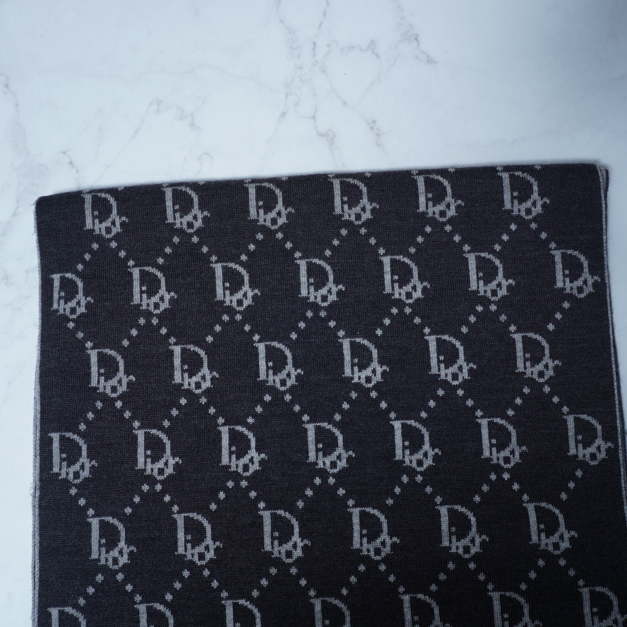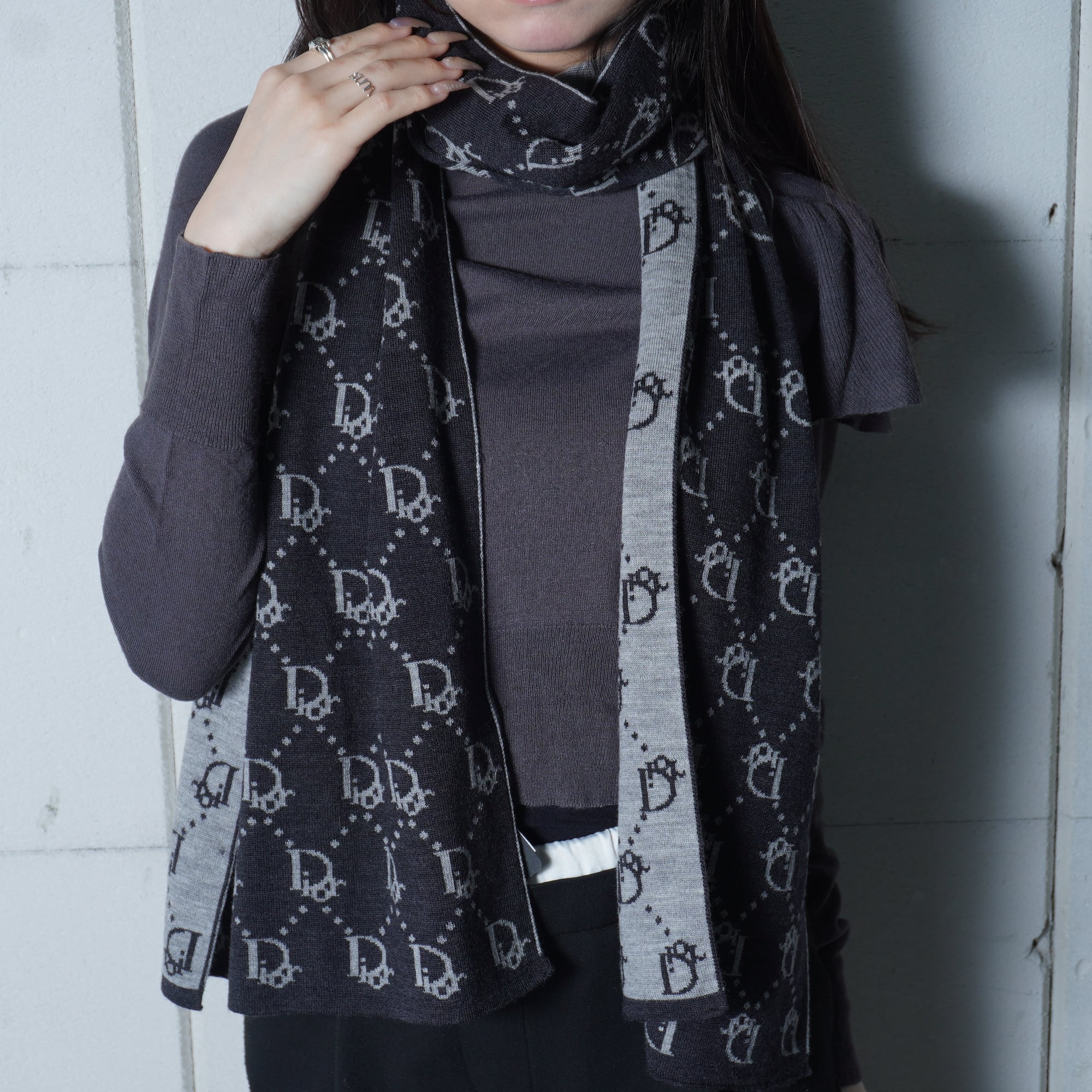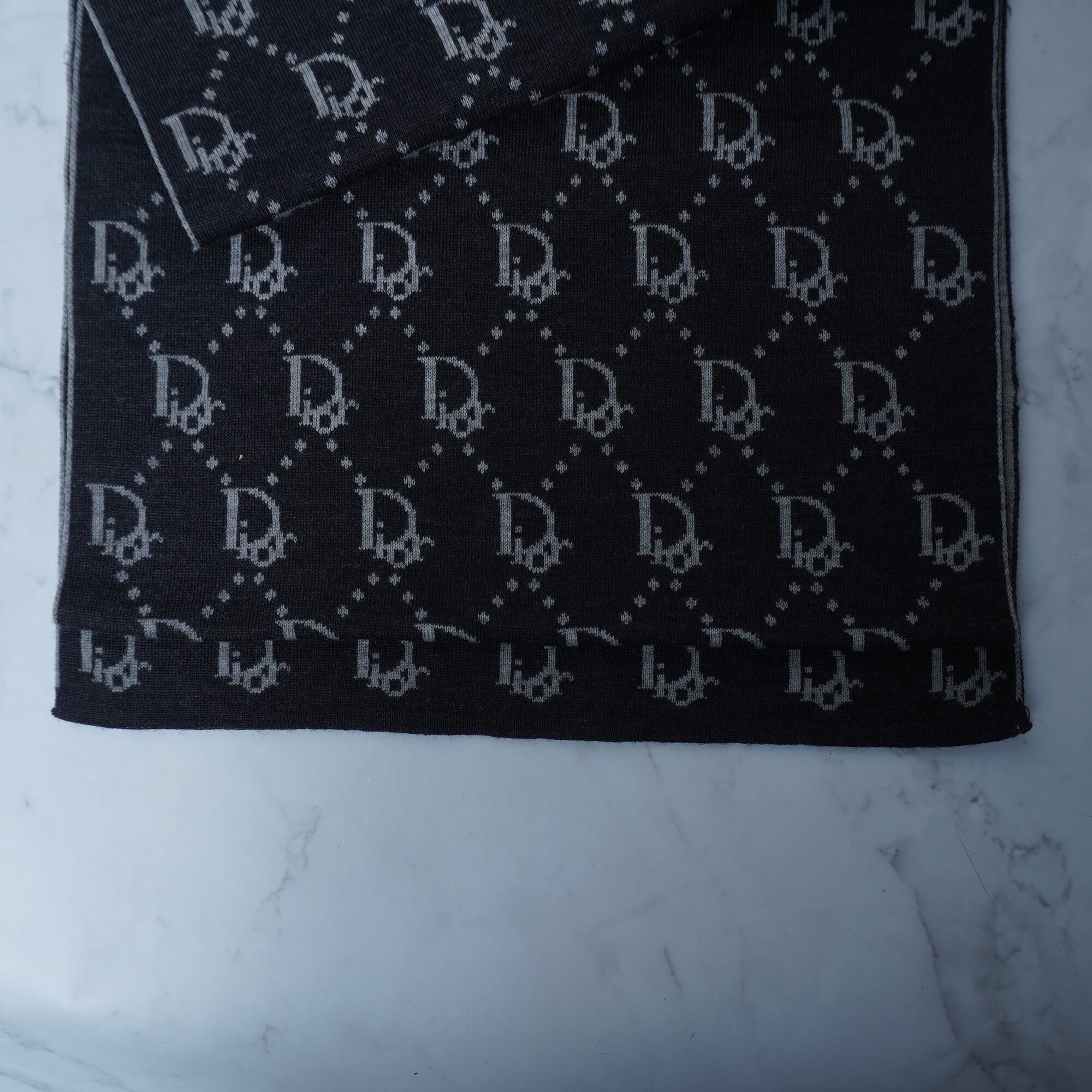 【Christian Dior】クリスチャンディオール WOOL100% トロッター総柄マフラー gray&black